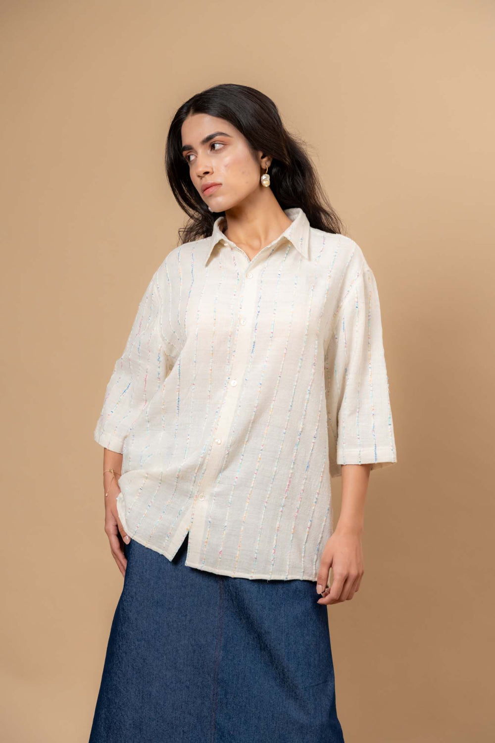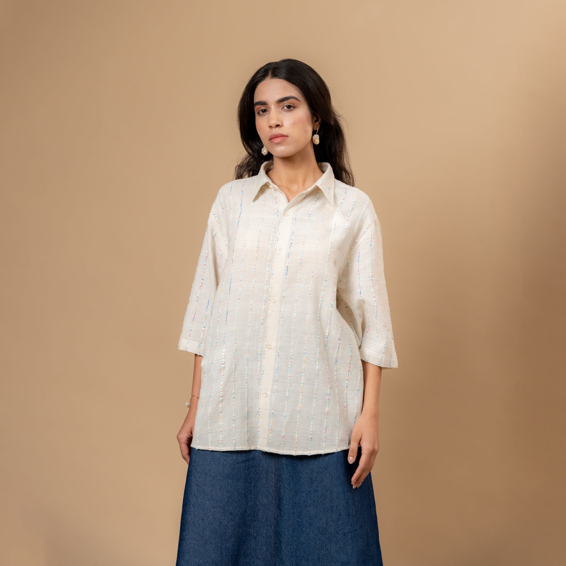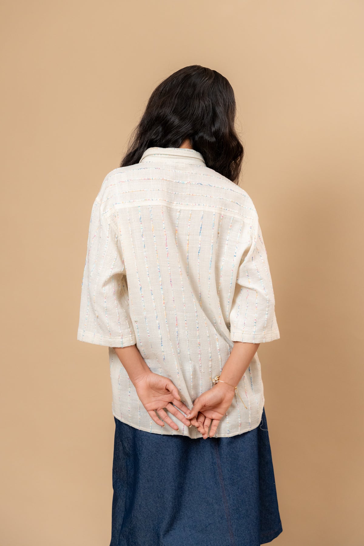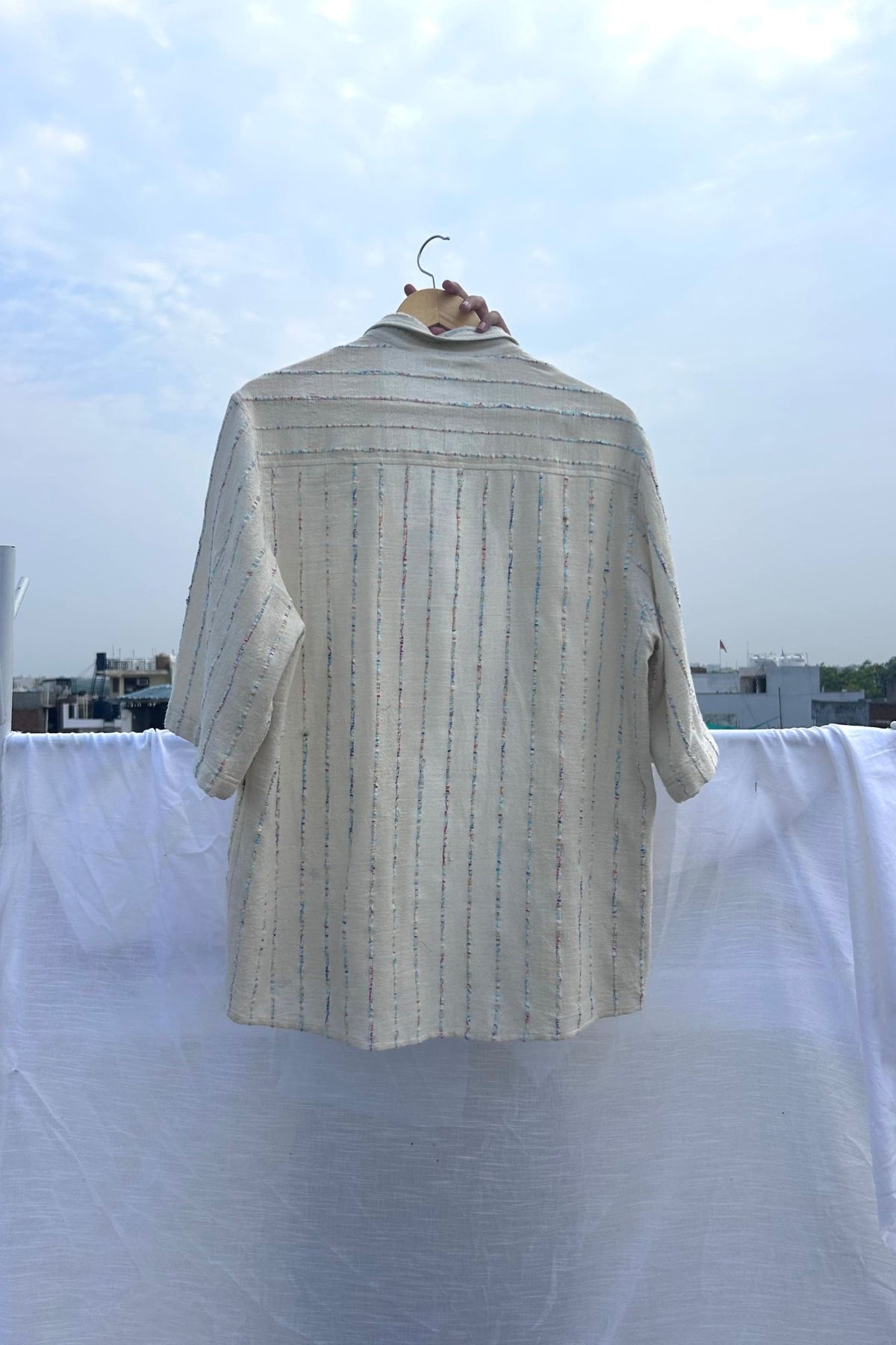 Description: Oversized unisex shirt made from handwoven upcycled fabric, featuring a double collar and human embroidery.