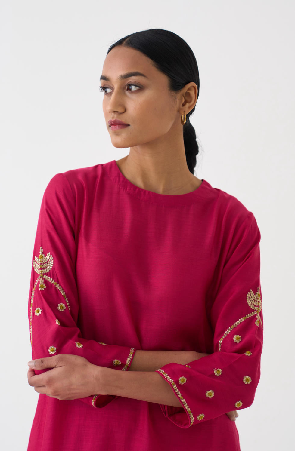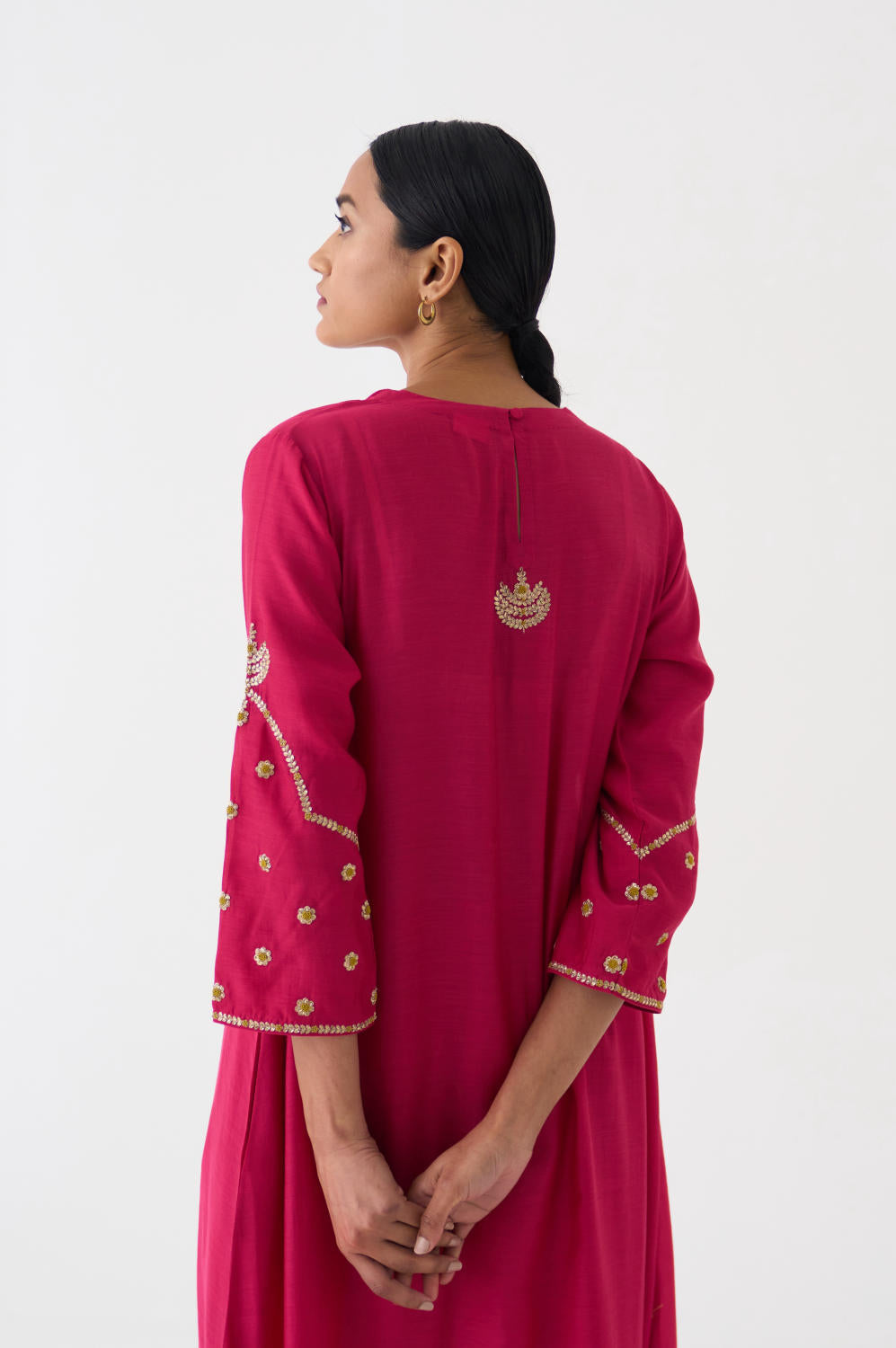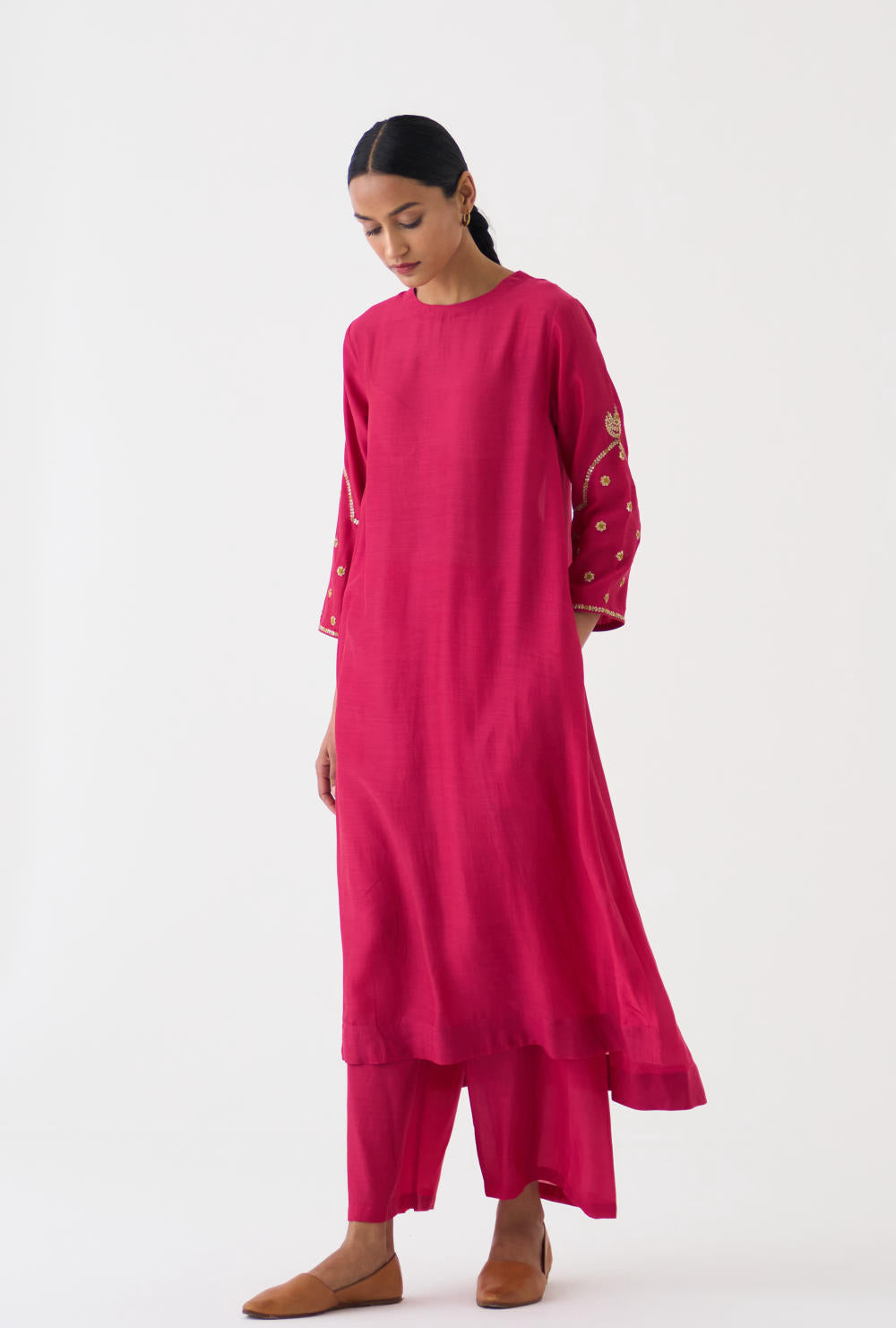 Featuring a Rani Pink kurta in silk base with Zari and Resham work on sleeves. It is paired with matching pants.