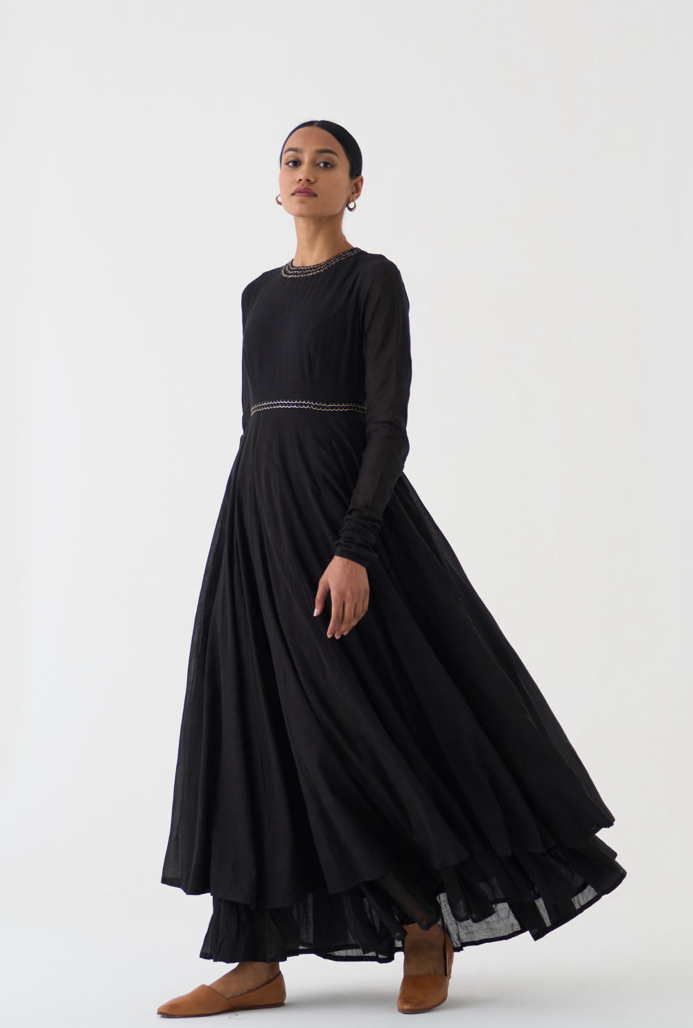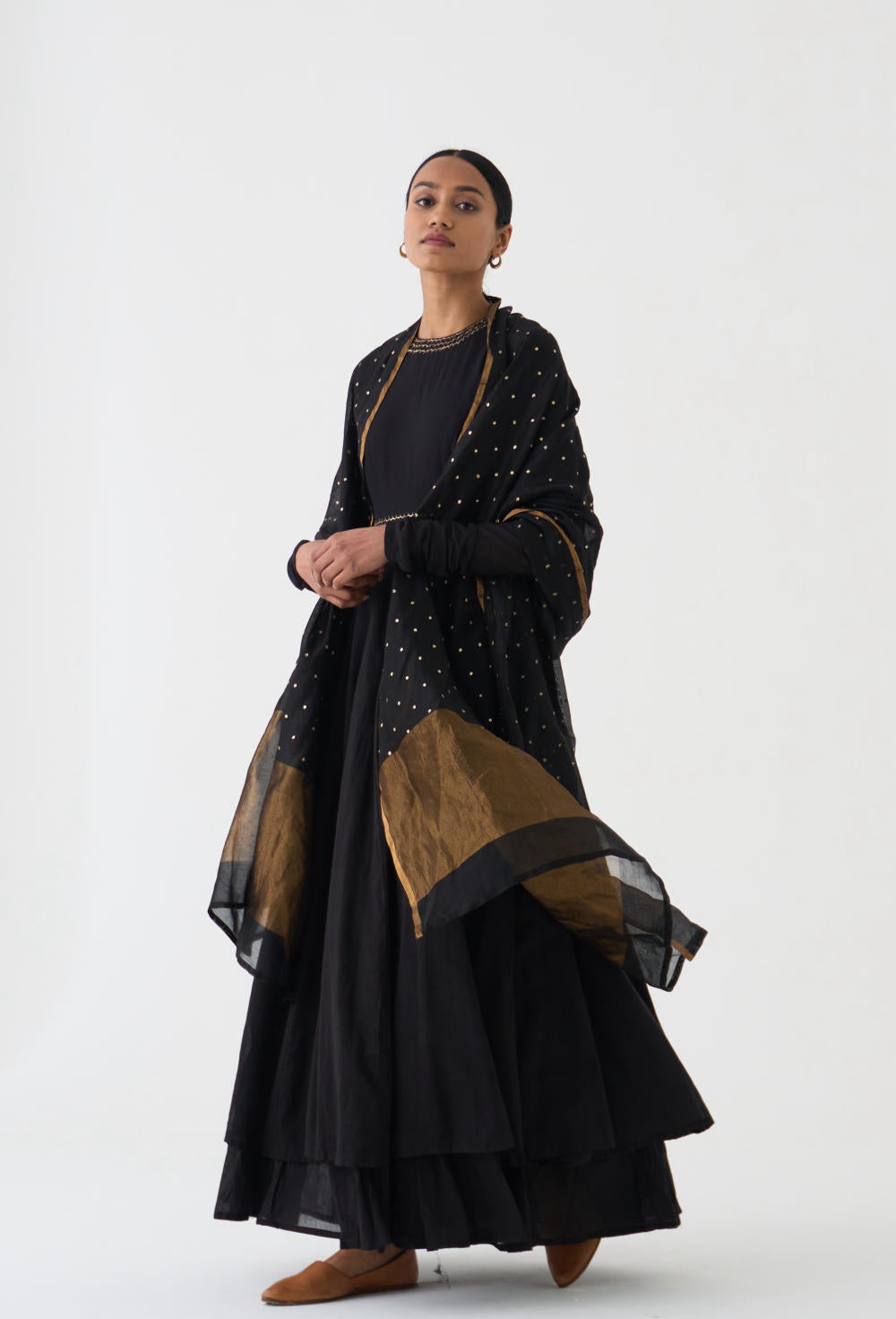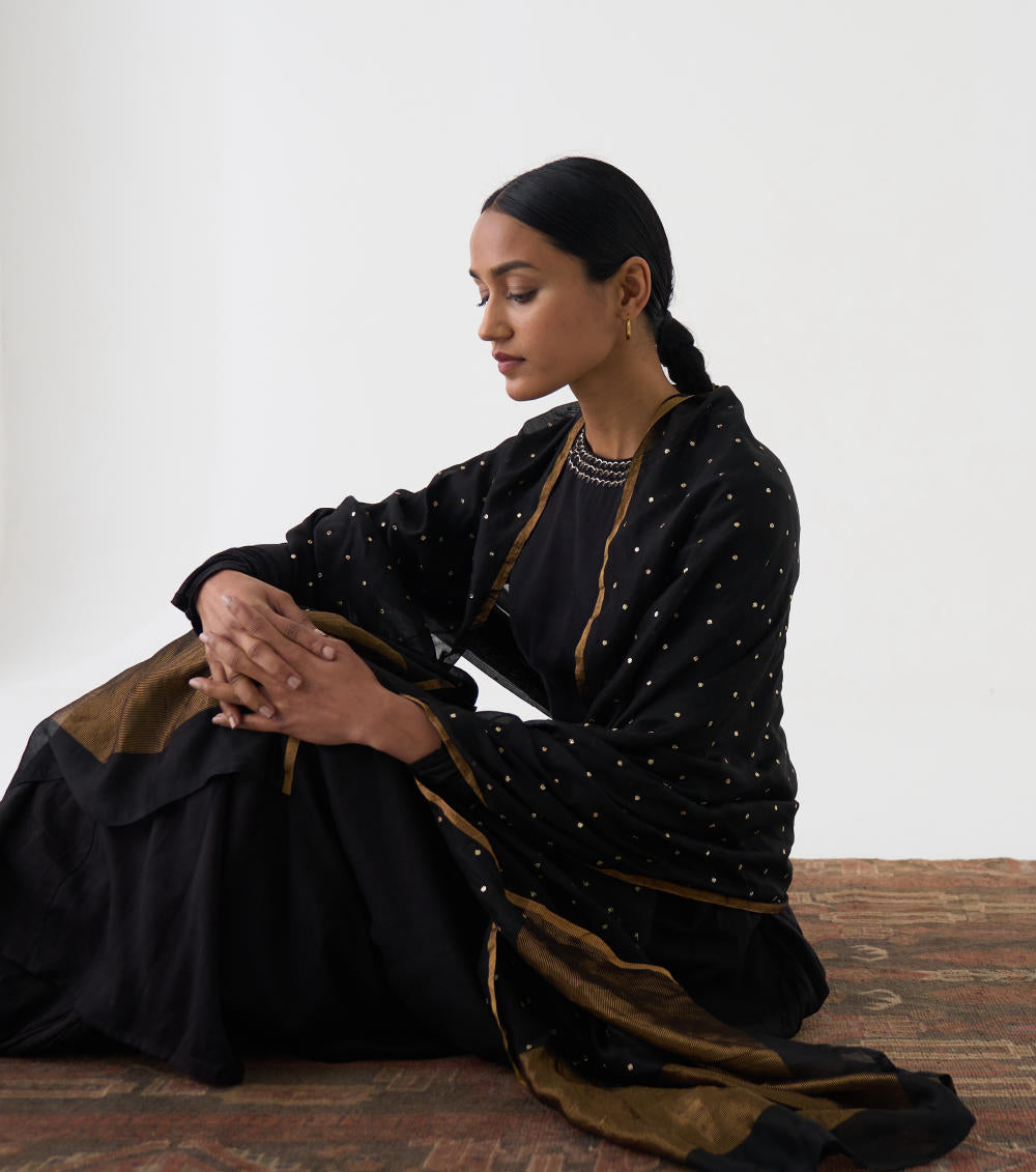 Featuring a Black gathered kurta in cotton base with bel detailing on neckline and waist in fine Resham and paired with a matching dupatta in Chanderi base having pitta embroidery.