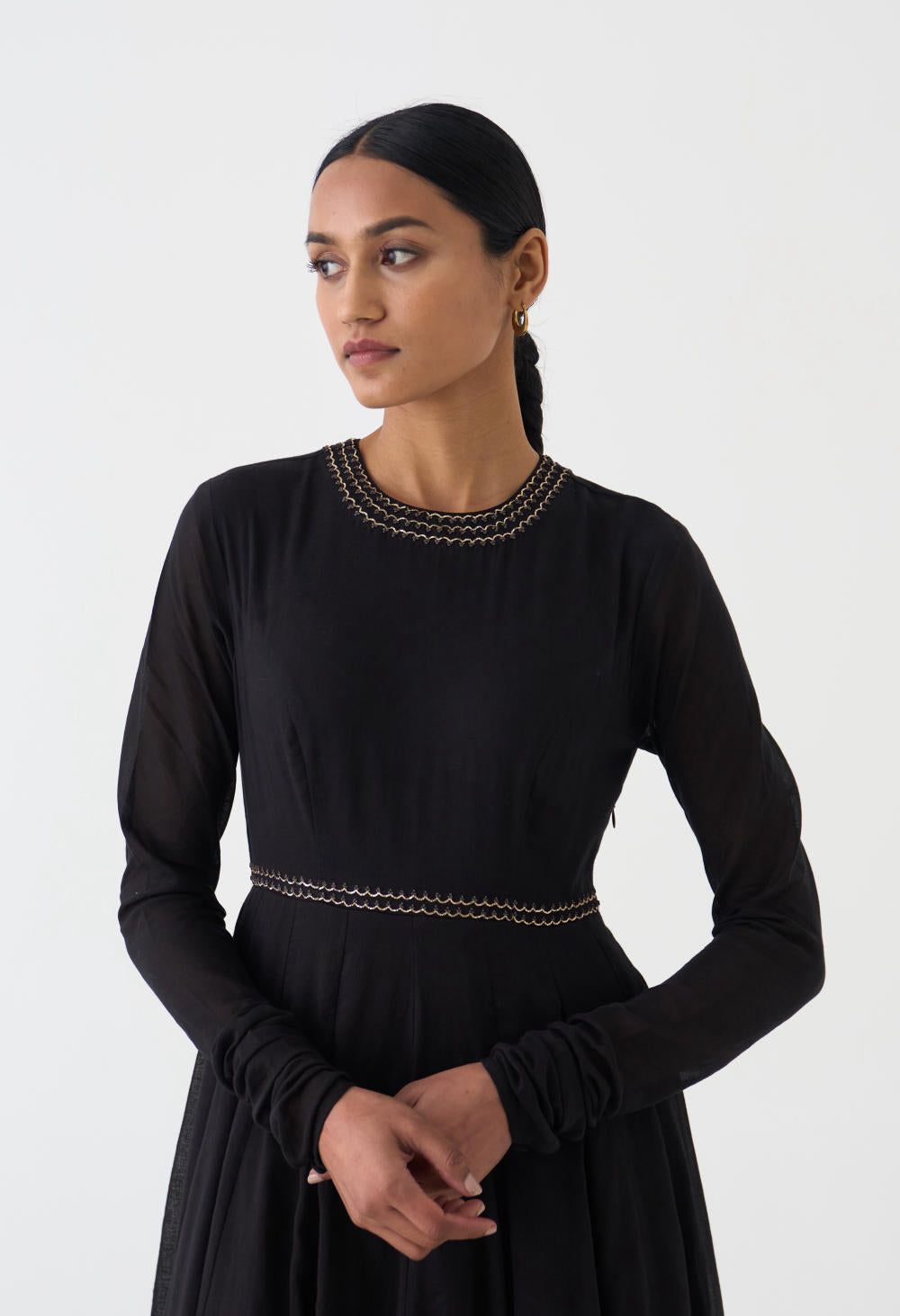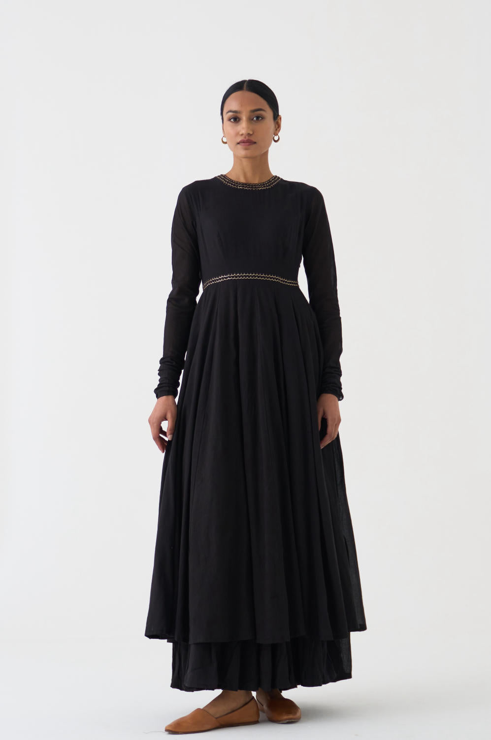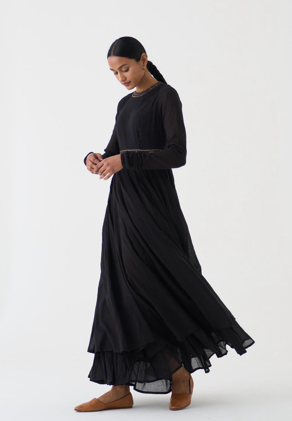 Featuring a Black gathered kurta in cotton base with bel detailing on neckline and waist in fine Resham and paired with a matching dupatta in Chanderi base having pitta embroidery.