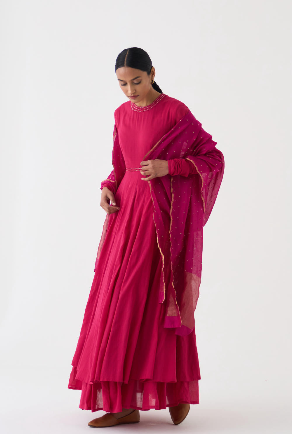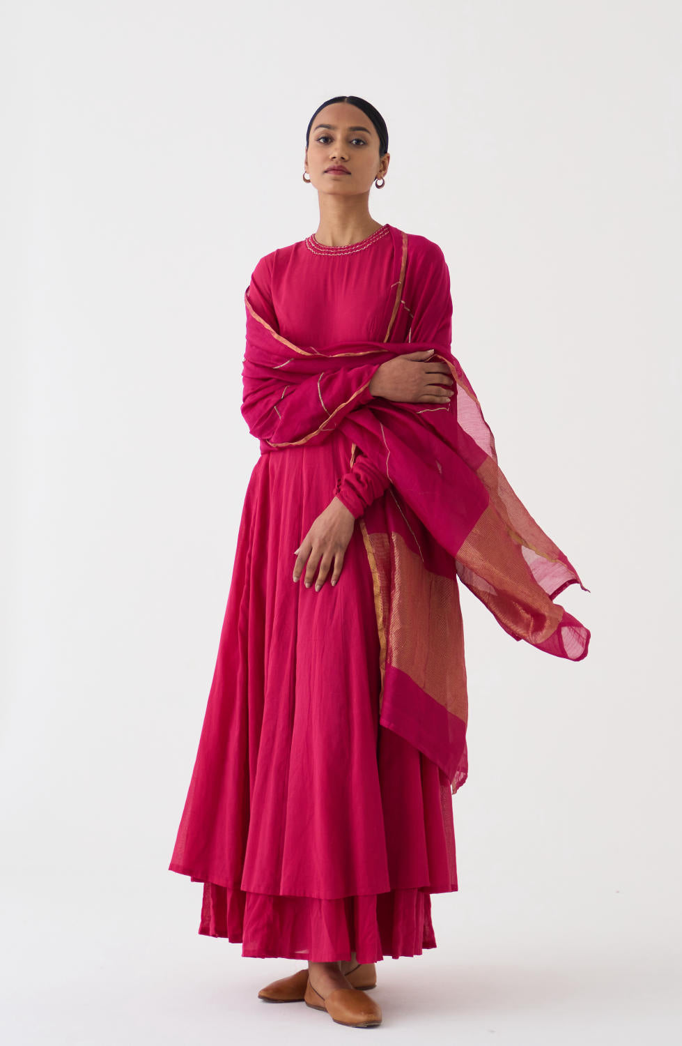 Rani Pink Diagonal Hand Embroidered Chanderi Dupatta with Zari stripped Pallu.