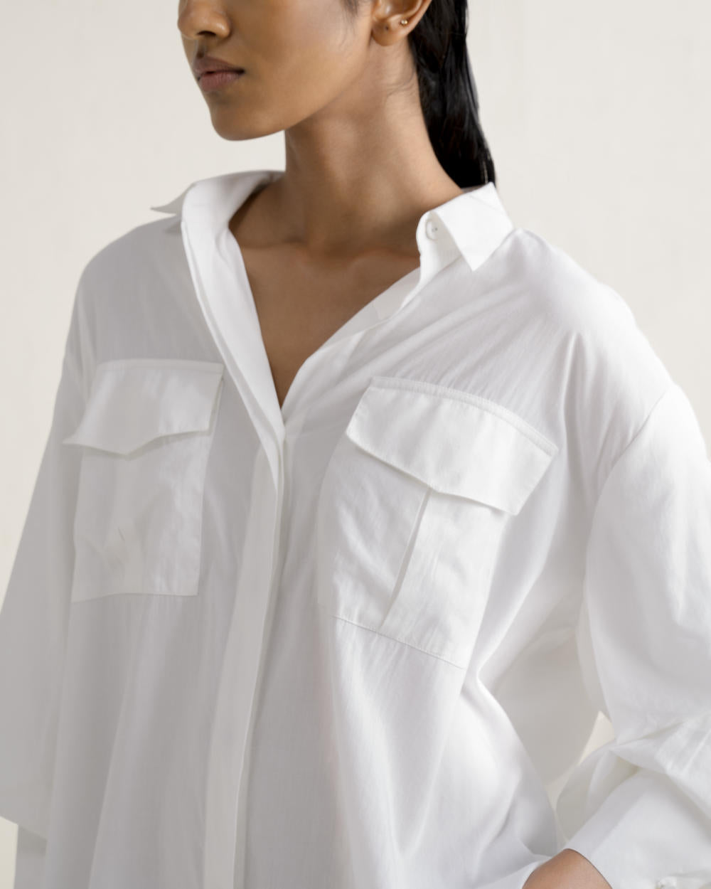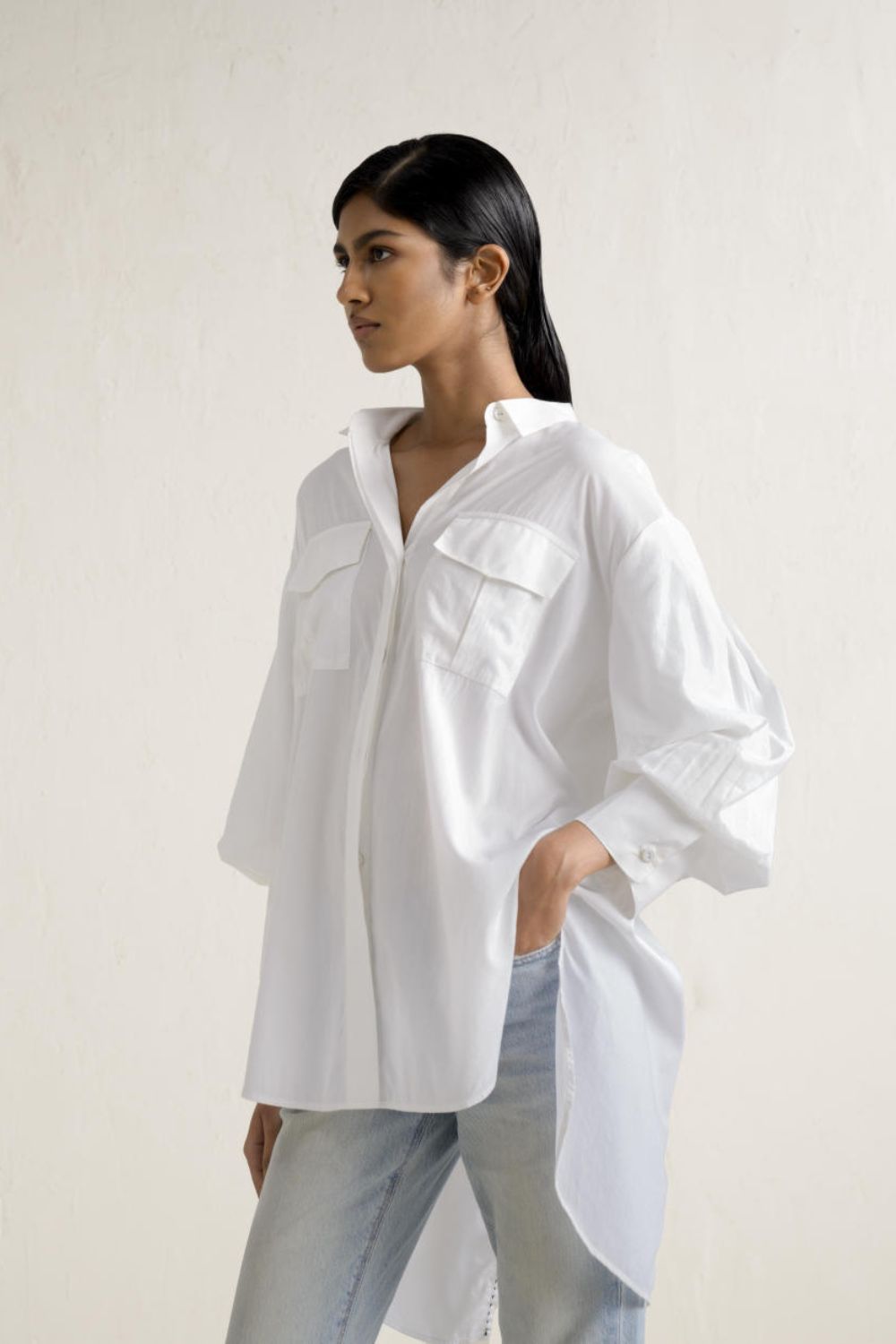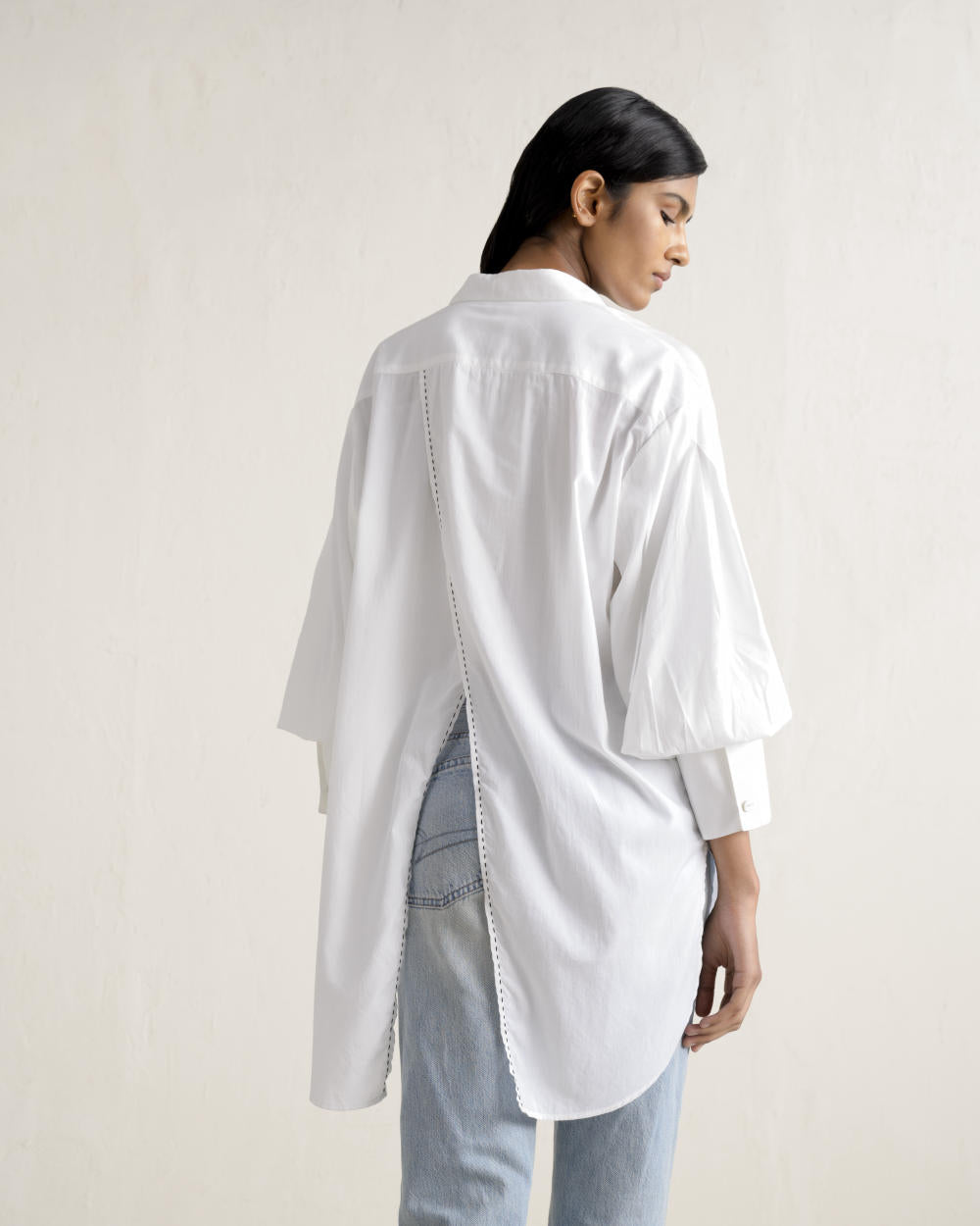 This collared shirt is the ultimate wardrobe staple, designed as the perfect white shirt, featuring gathered sleeves with elongated cuffs and a back cross slit. Crafted from crisp cotton poplin for everyday luxury.