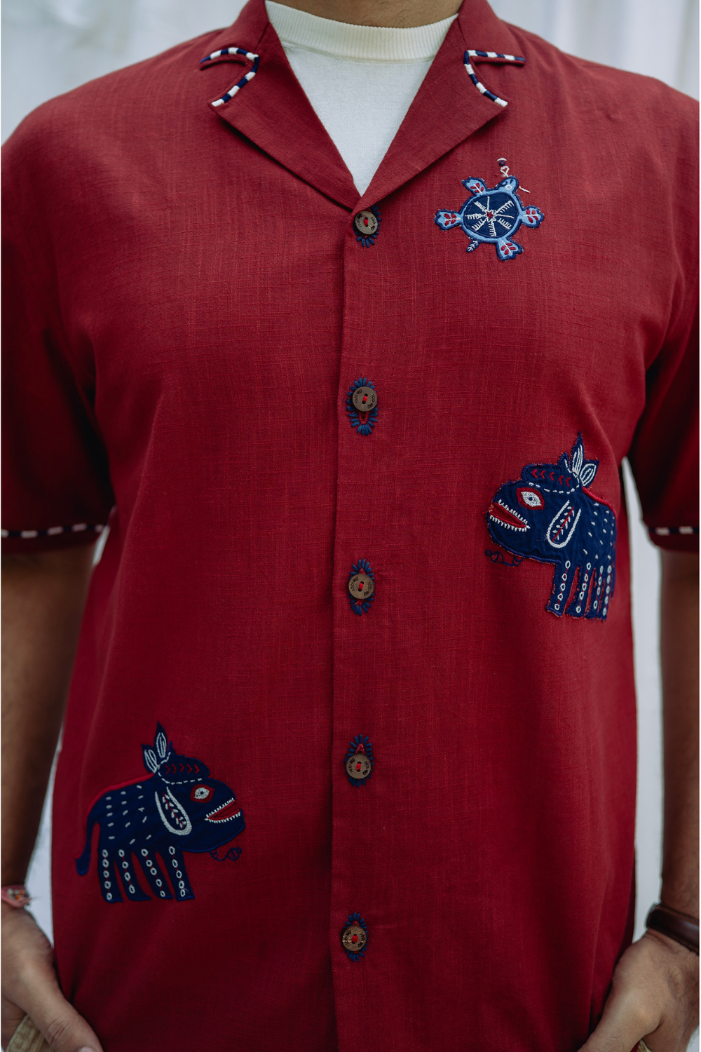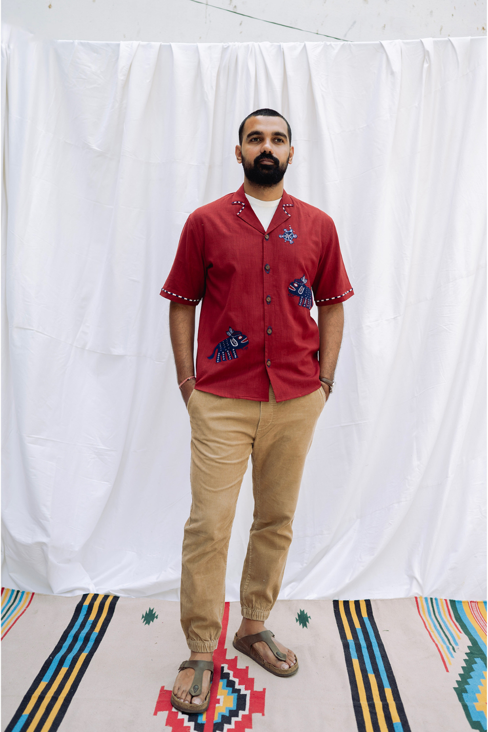Laid-back fit with playful details. This open-collar, button-down shirt is made from soft, dyed cotton slub and features crafty animal embroidery on both panels—because who doesn’t love a little character in their closet?Open collar button closure relaxed fit shirt with applique embroidery on both the panels.