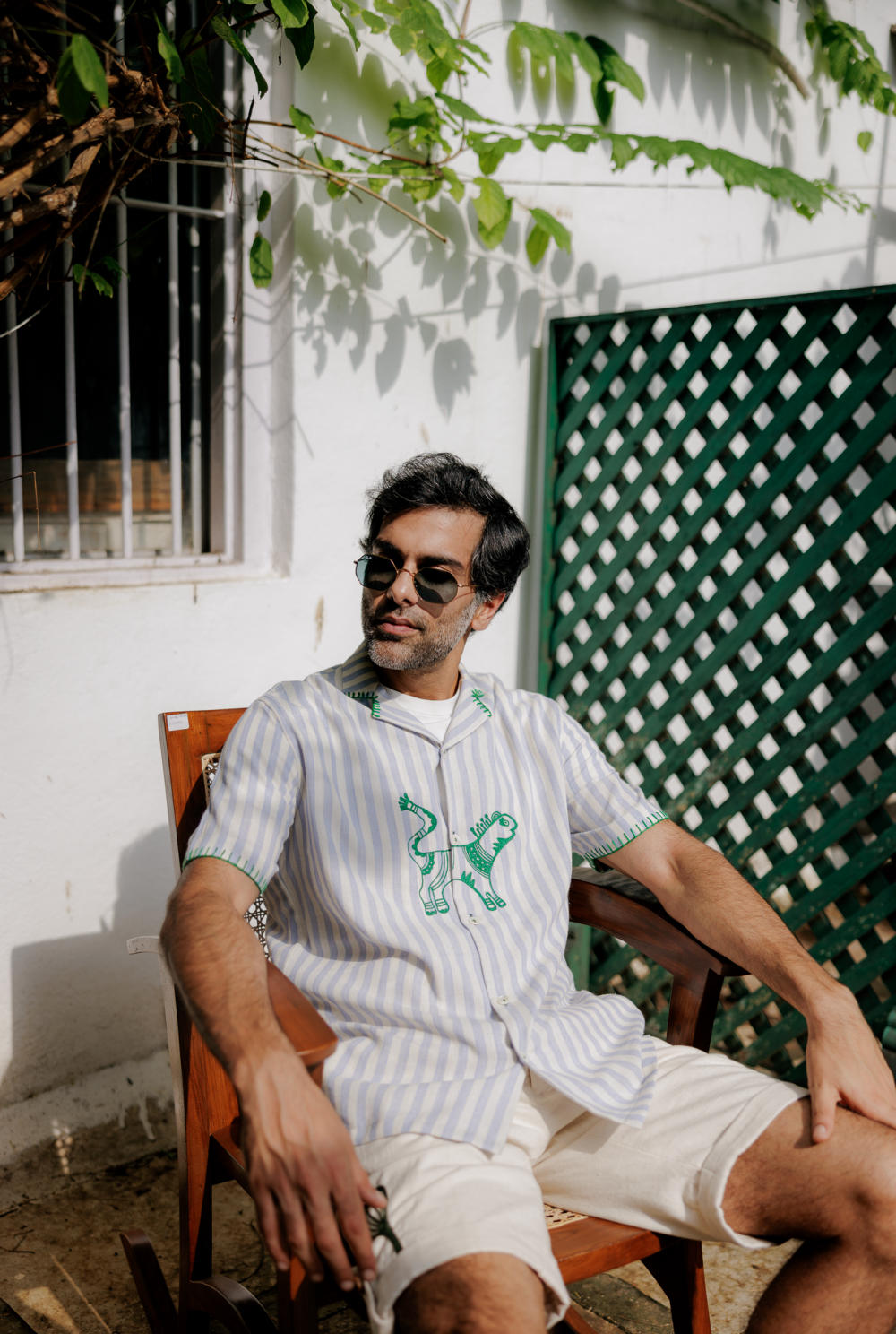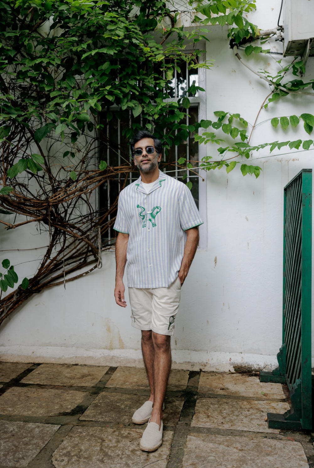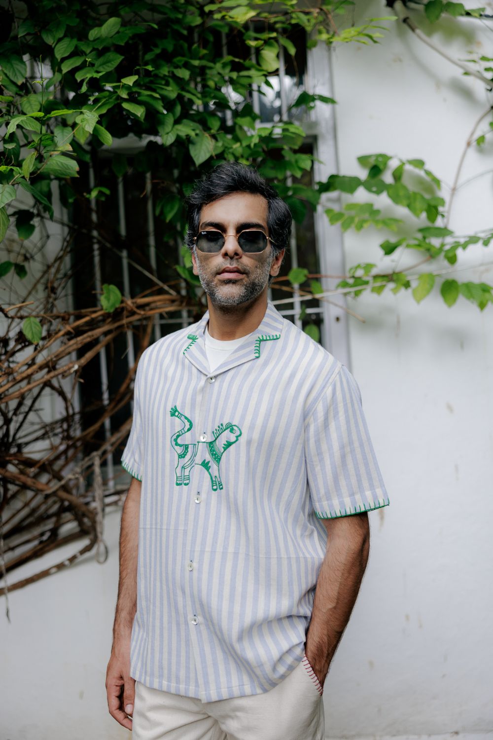 Crafted in handloom fabric, this blue and white striped shirt is sure to catch eyes with its machine-embroidered motif inspired by tribal art and details like the blanket stitch at the collar notch and sleeve hem, and mother-of-pearl buttons.