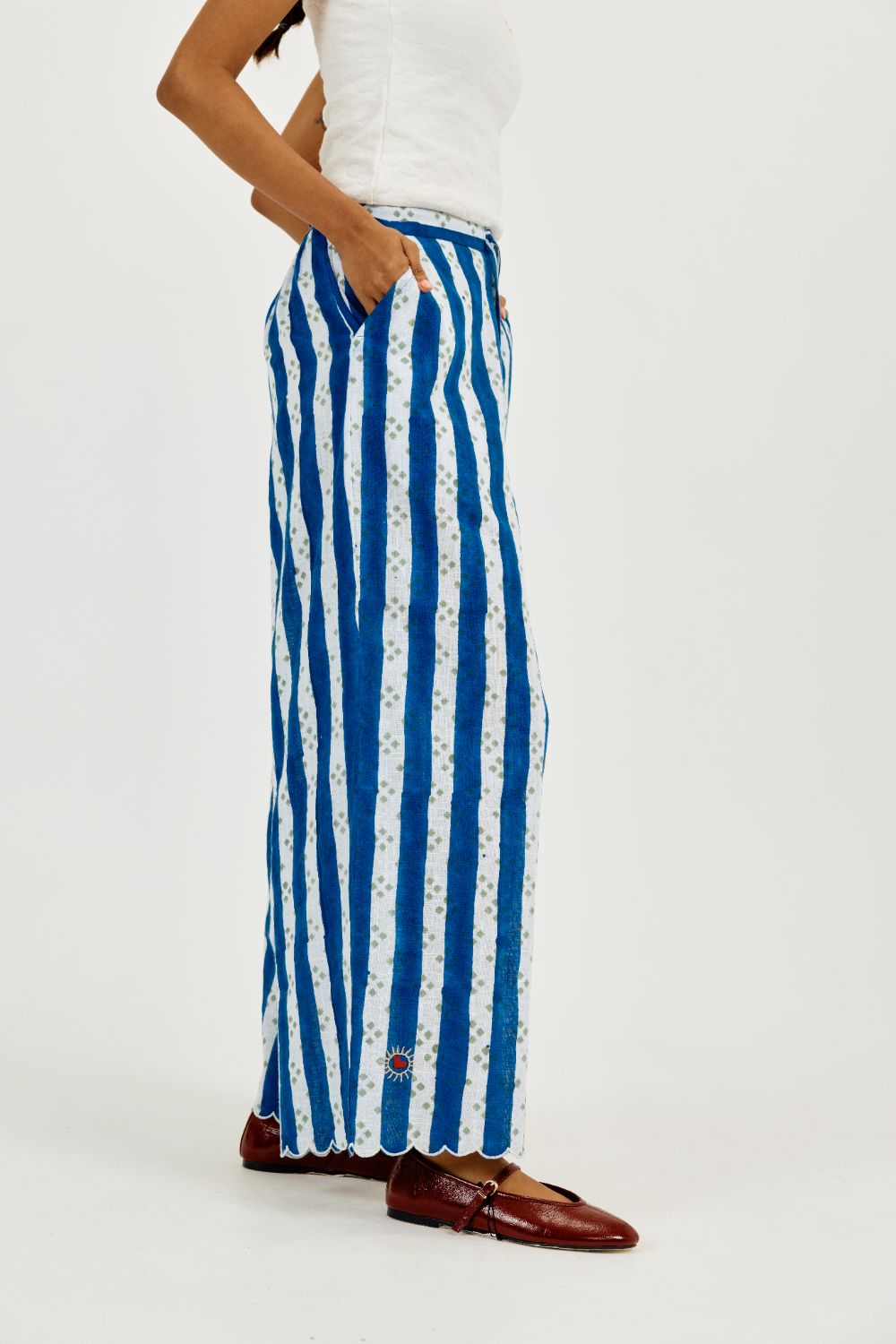 Breezy, bold, and block-printed, these wide-leg cotton pants are your easy answer to summer. Handcrafted in vibrant blue stripes with a floral heart embroidery twist, they feature a comfy drawstring waist and scalloped hem for that extra flair. Pair it with literally everything because stripes are always in season.