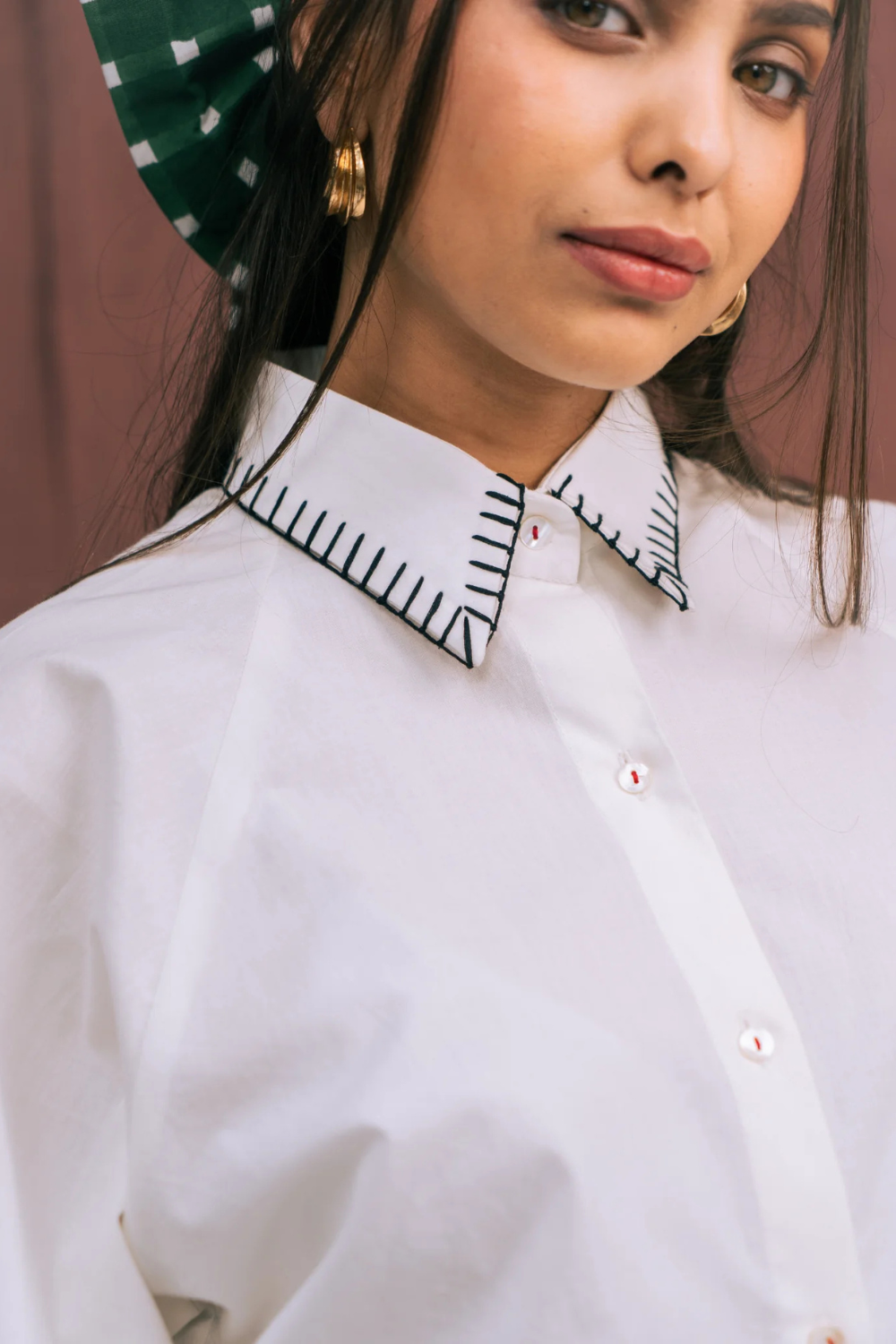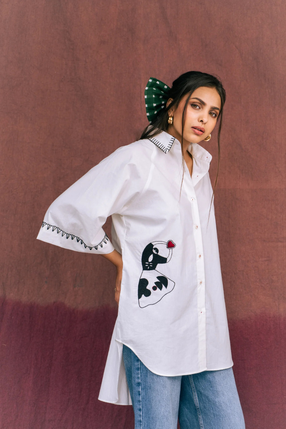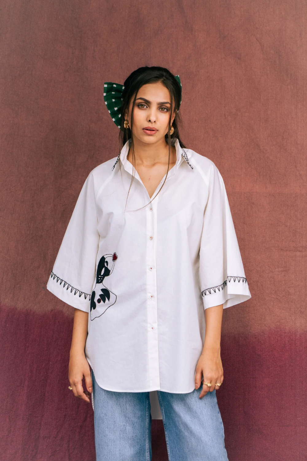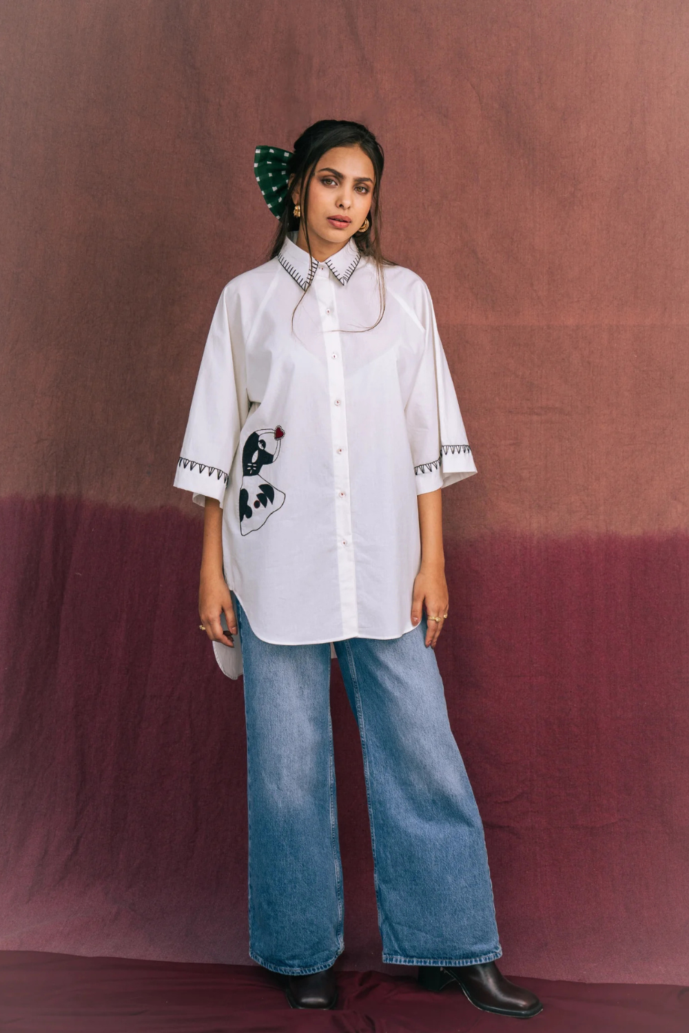 Made from soft cotton this oversized shirt keeps it relaxed yet interesting. With hand embroidery on the sleeve and collar, plus a cool embroidered motif on the right, it’s the kind of piece you’ll want to wear all the time.