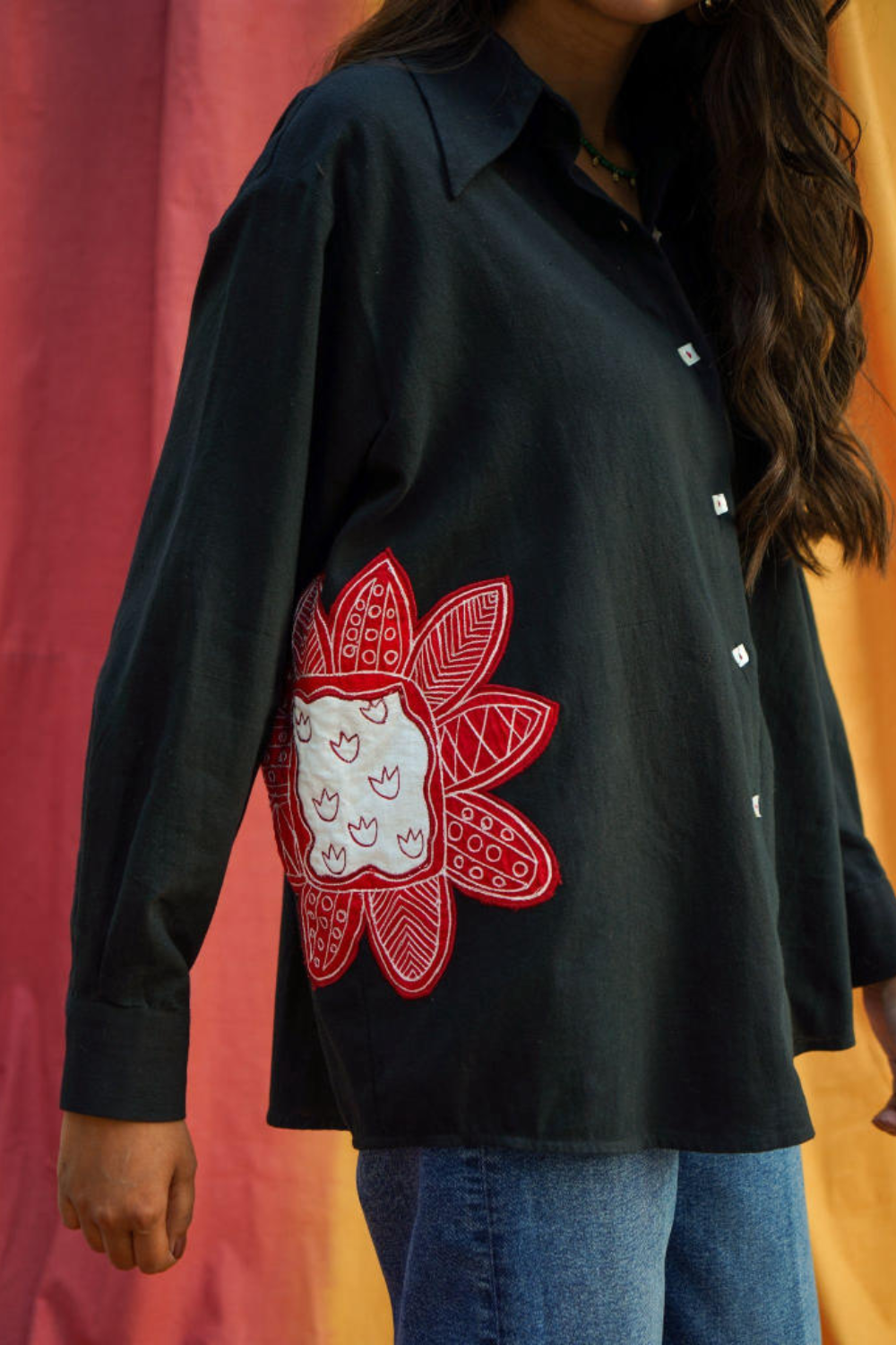 Our version of a black shirt comes embellished with a bold hand embroidered applique flower. Crafted in handwoven cotton this oversized shirt features a back loop detail and a longer than usual hem - leave it loose or tuck it into shorts or tailoring.