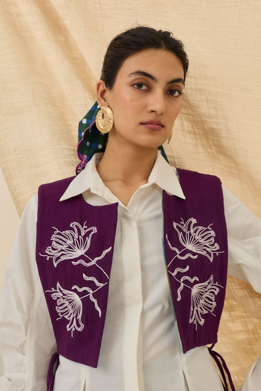 A vibrant layering piece crafted from handwoven Kala cotton. This cropped bib features an open front with side tie-up closures for an adjustable fit. Highlighted with striking white hand embroidery of intricate floral motifs, it pairs beautifully over shirts or dresses for an elevated, artisanal look.