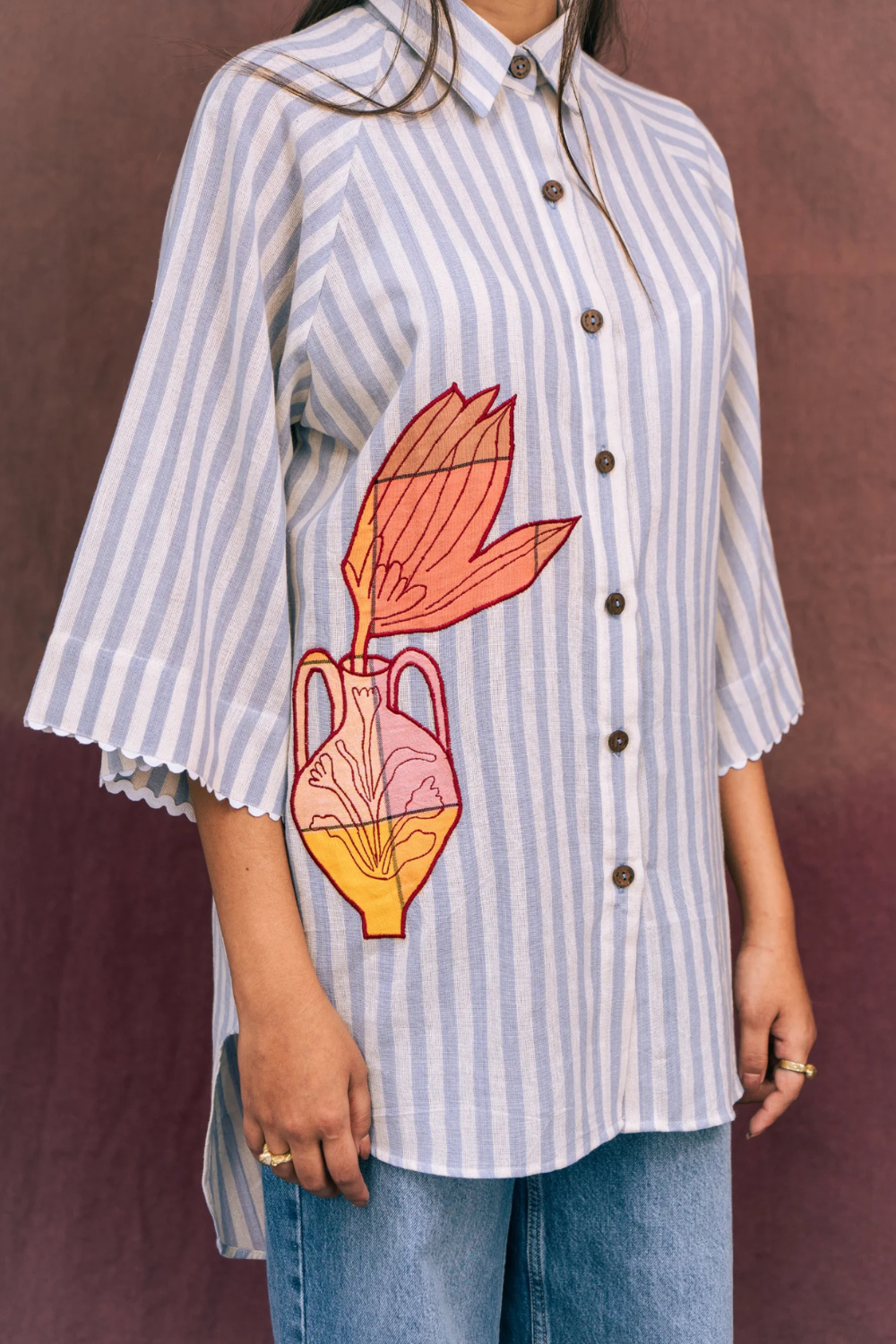Made from handloom cotton, this oversized shirt keeps it relaxed yet interesting. With a rick rack detail on the sleeve and a cool applique motif on the left, it’s the kind of piece you’ll want to wear all the time.