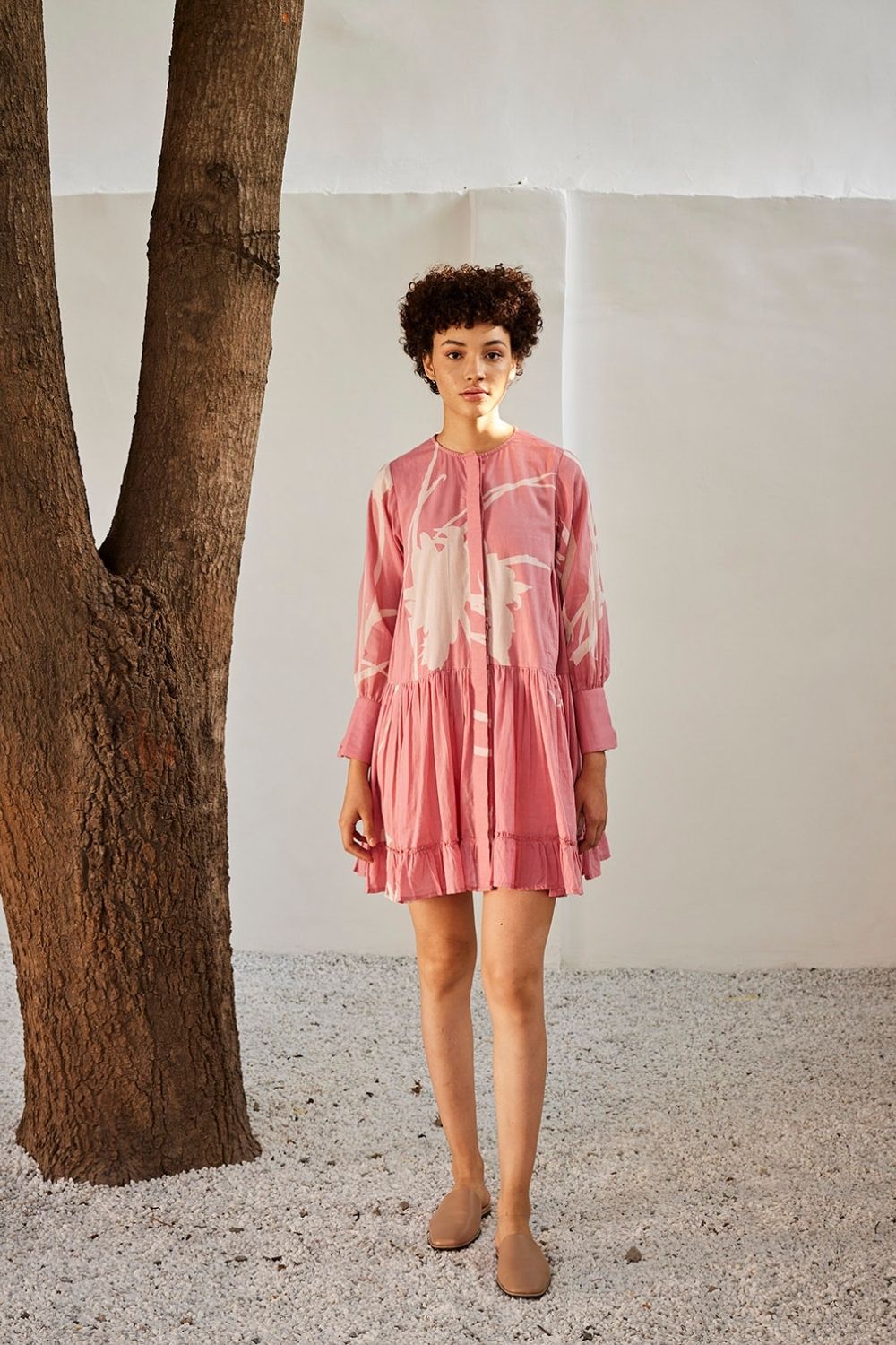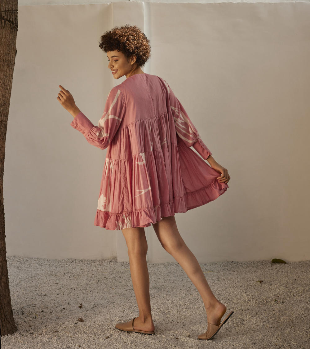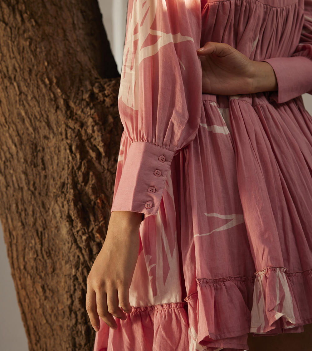 A pale pink mulmul short dress with long cuffed sleeves and a frilled hem. Cut in our lino print fabric and comes completely lined with an invisible placket at front.