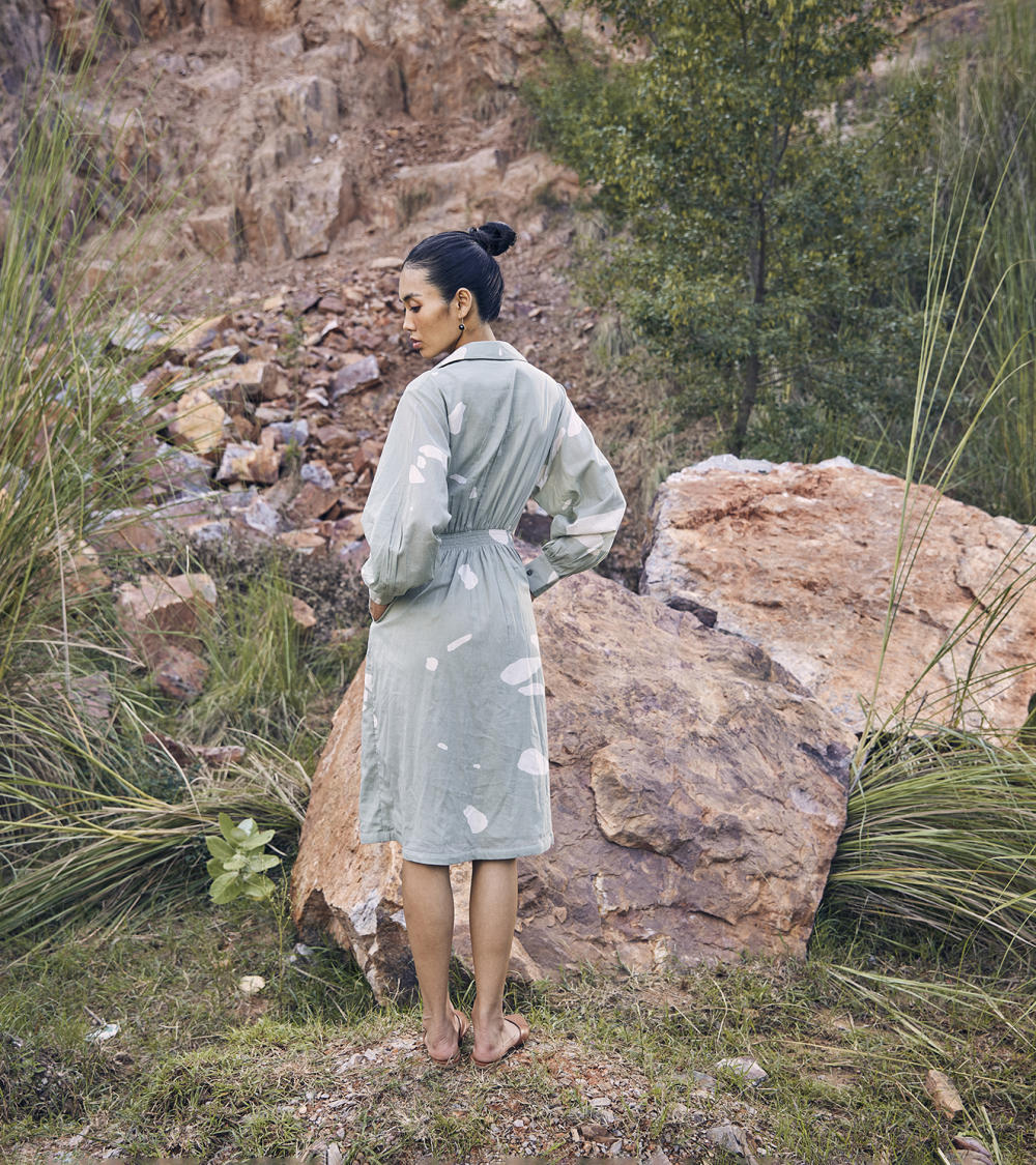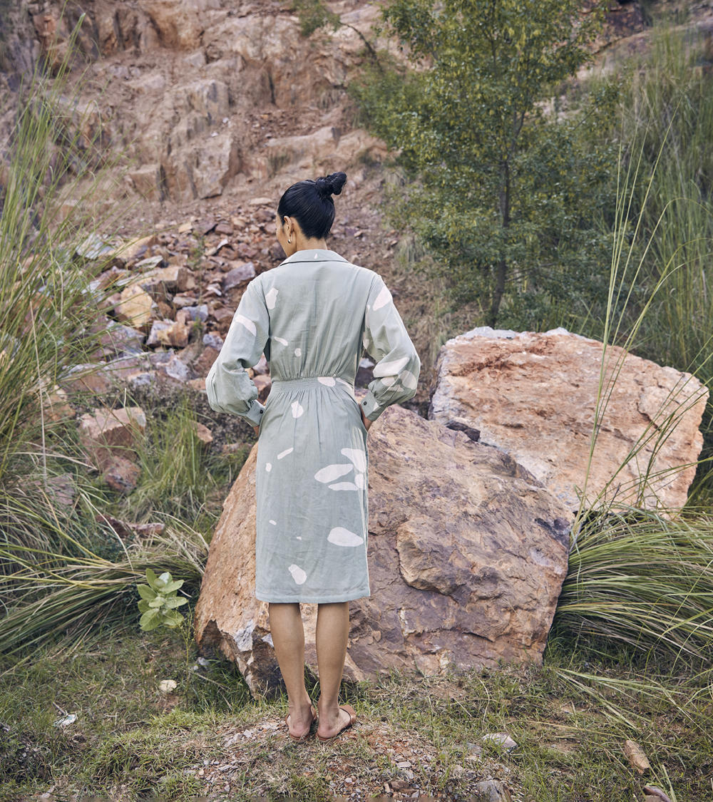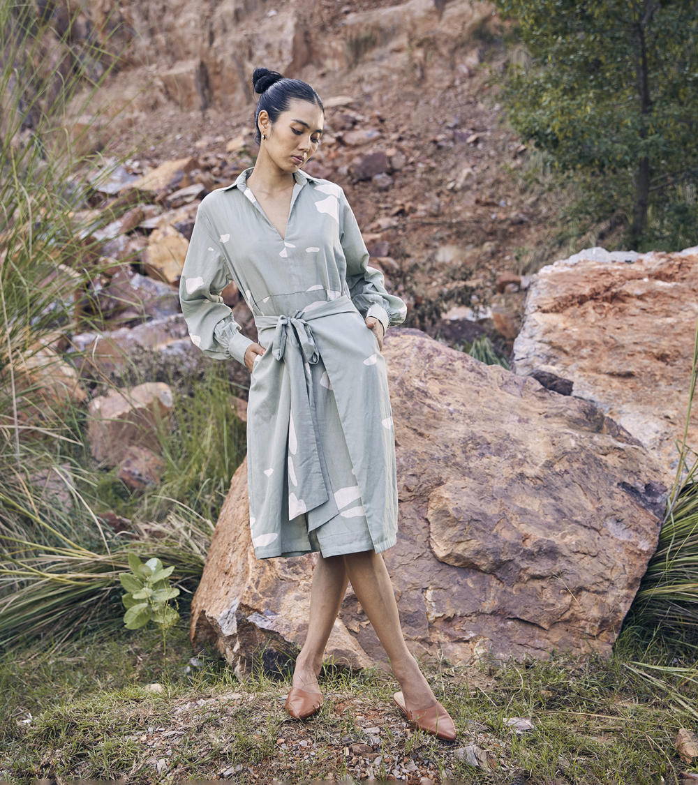 A mosiac print shirt collar dress with tie up front flaps, cuffed full sleeve, side seam pockets and a gathered back.