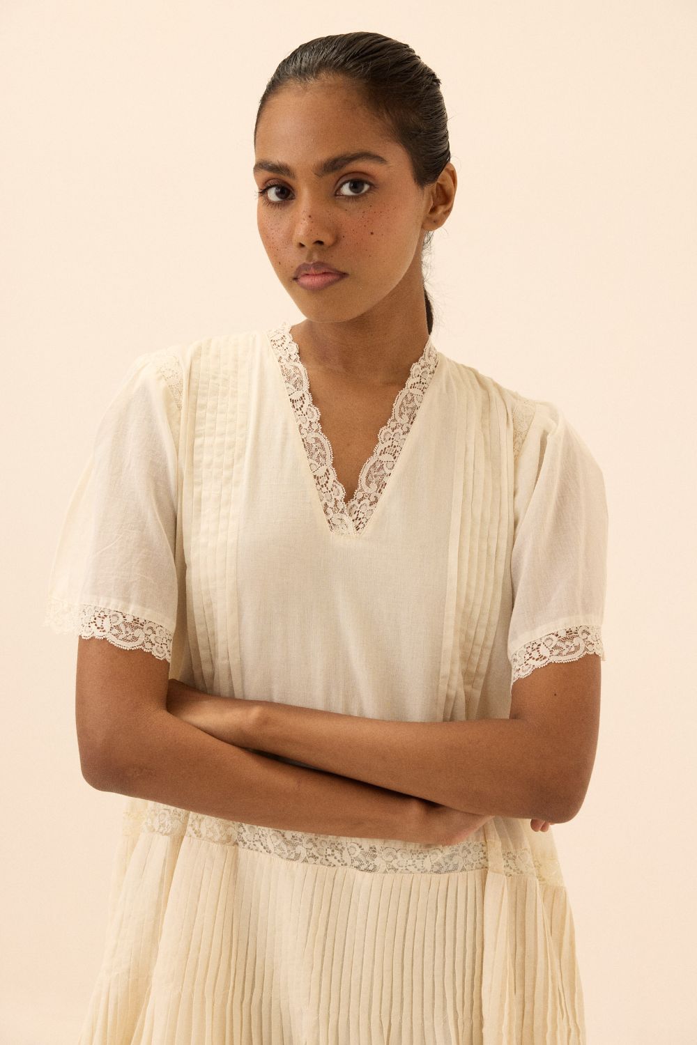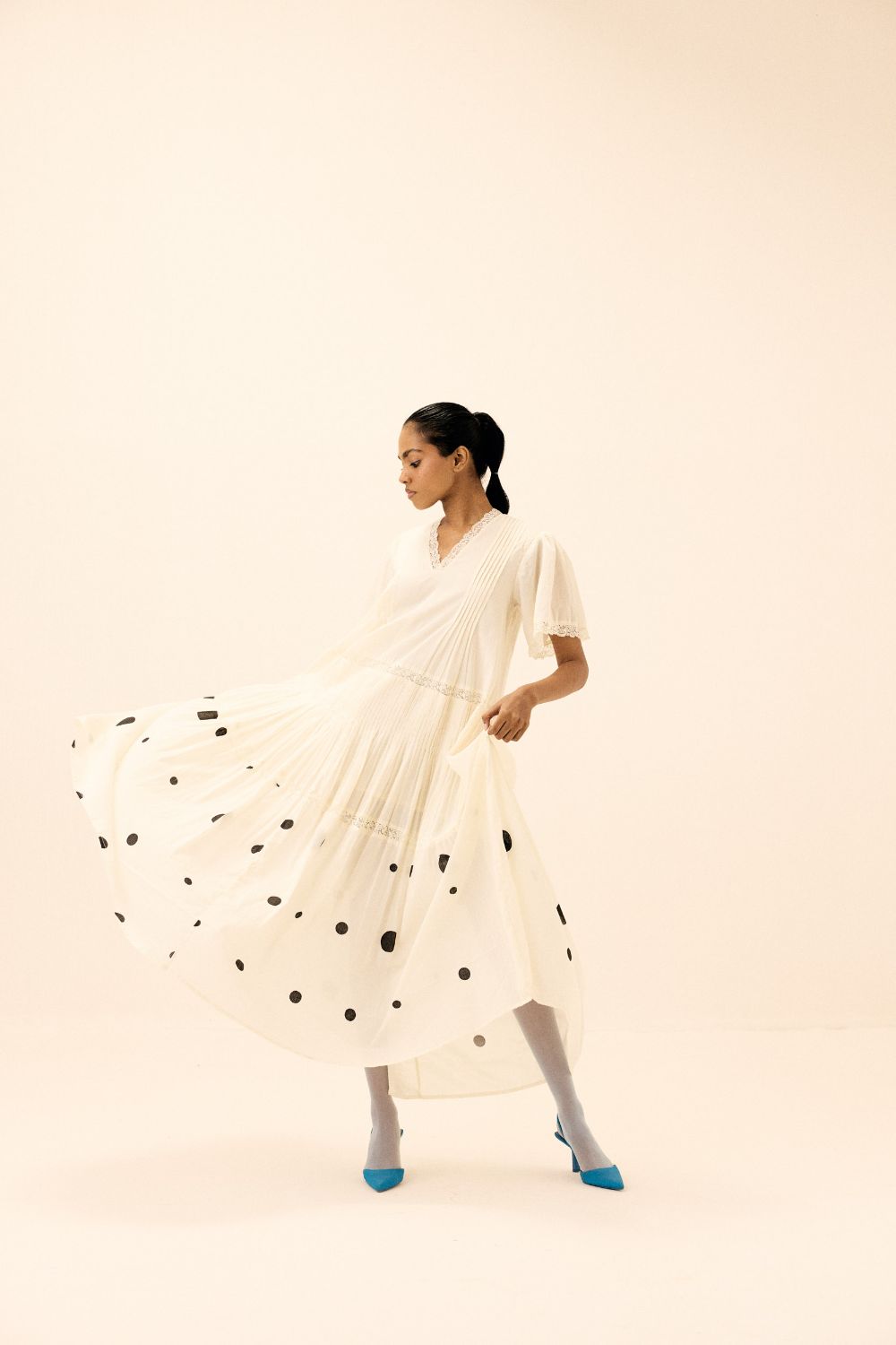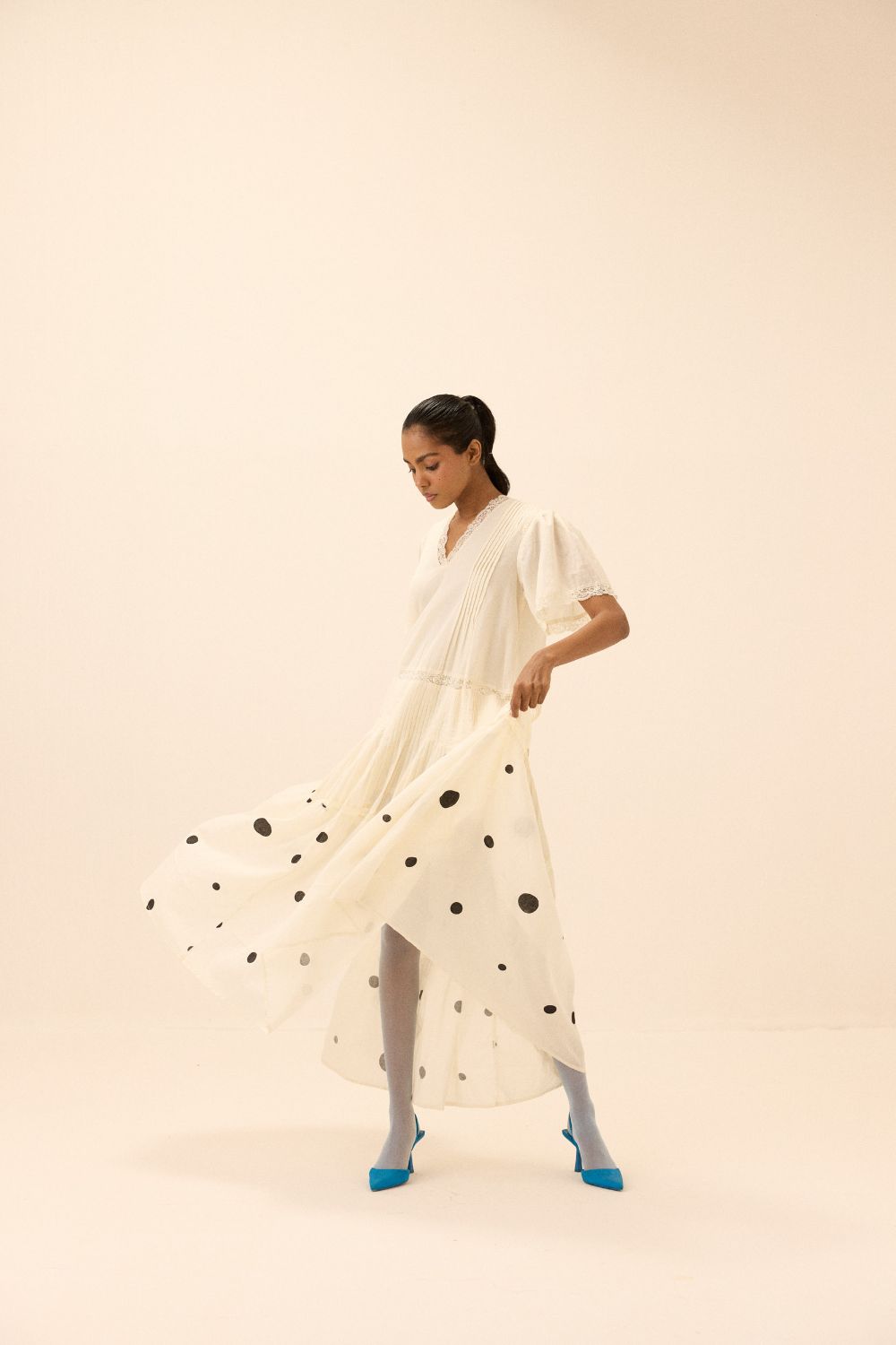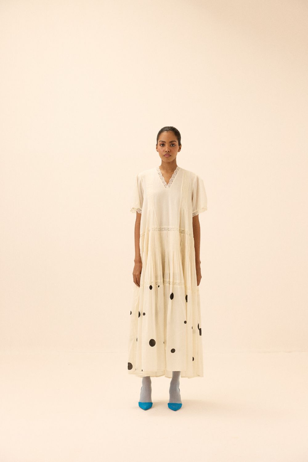 This mul fabric dress combines vintage charm with contemporary style, featuring delicate lace details and bold black polka dots at the hem. The V-neckline and relaxed, flowing silhouette make it an elegant yet comfortable choice, perfect for casual outings or laid-back events.