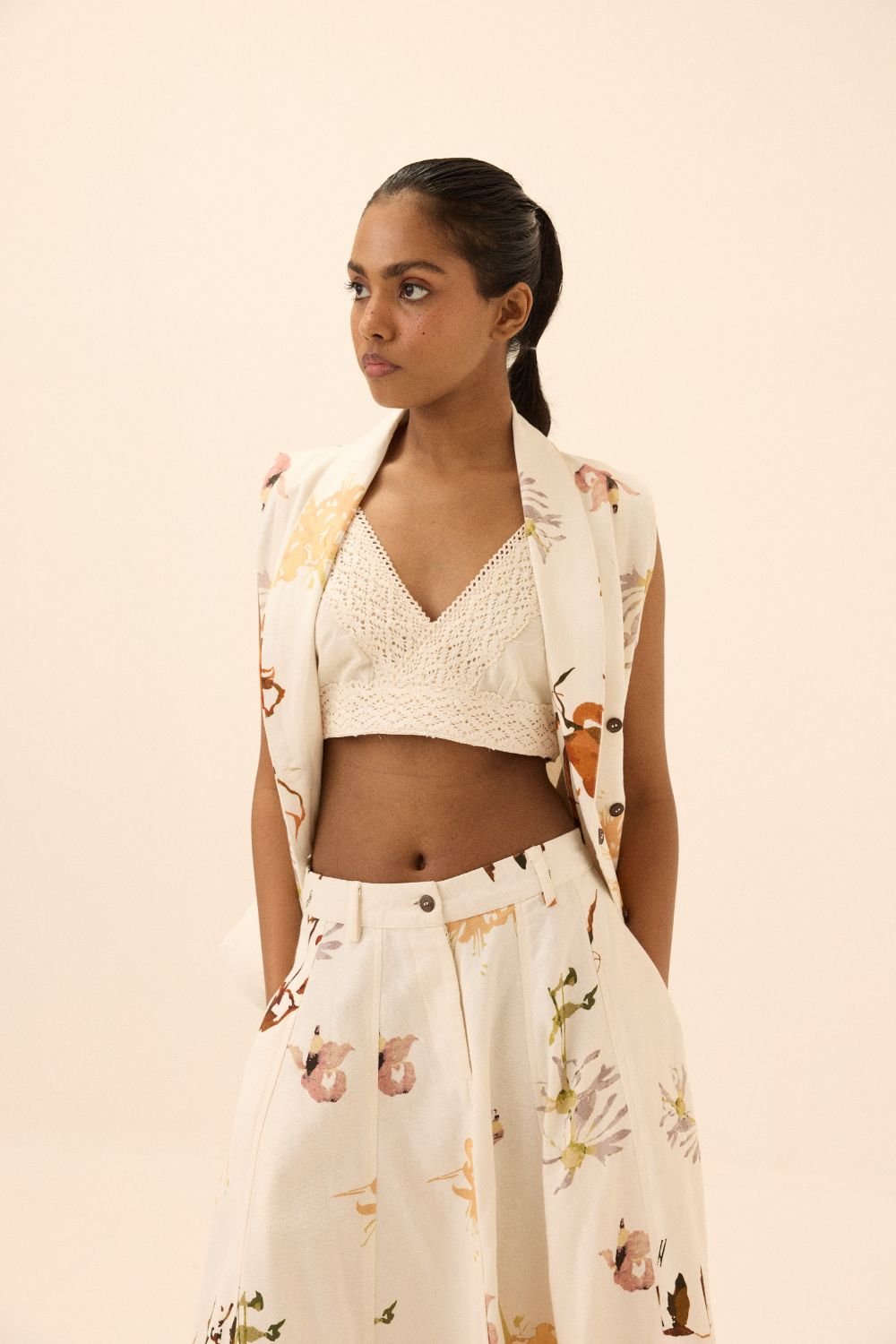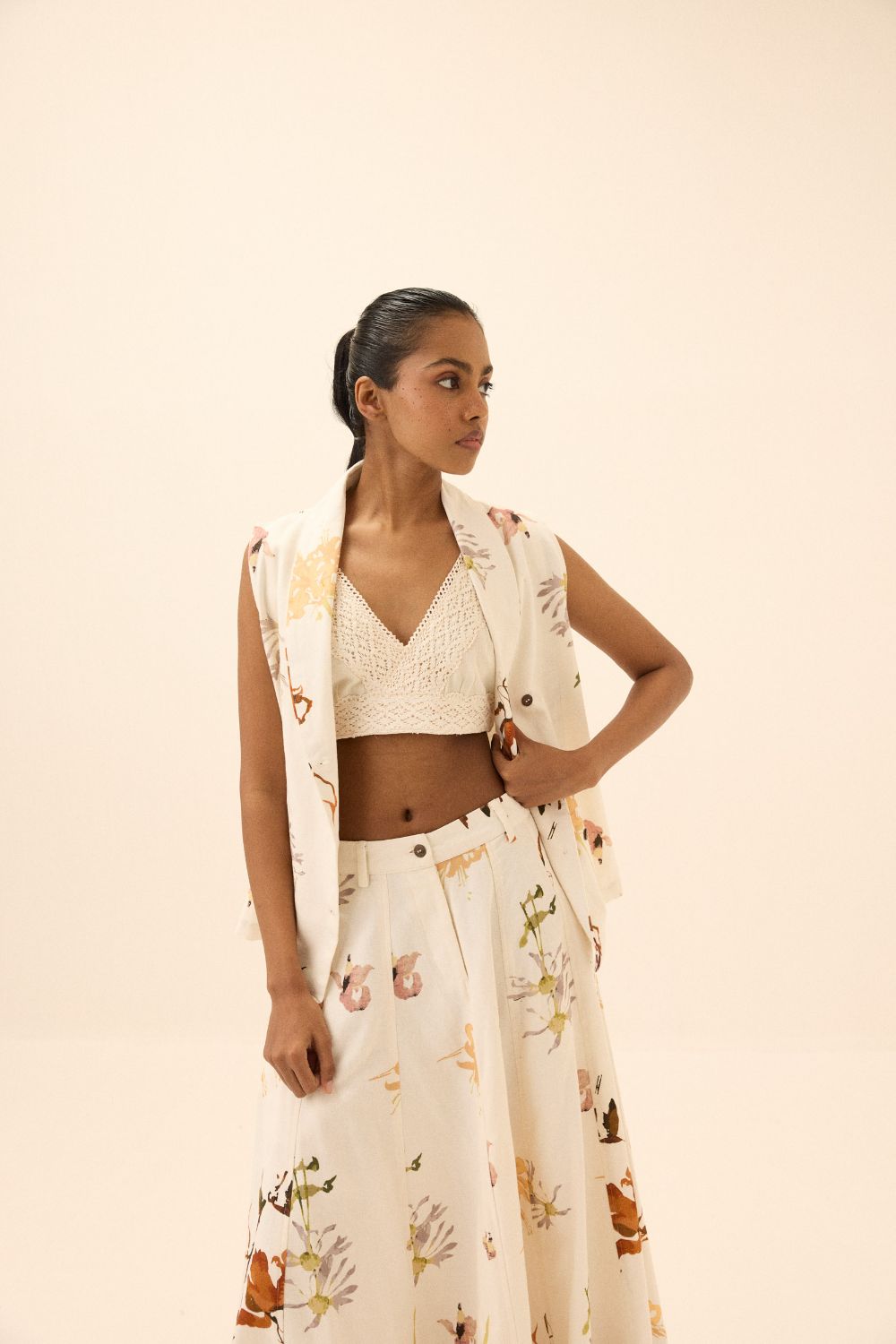 A coordinated set featuring a waistcoat-style top and skirt, brought to life with a bold abstract pattern for a contemporary, artistic look.