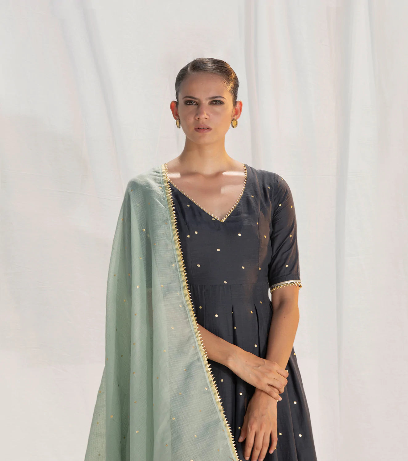 Box-pleated evening gown, handcrafted in cotton silk and adorned with gold foil polkas and gota. Cut in a fit and flare silhouette with a V-neckline and short sleeves.