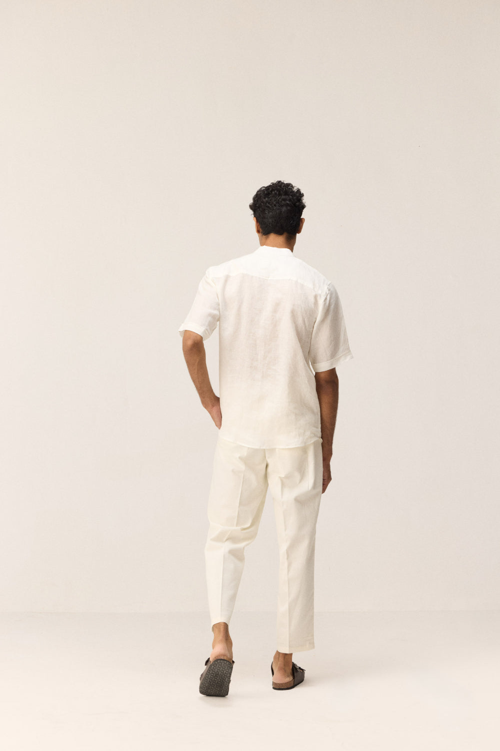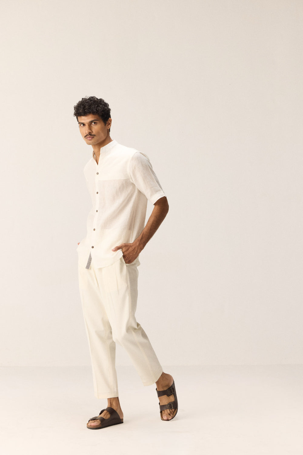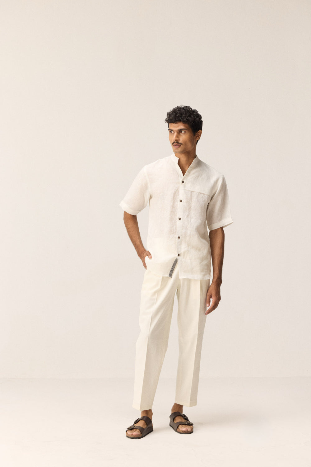 A classic white linen shirt designed with a mandarin collar and front button placket. Features striking black and white check detailing near the neckline and placket, adding a subtle yet distinctive accent. Practical with one patch pocket on the front, this shirt blends clean minimalism with thoughtful design.