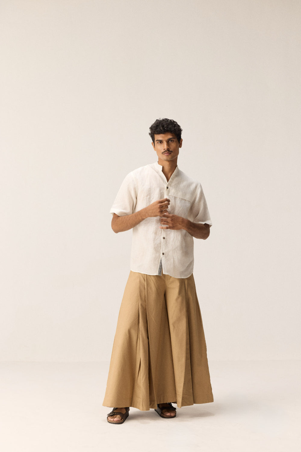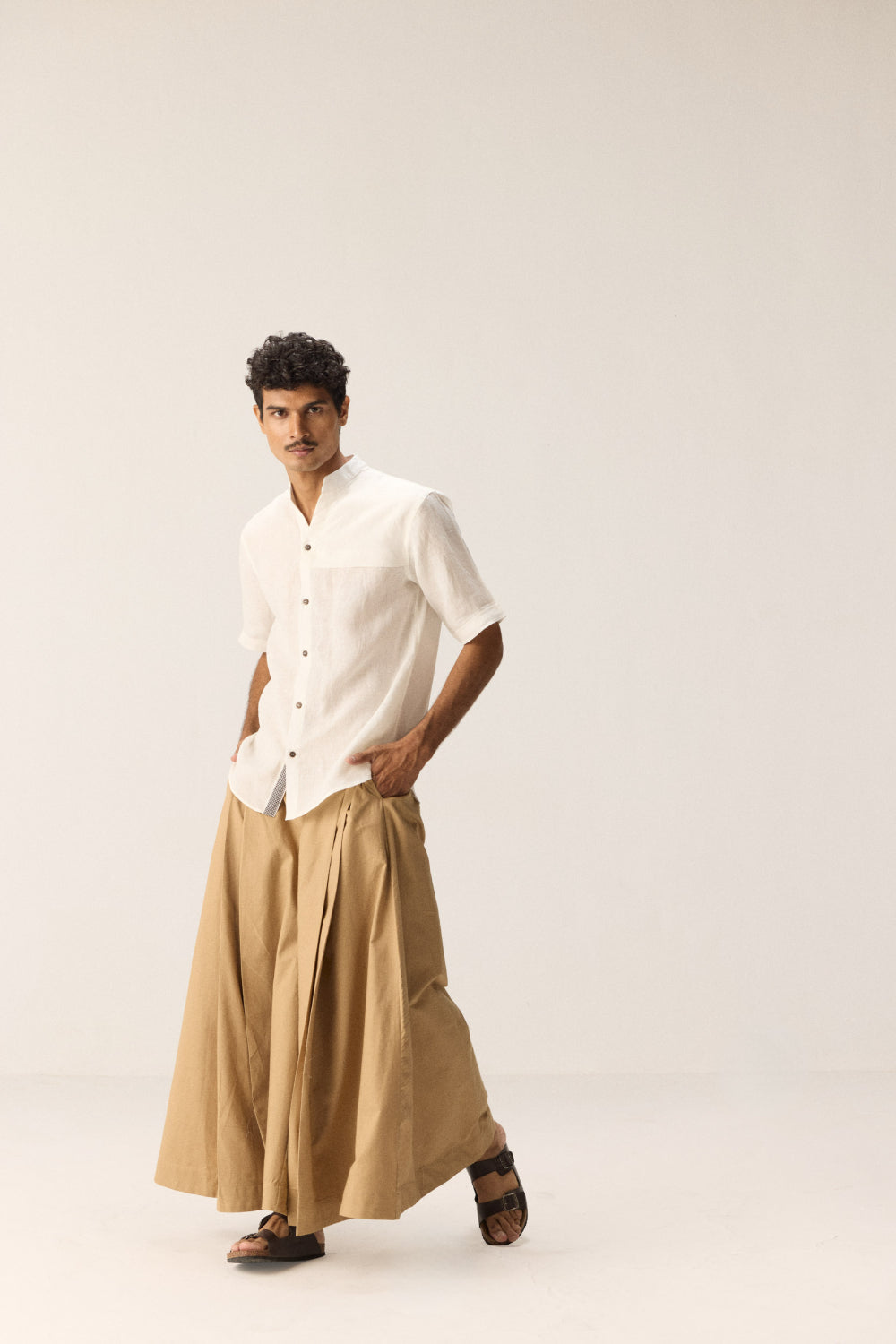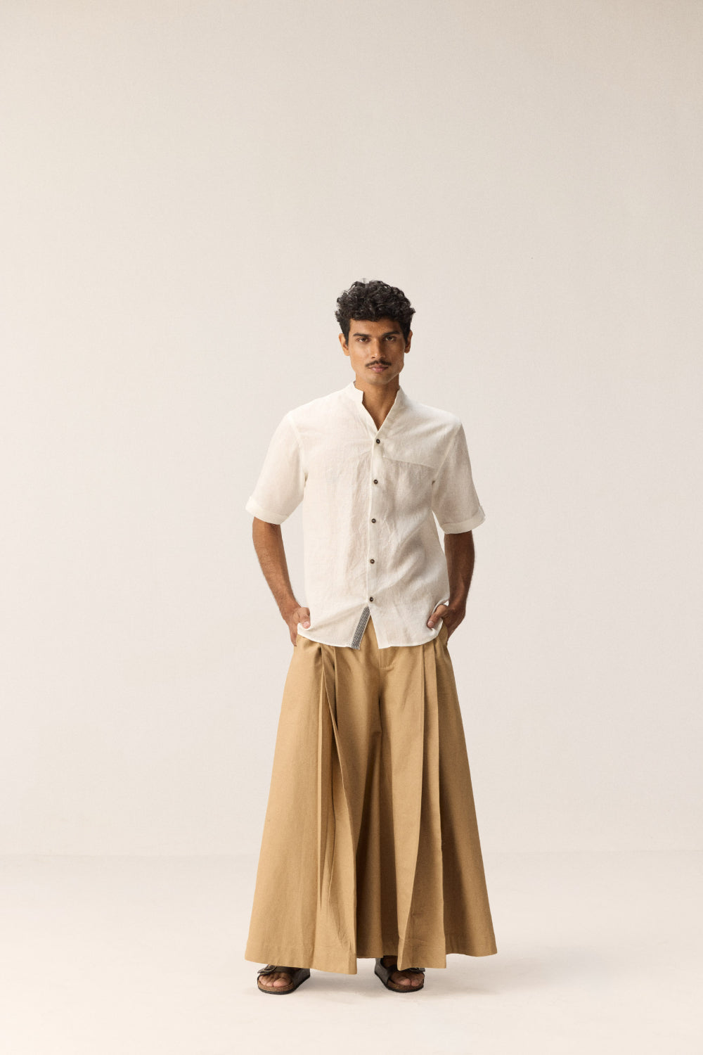 A classic white linen shirt designed with a mandarin collar and front button placket. Features striking black and white check detailing near the neckline and placket, adding a subtle yet distinctive accent. Practical with one patch pocket on the front, this shirt blends clean minimalism with thoughtful design.