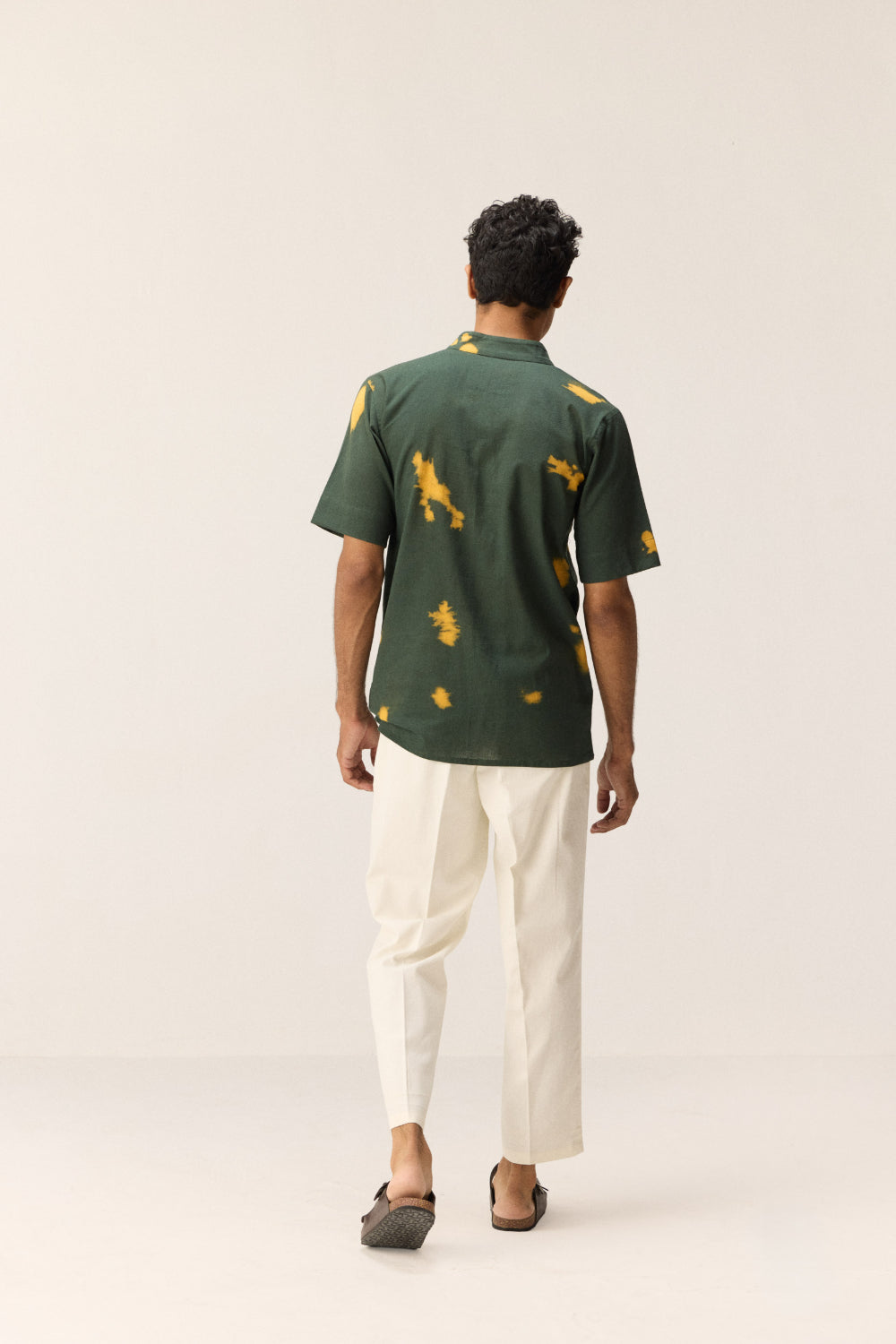 This dark green khadi shirt stands out with its striking yellow shibori patches—each one hand-dyed for a unique, artisanal flair. The breathable fabric keeps it cool and comfortable, while the bold contrast adds a fresh, unexpected twist to a timeless silhouette.