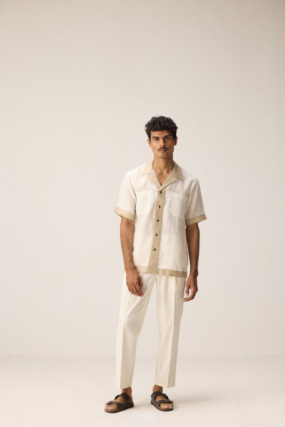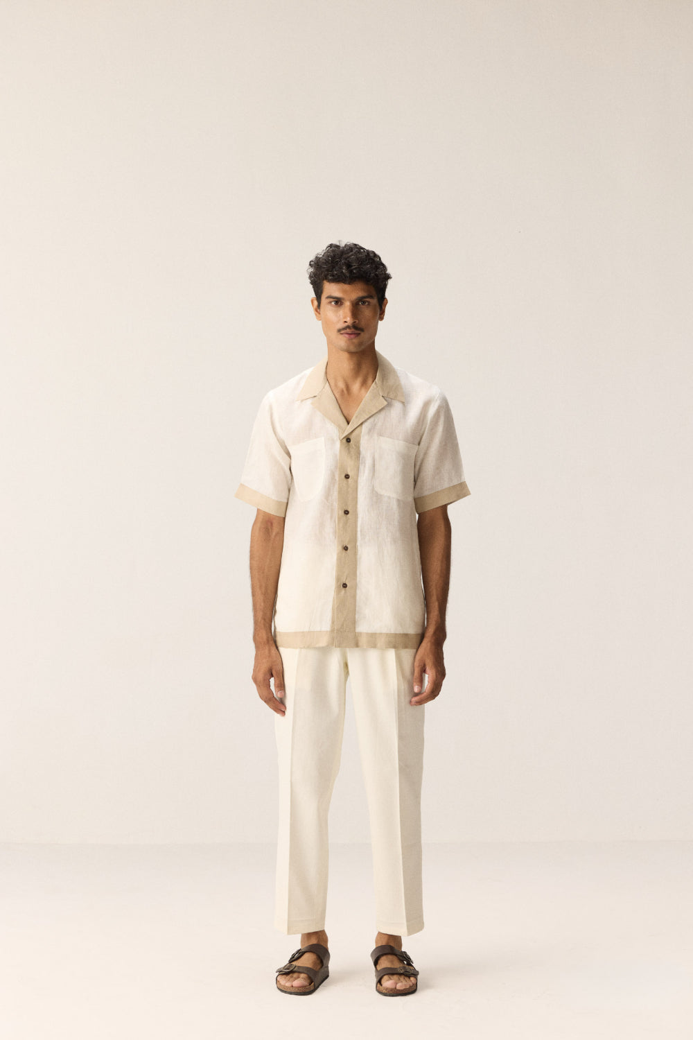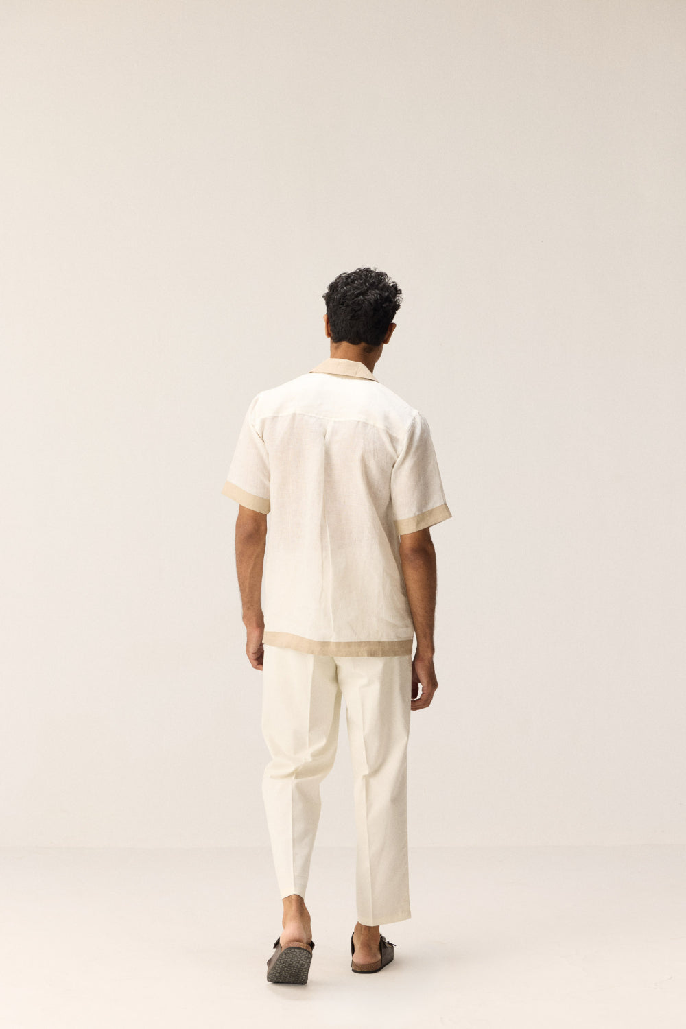 A crisp white linen shirt accented with elegant beige borders that make a subtle statement. Crafted for comfort and style, it balances classic simplicity with refined detailing