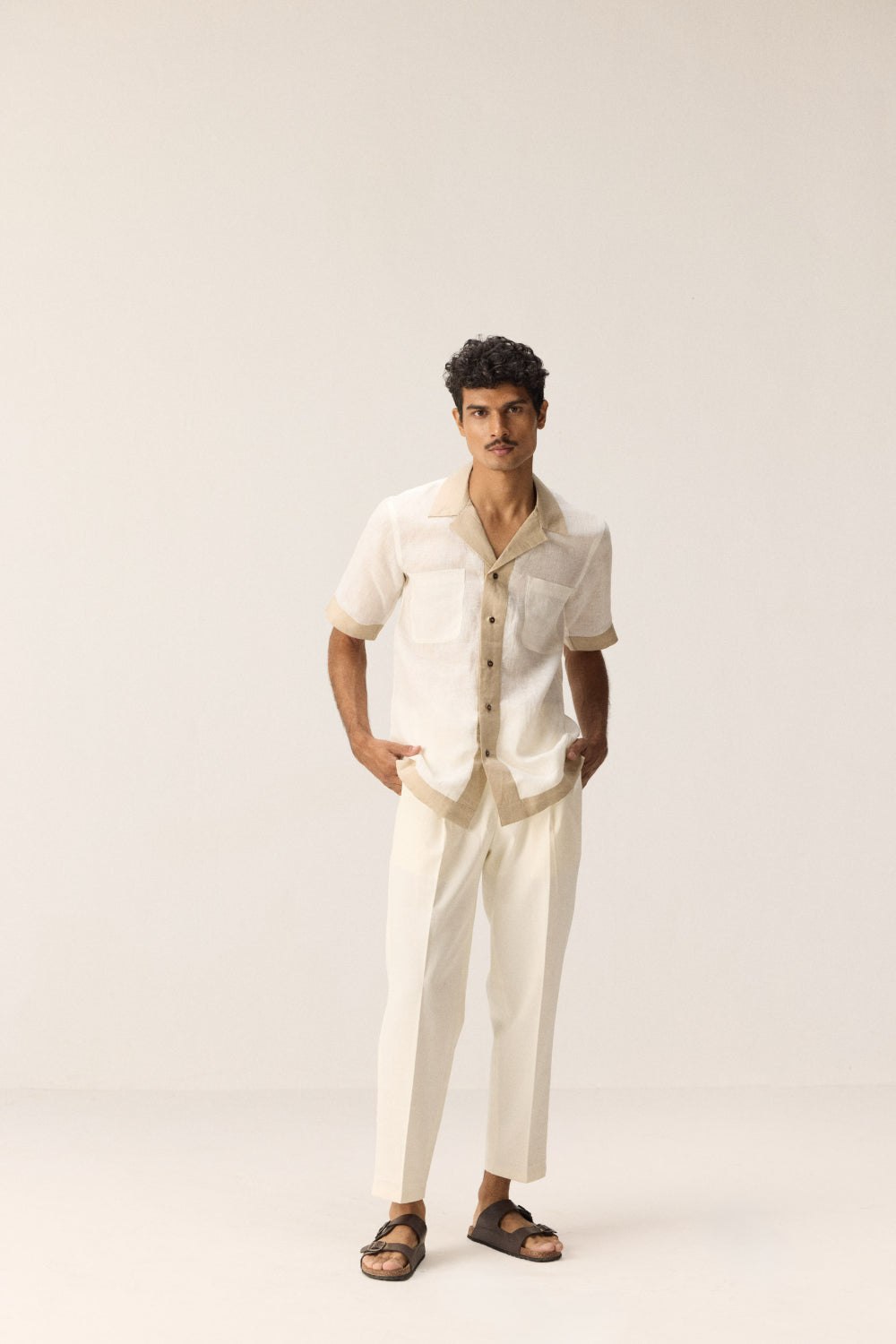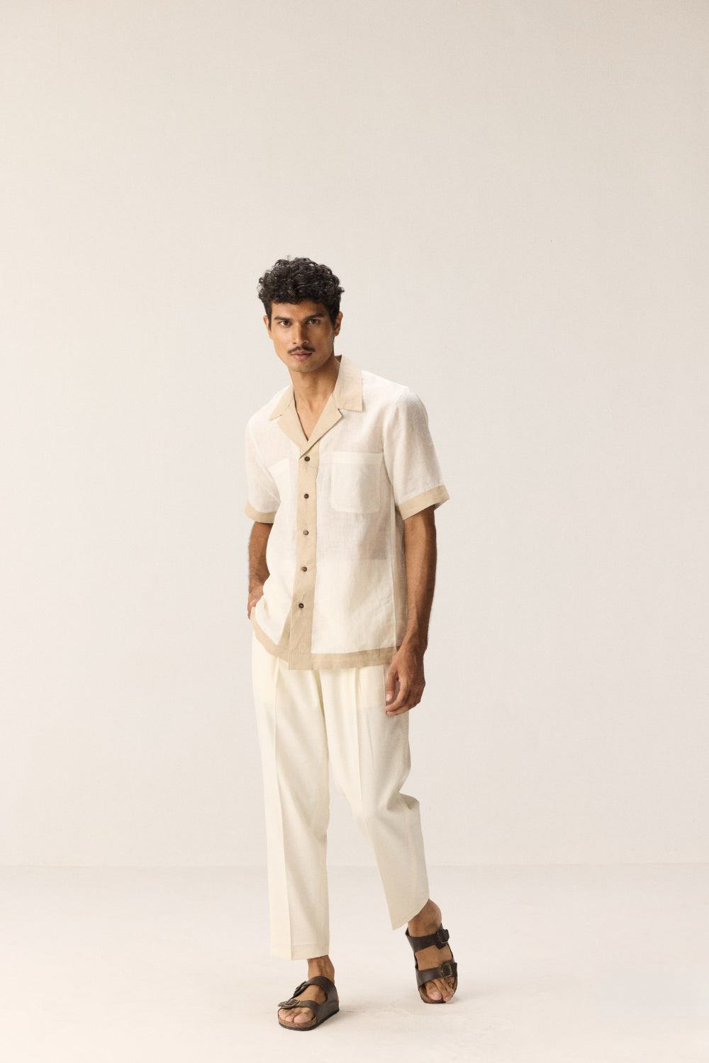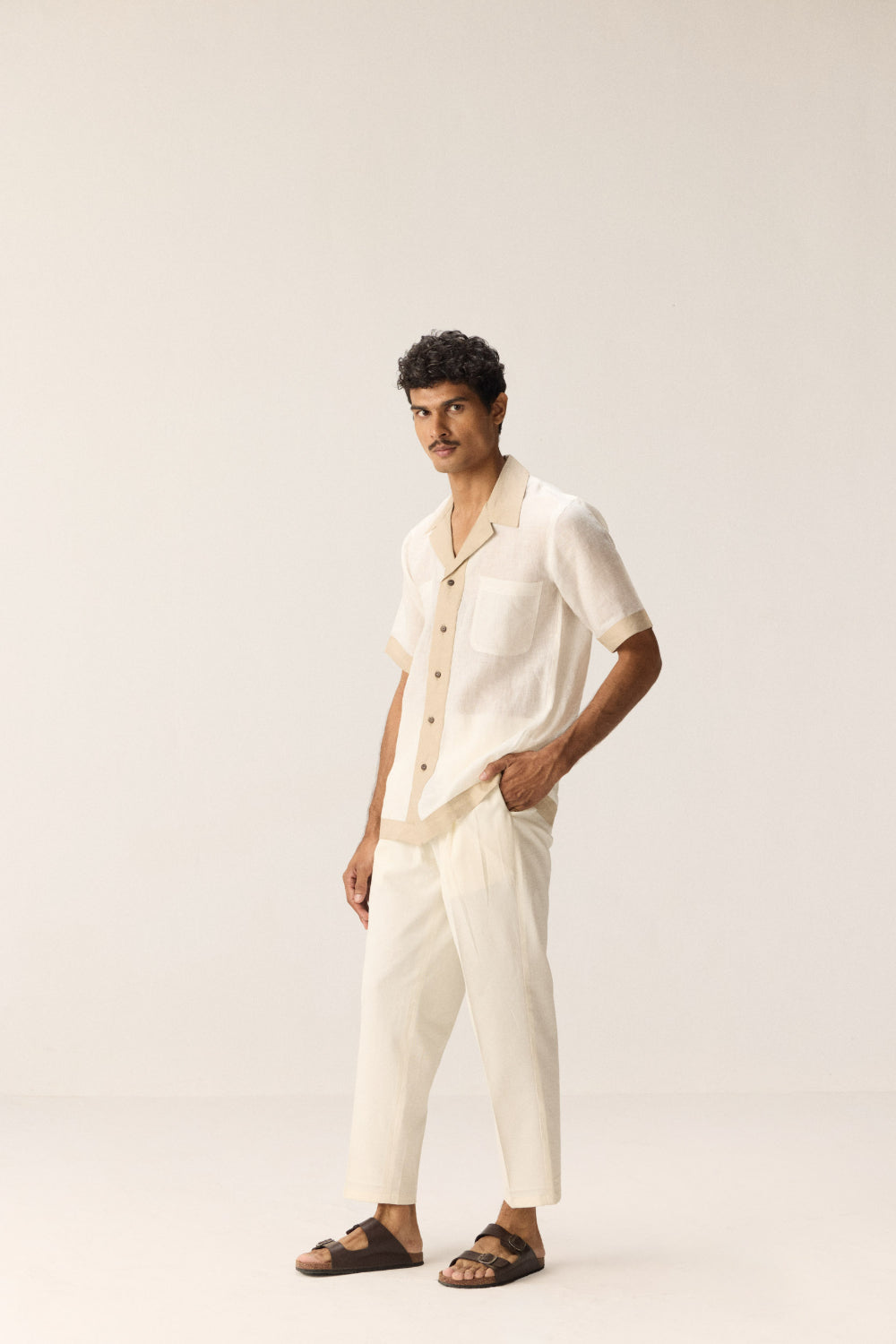 A crisp white linen shirt accented with elegant beige borders that make a subtle statement. Crafted for comfort and style, it balances classic simplicity with refined detailing