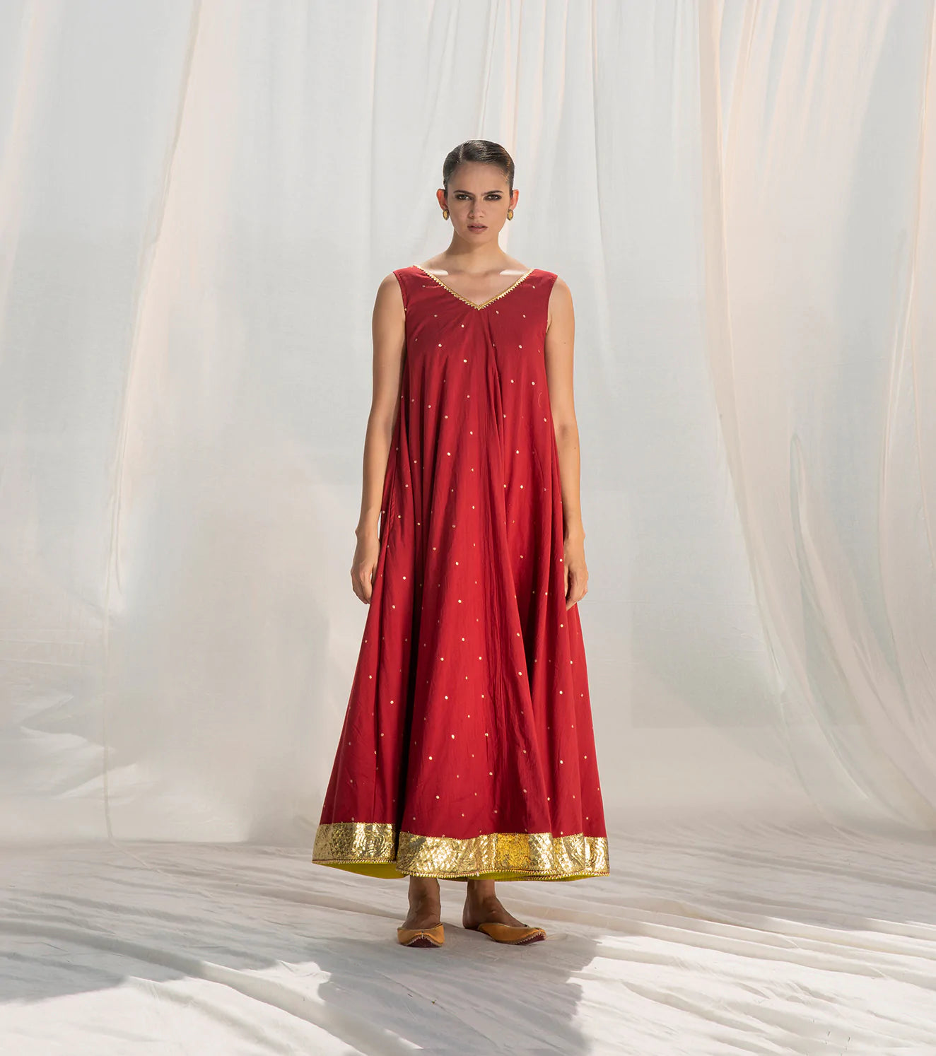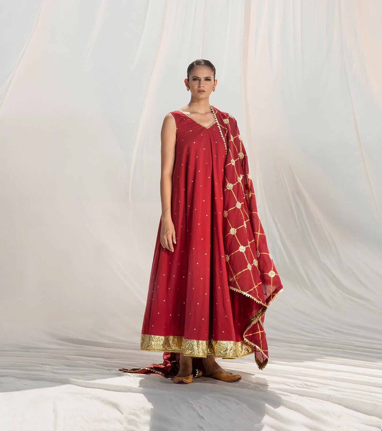 A festive staple sleeveless maxi gown with a V-neckline, overall gold foil polka print and delicate gota details. Paired with our Saanvi Jaal Dupatta.