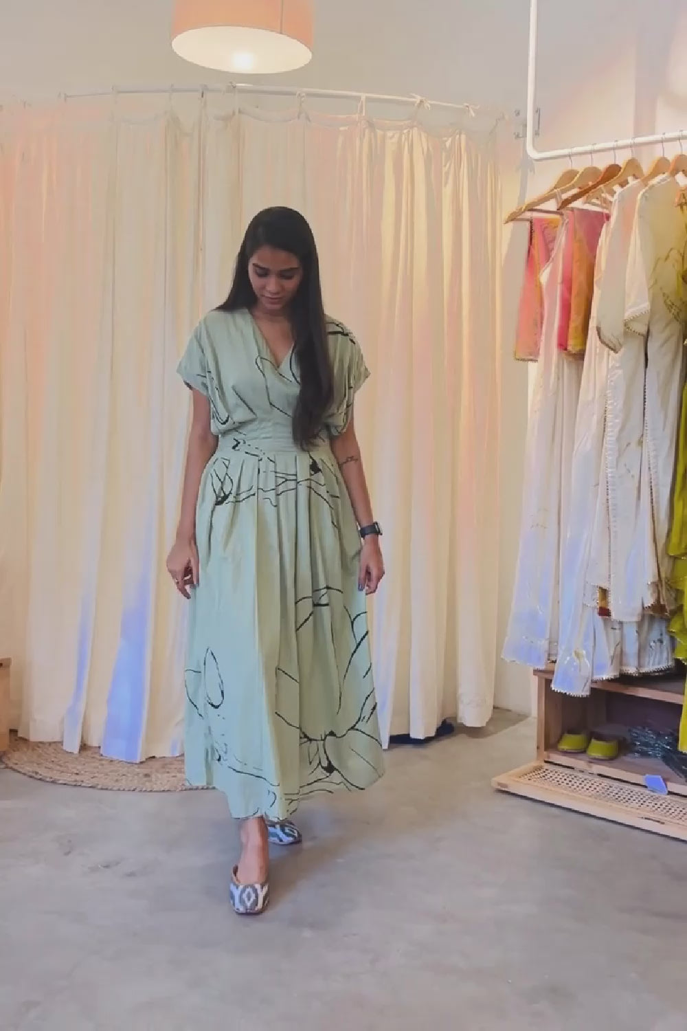 A printed waist fitted dress with pleat detailing, kaftan sleeves, elastic band at back and V-neckline.