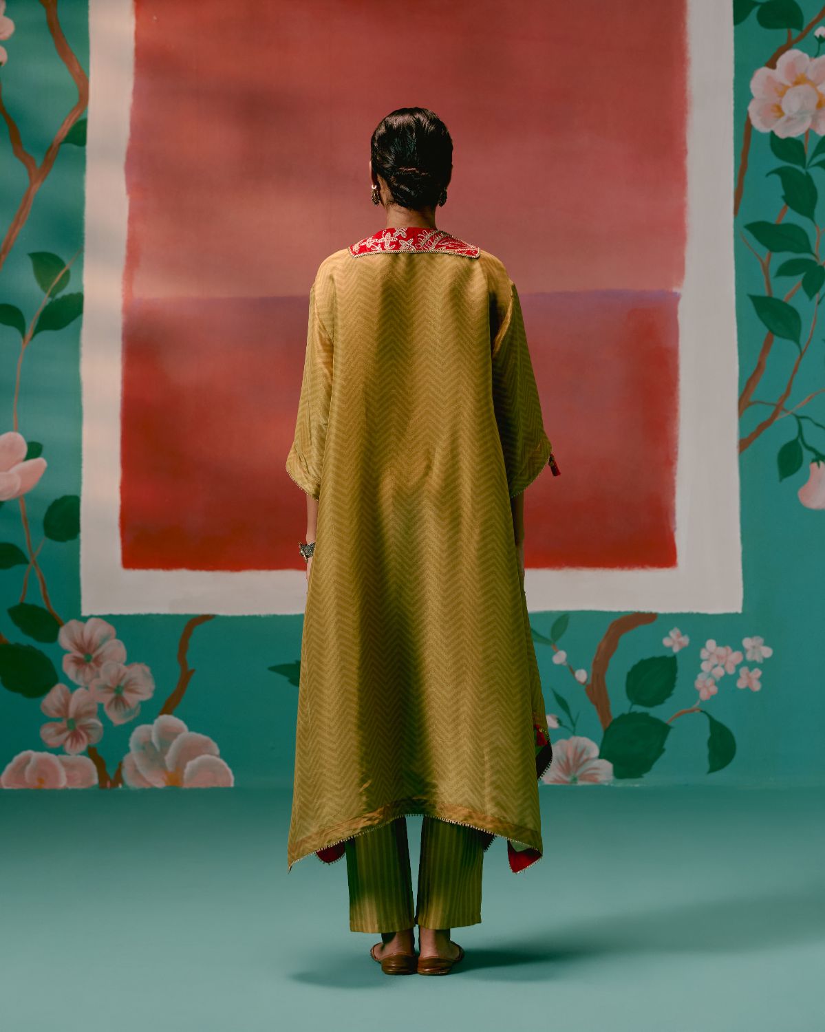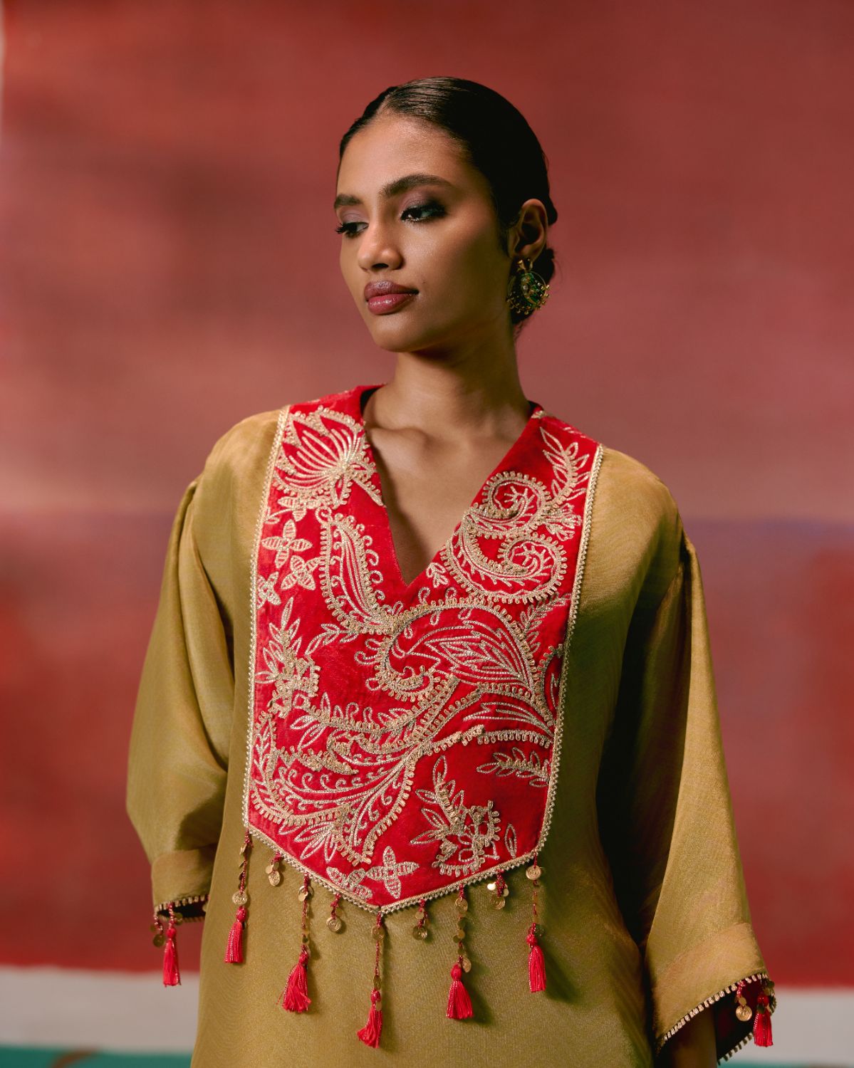 Crafted in luminous tissue, the silhouette is elevated with a deep red velvet yoke, intricately adorned with gotta patti embroidery that mirrors traditional artistry. Delicate handmade tassels complete the look, adding movement and charm to this statement-making piece — perfect for evening gatherings and festive occasions.
