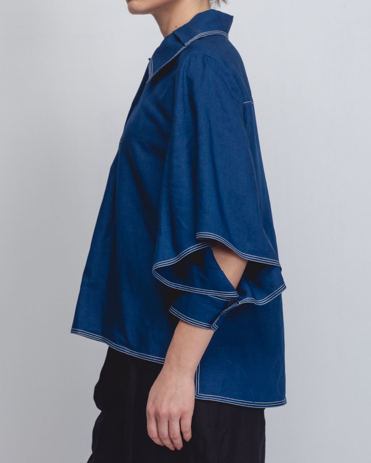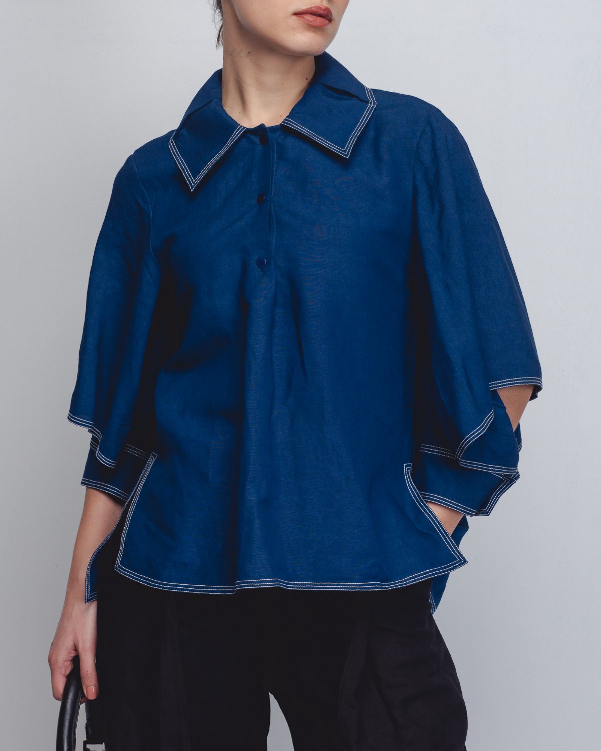 Cut in 100% linen,this top features a three-button front placket and an oversized pleated pointed collar accented by white contrast topstitching. It has layered bell sleeves and asymmetrical hemline also with contrast stitching. The model is 5'8 and the garment is 25 inches.