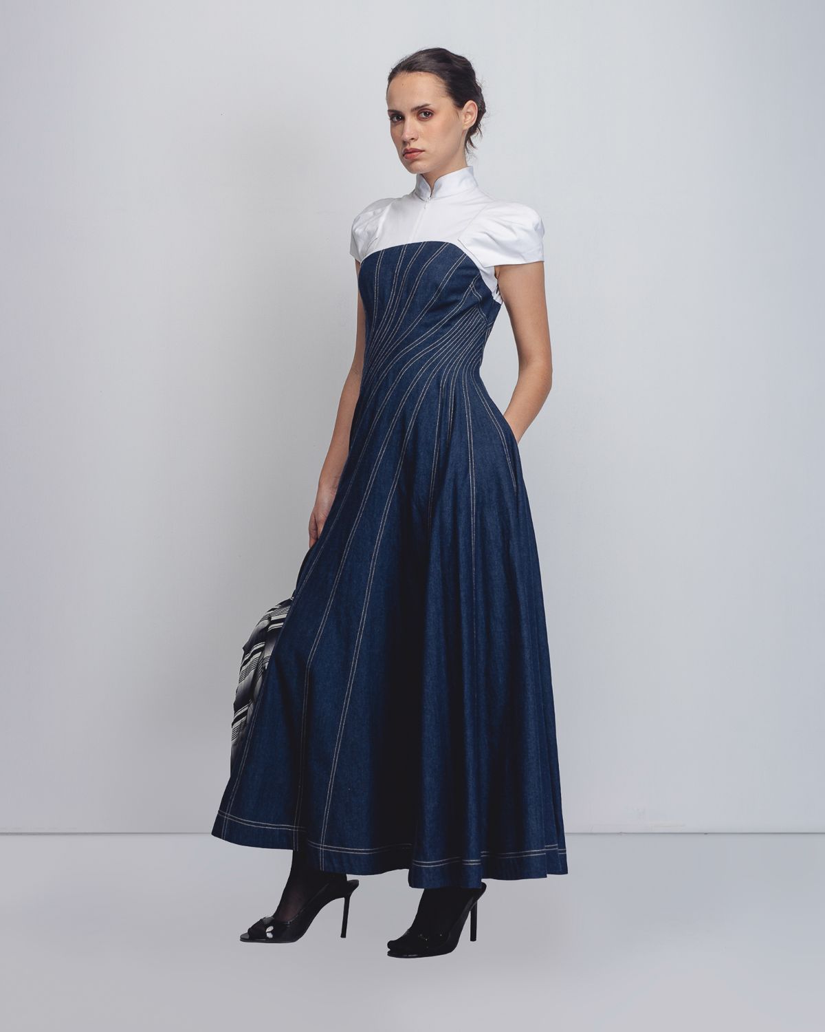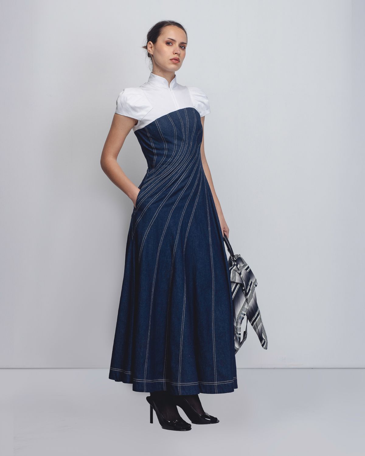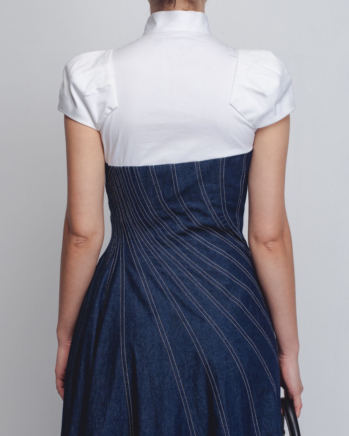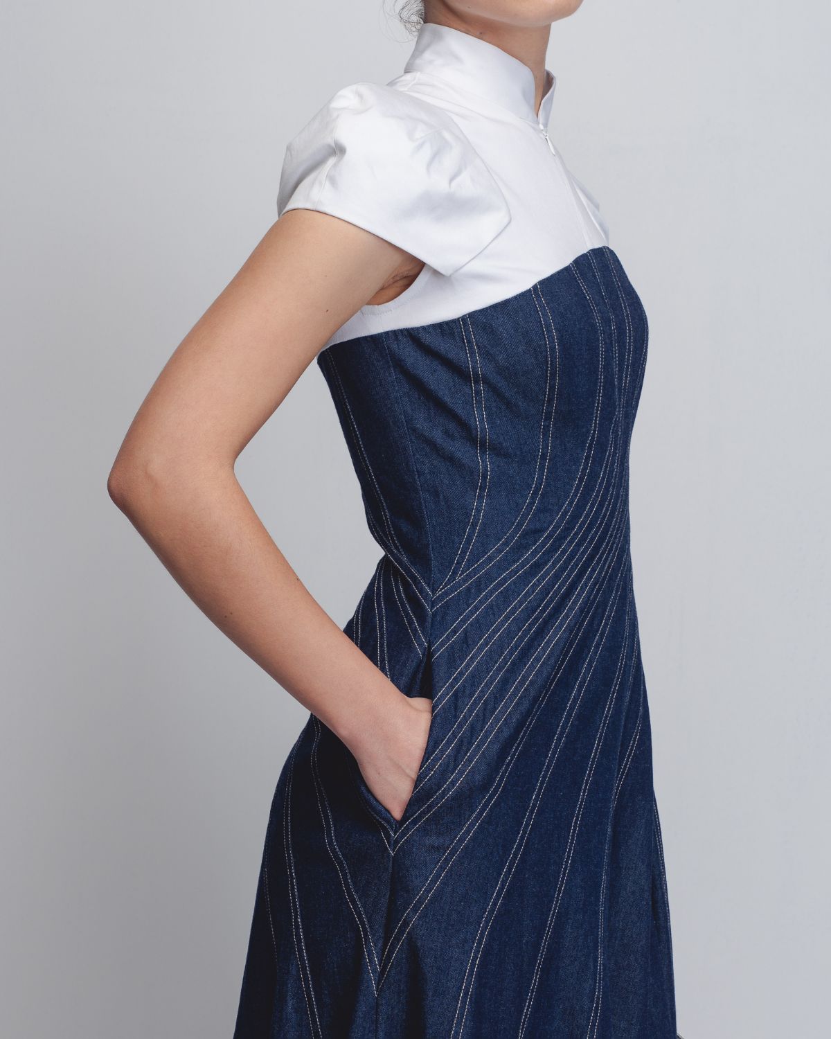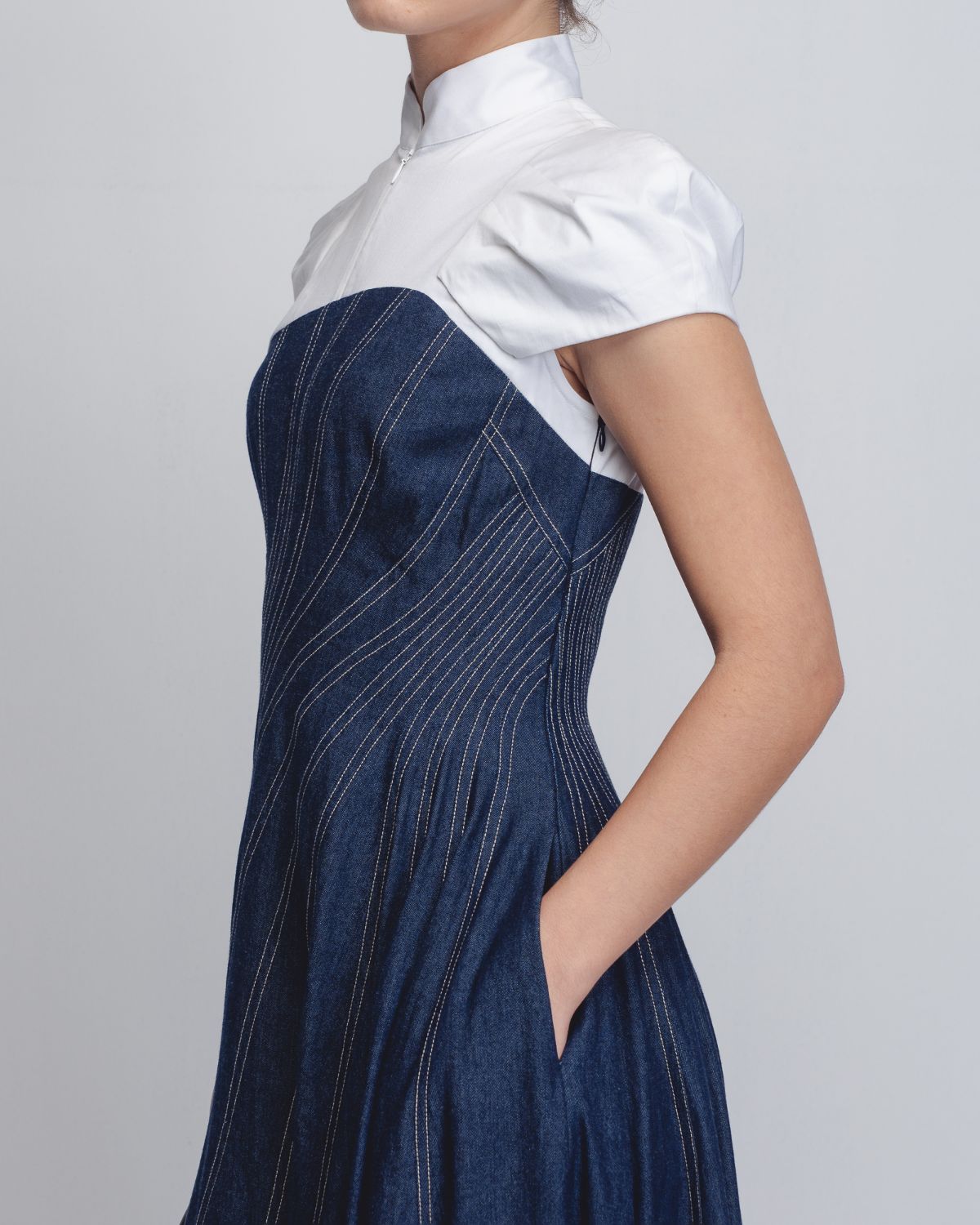 An architectural silhouette achieved through creative pattern-making techniques and technical precision. Crafted in dual fabrics, the upper bodice is constructed in 100% White Cotton Poplin up to the bust, featuring darted cap sleeves that form a shell-like shape at the shoulders. The torso is cut in 100% Cotton Khadi Denim, constructed and cutin multiple spiral-cut panels that contour the waistline and flare into a voluminous hem. Beige thread topstitching highlights the seam lines, accentuating the garment’s sculptural construction. The model is 5 ft 10 inches and the dress length is 55 inches.