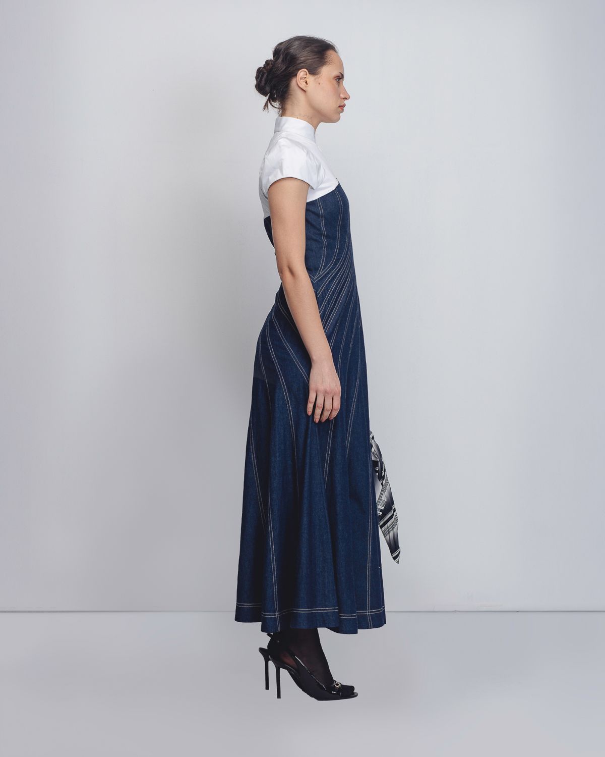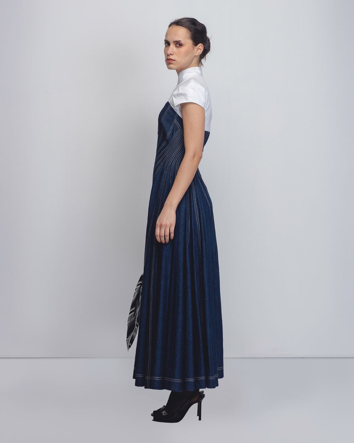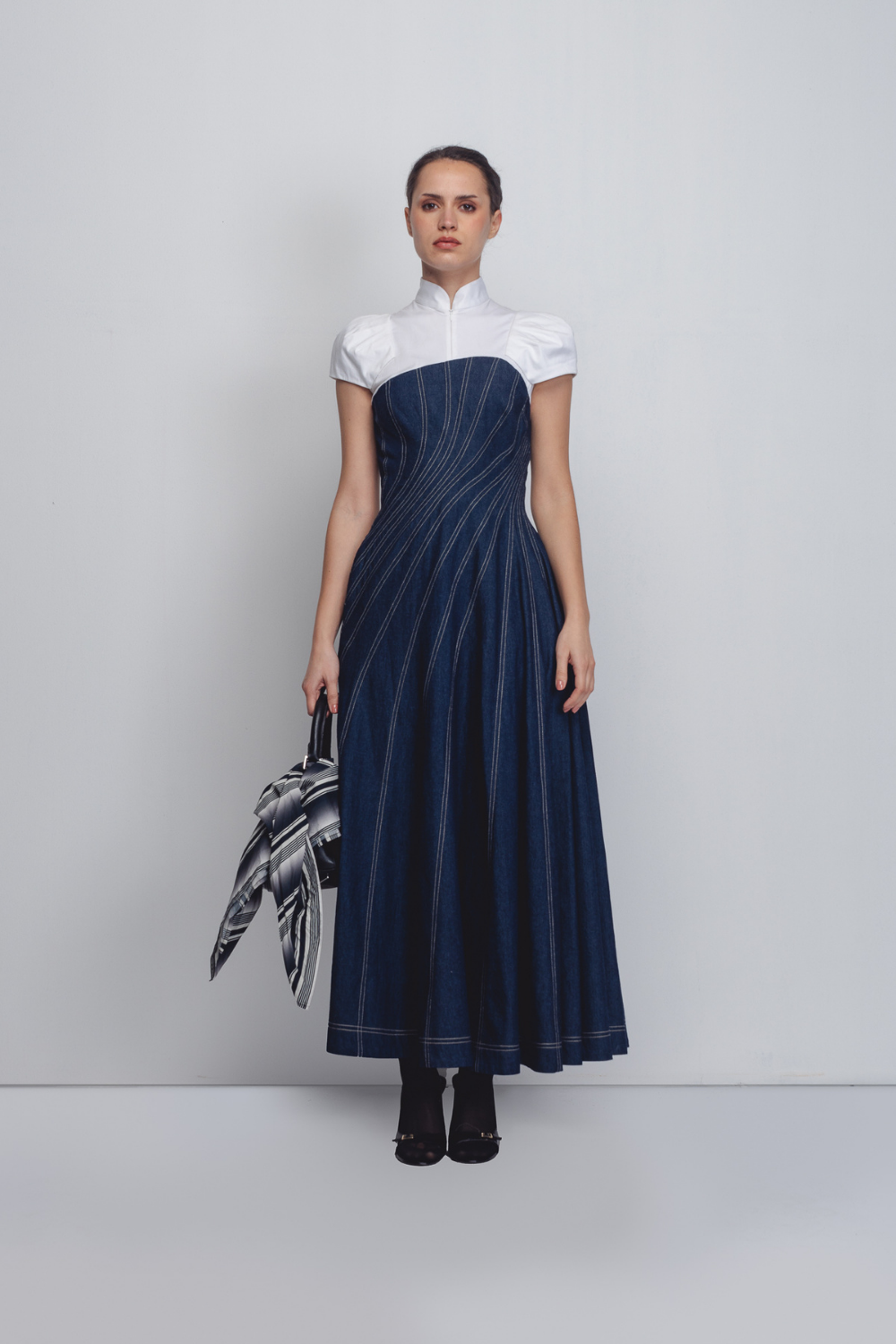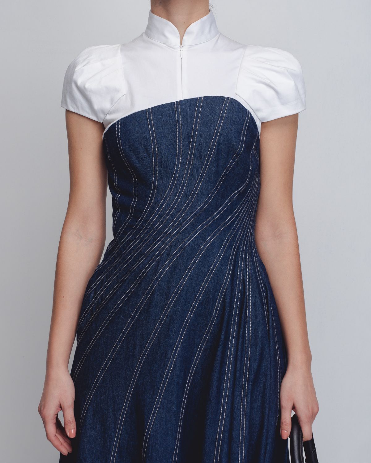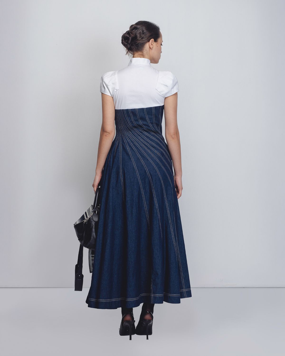 An architectural silhouette achieved through creative pattern-making techniques and technical precision. Crafted in dual fabrics, the upper bodice is constructed in 100% White Cotton Poplin up to the bust, featuring darted cap sleeves that form a shell-like shape at the shoulders. The torso is cut in 100% Cotton Khadi Denim, constructed and cutin multiple spiral-cut panels that contour the waistline and flare into a voluminous hem. Beige thread topstitching highlights the seam lines, accentuating the garment’s sculptural construction. The model is 5 ft 10 inches and the dress length is 55 inches.