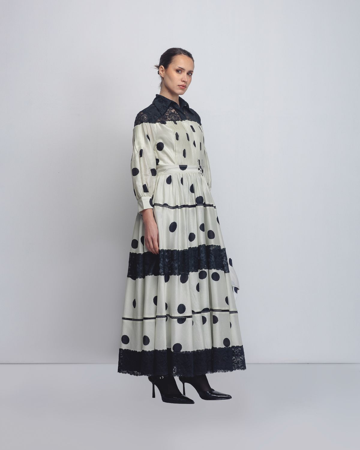 The design is characterized by a high, gathered neckline and voluminous puff sleeves that create a dramatic upper-body silhouette. explores fabric-manipulation technique, with gathers strategically secured by seam lines across the torso and highlighted with applied fabric strips that both secures and create an accent across the garment leading into a peplum and a full, floor-length skirt. The model is 5ft 8inches and the garment length is 55 inches.