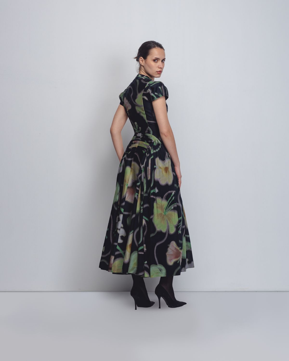 Crafted in Chanderi, featuring in-house designed floral prints,this dress xfeatures a fitted bodice with a gathered V-neckline and architectural cap sleeves that frame the shoulders. Pleated at the waist that flows into a deeply full skirt, creating a rhythmic, voluminous movement that balances the garment’s precise tailoring with an organic, botanical aesthetic. The model is 5'8 and the garment length is 55 inches.