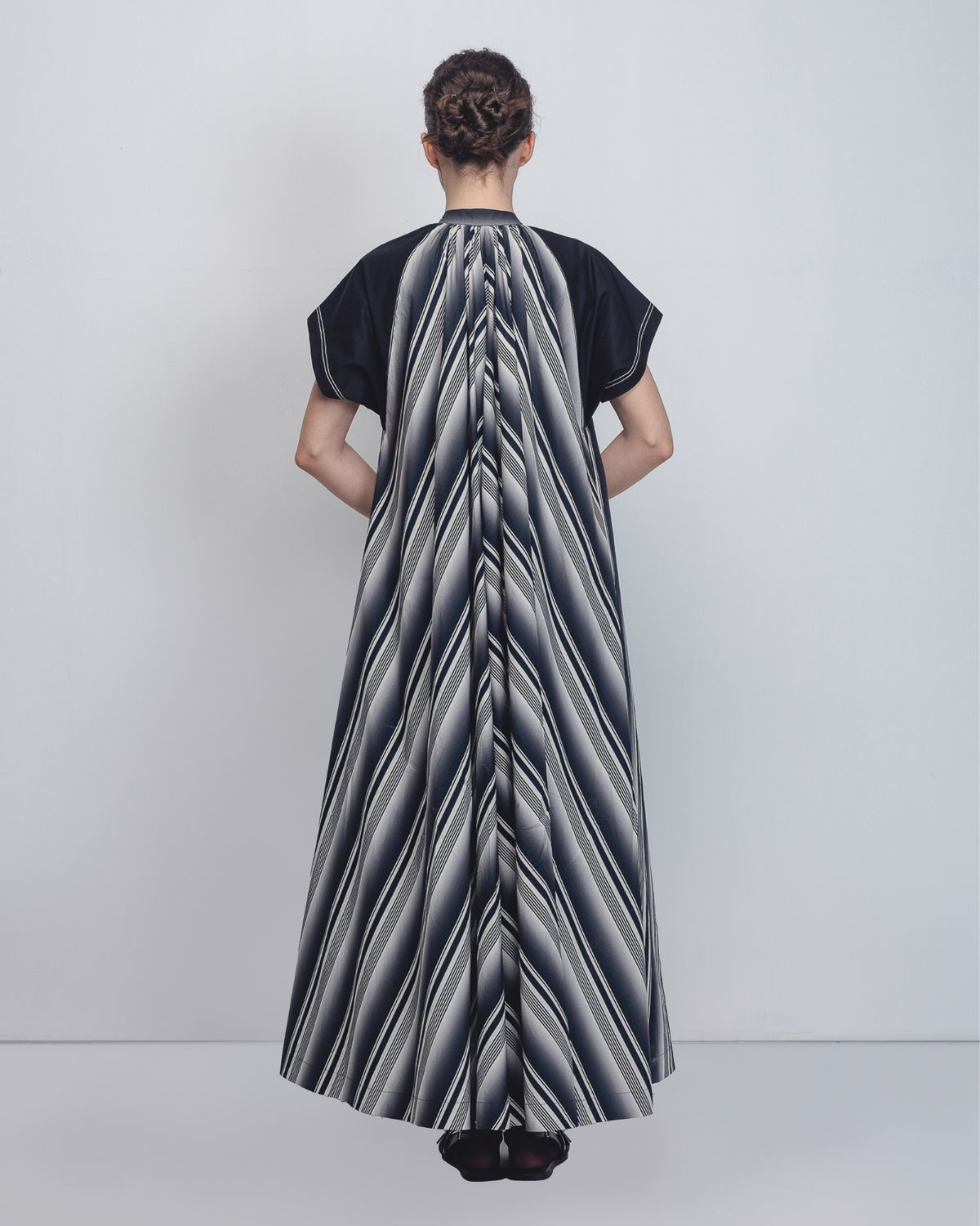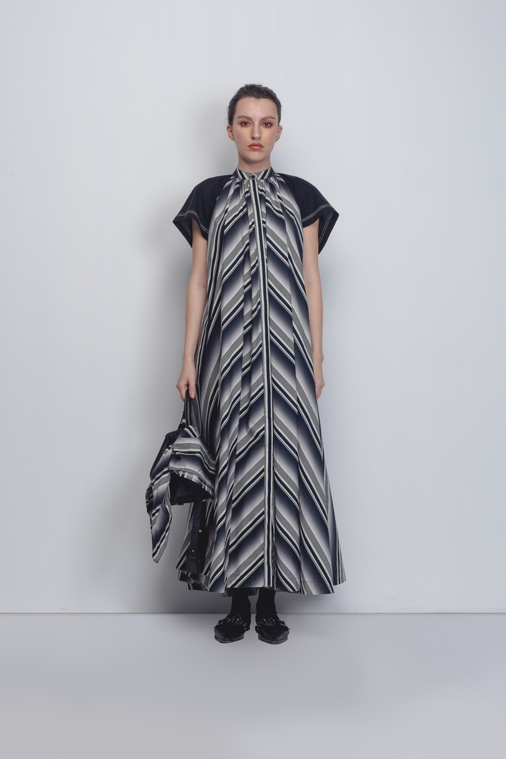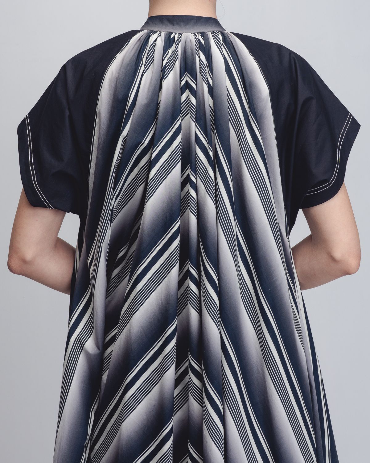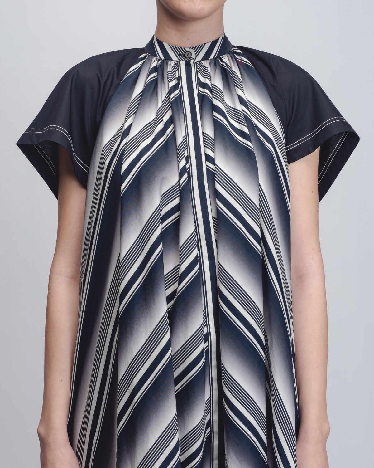 A playful, graphic take on the classic tent dress silhouette, this garment is crafted in striped 100% Cotton Poplin. The design features a high, gathered neckline and a functional button front opening, transitioning into a sweeping A-line frame. Contrasting structured black cap sleeves provide a sharp architectural counterpoint to the fluid body. 55"