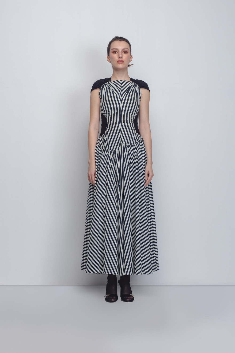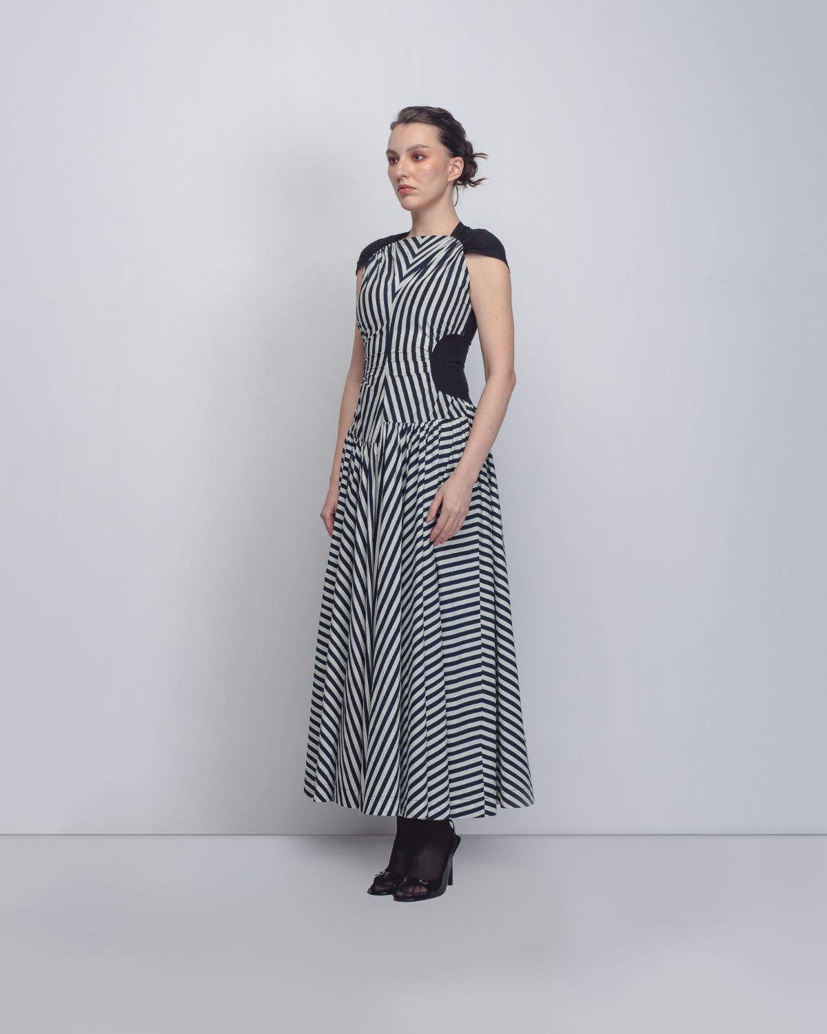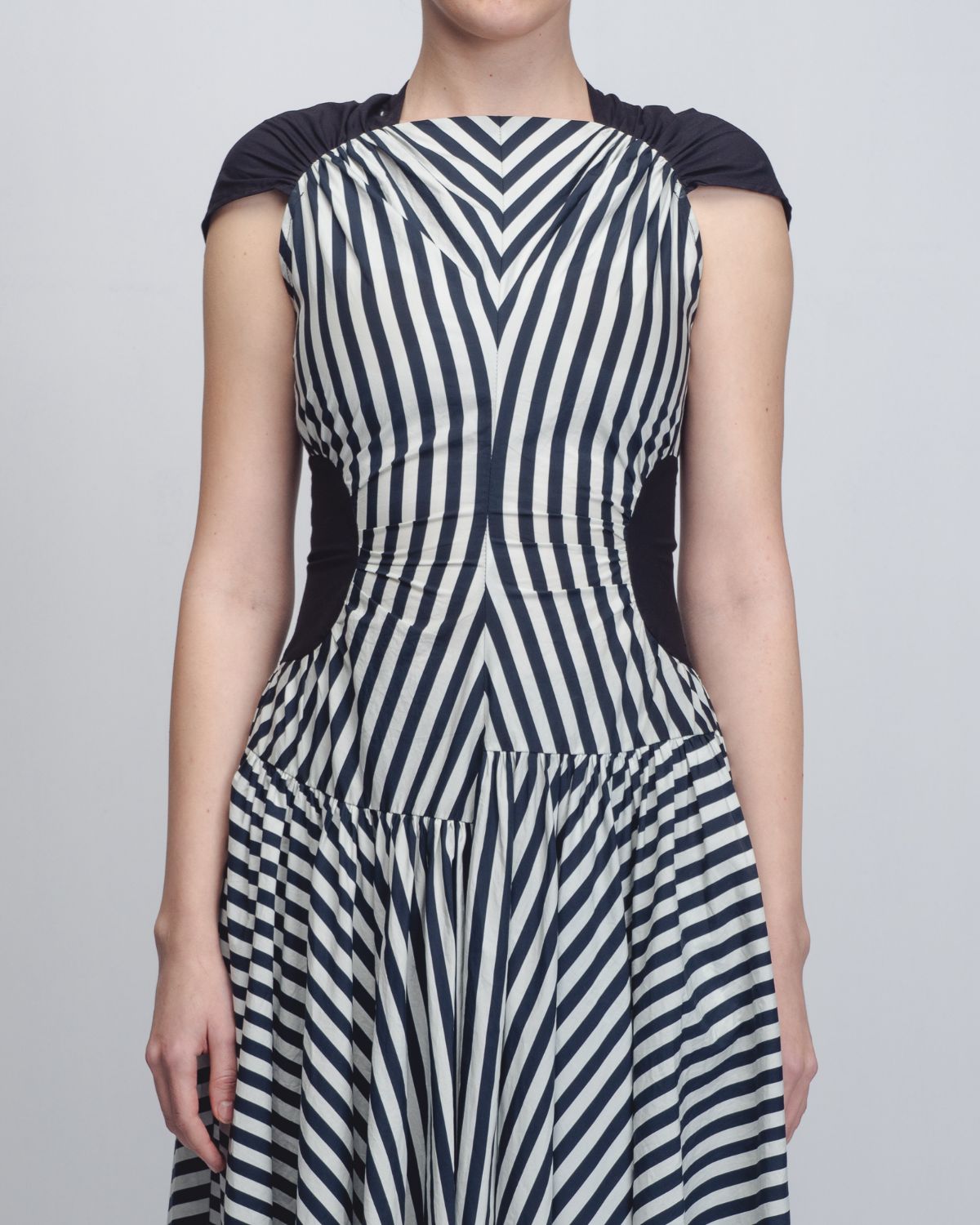 The dress features a high, gathered neckline with asymmetrical waistline. Its rhythmic pattern utilizes alternating vertical and diagonal black-and-white stripes to create an elongated silhouette, accented by solid black panels at the ribs that further define the waist. The model is 5'10, and the garment length is 55 inches.
