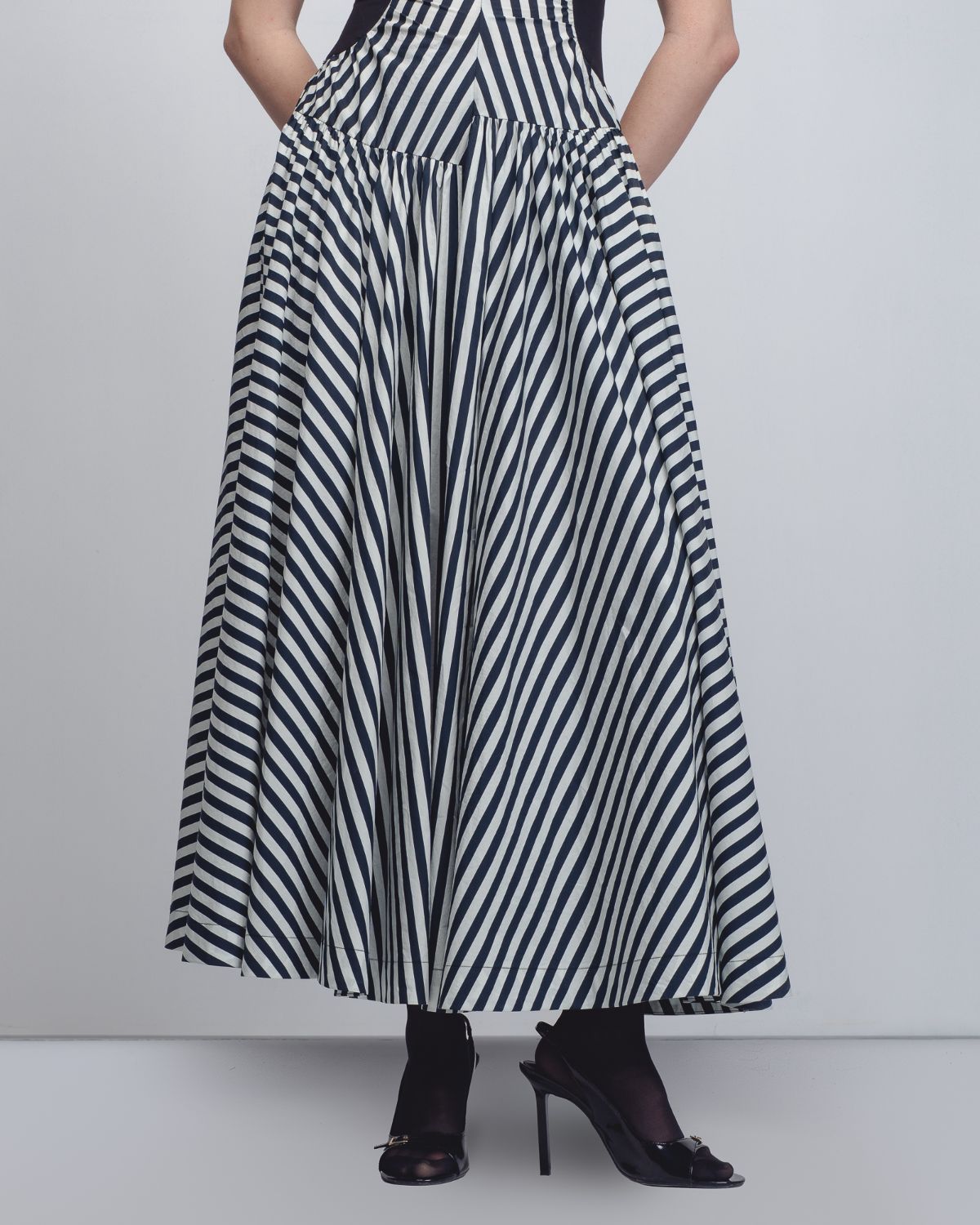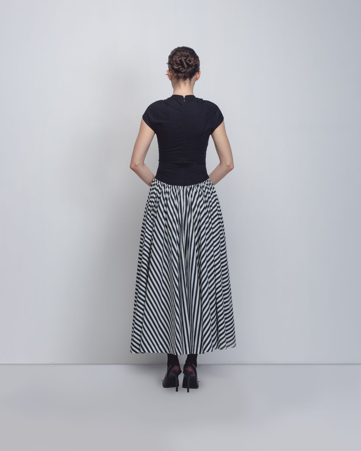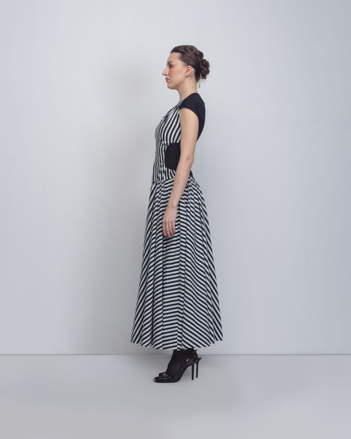 The dress features a high, gathered neckline with asymmetrical waistline. Its rhythmic pattern utilizes alternating vertical and diagonal black-and-white stripes to create an elongated silhouette, accented by solid black panels at the ribs that further define the waist. The model is 5'10, and the garment length is 55 inches.