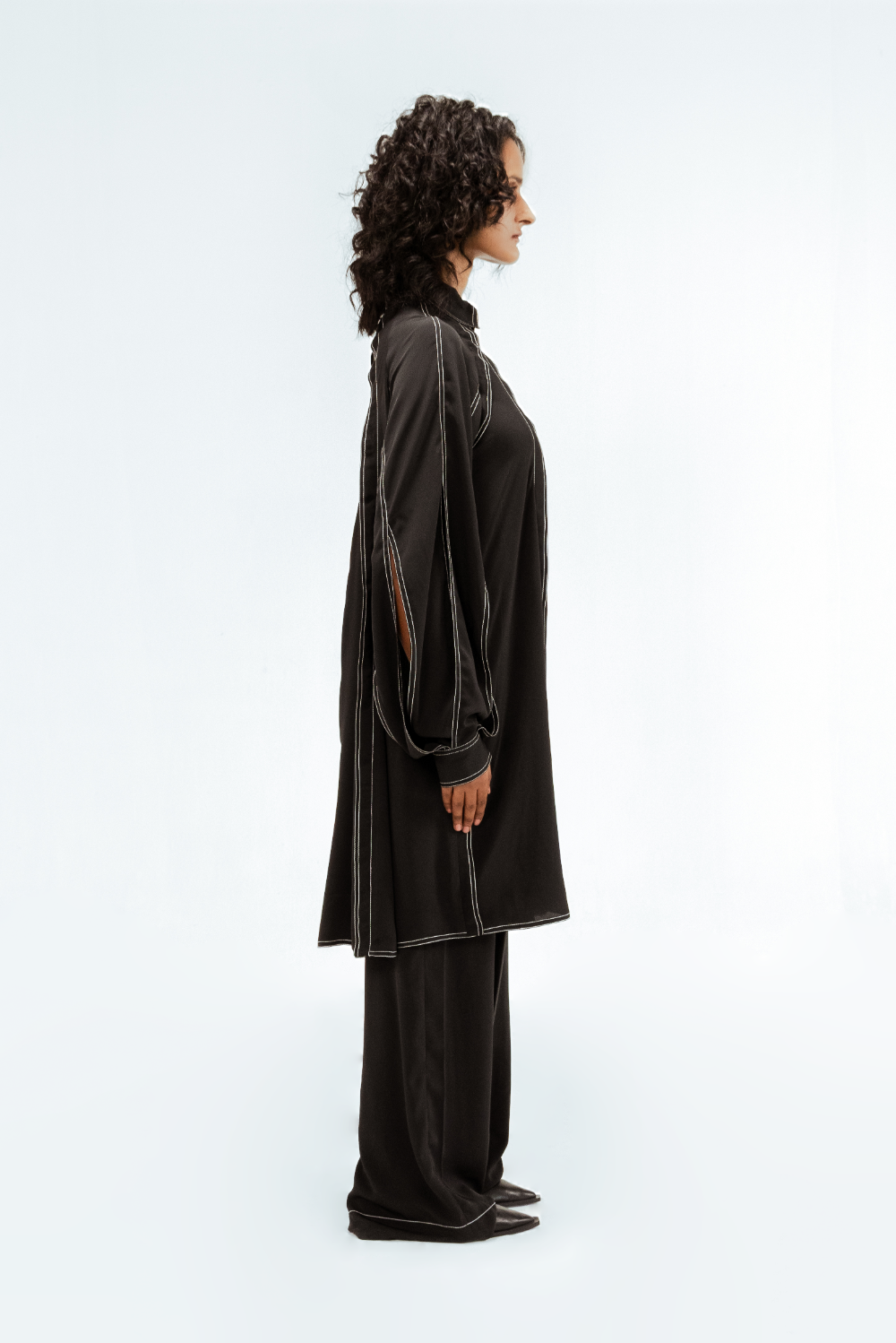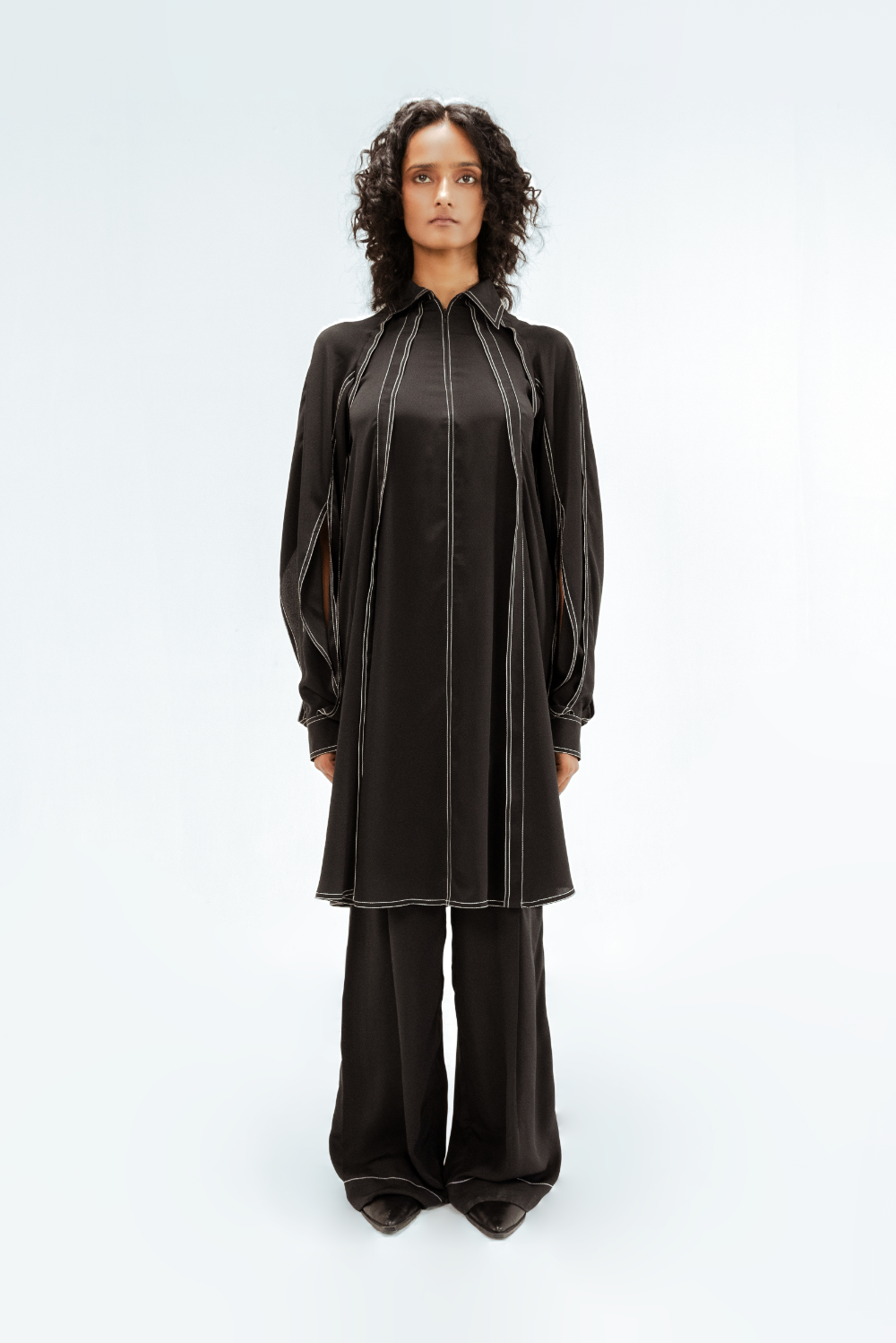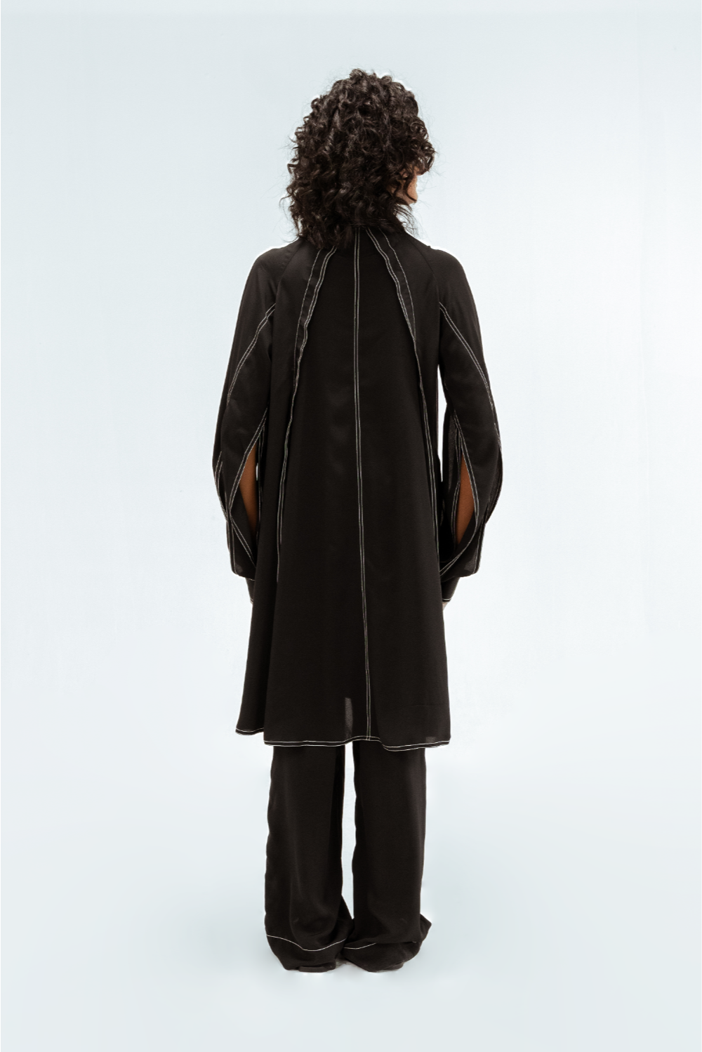 This black crepe tunic features a sculptural sleeves with open slits that create fluid movement and visual interest. Defined by vertical contrast stitch lines, the silhouette is elongated and sharply structured. Model Height is 5'9". Model wears size S. Garment length is ( Top 39")
