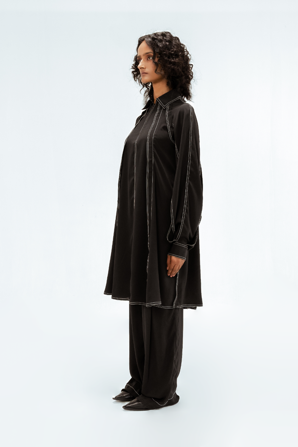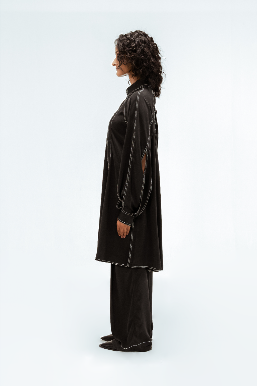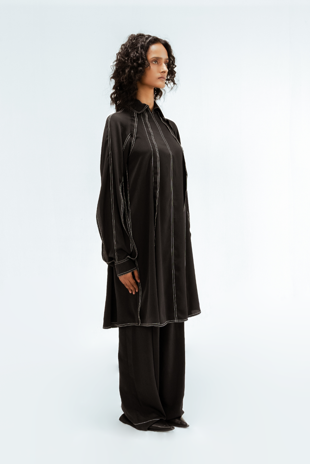 This black crepe tunic features a sculptural sleeves with open slits that create fluid movement and visual interest. Defined by vertical contrast stitch lines, the silhouette is elongated and sharply structured. Model Height is 5'9". Model wears size S. Garment length is ( Top 39")