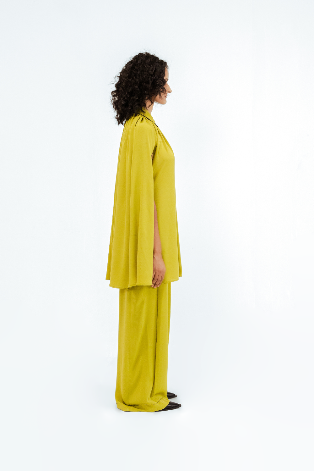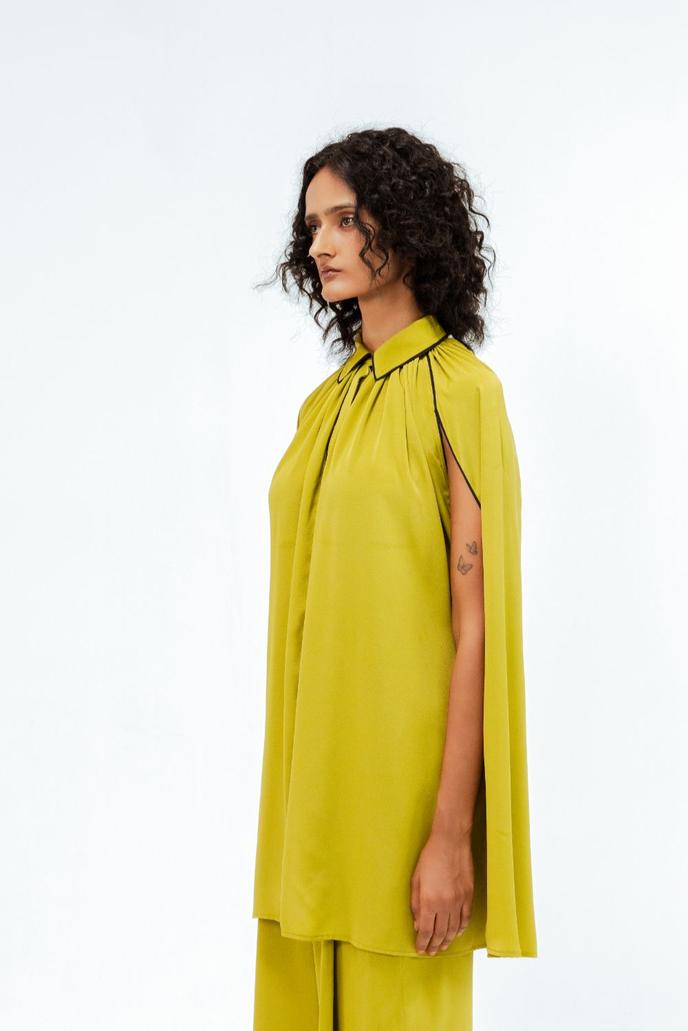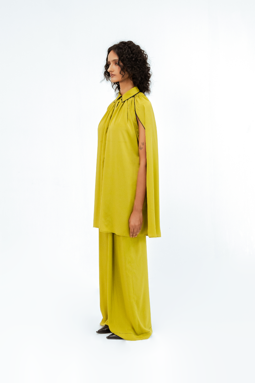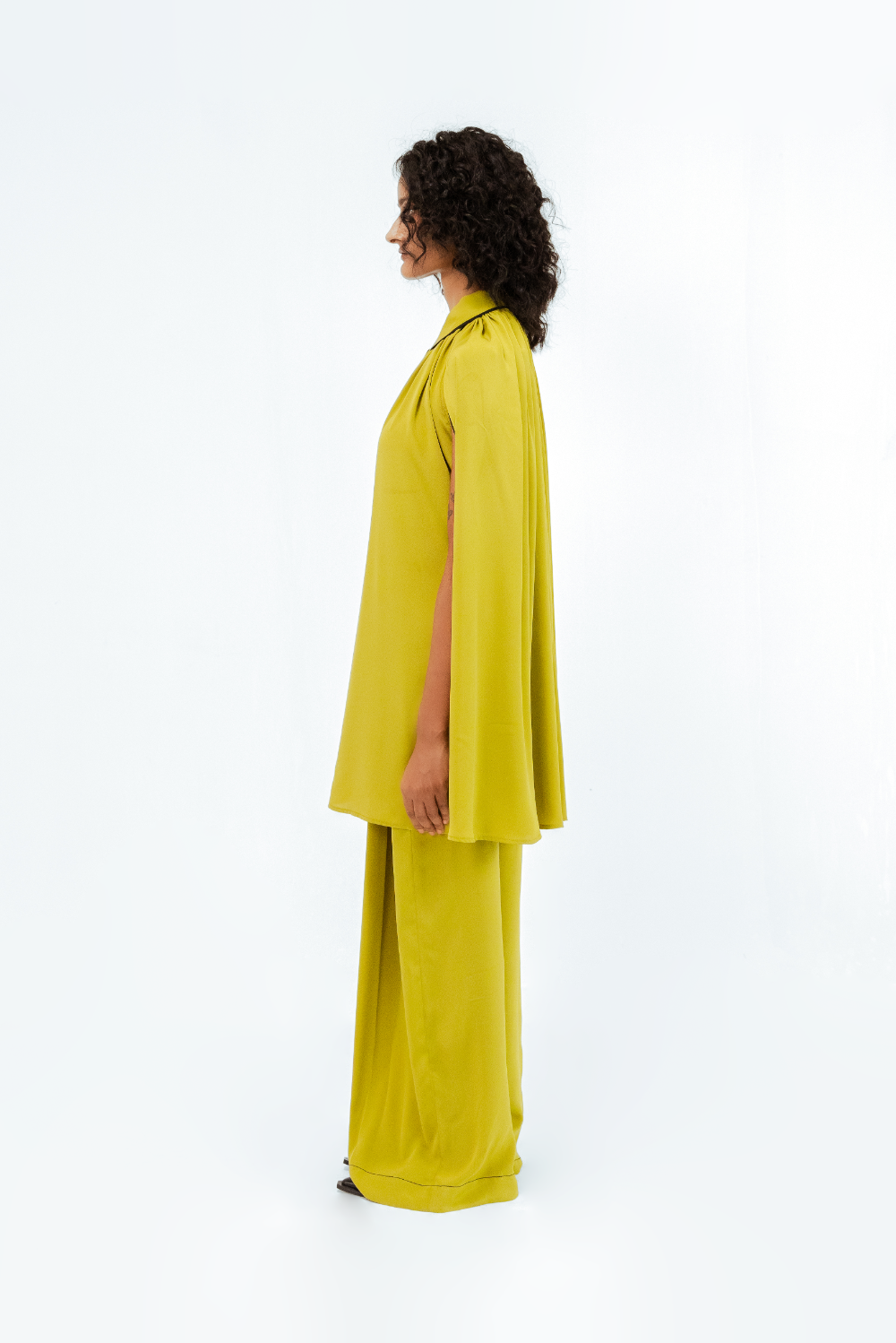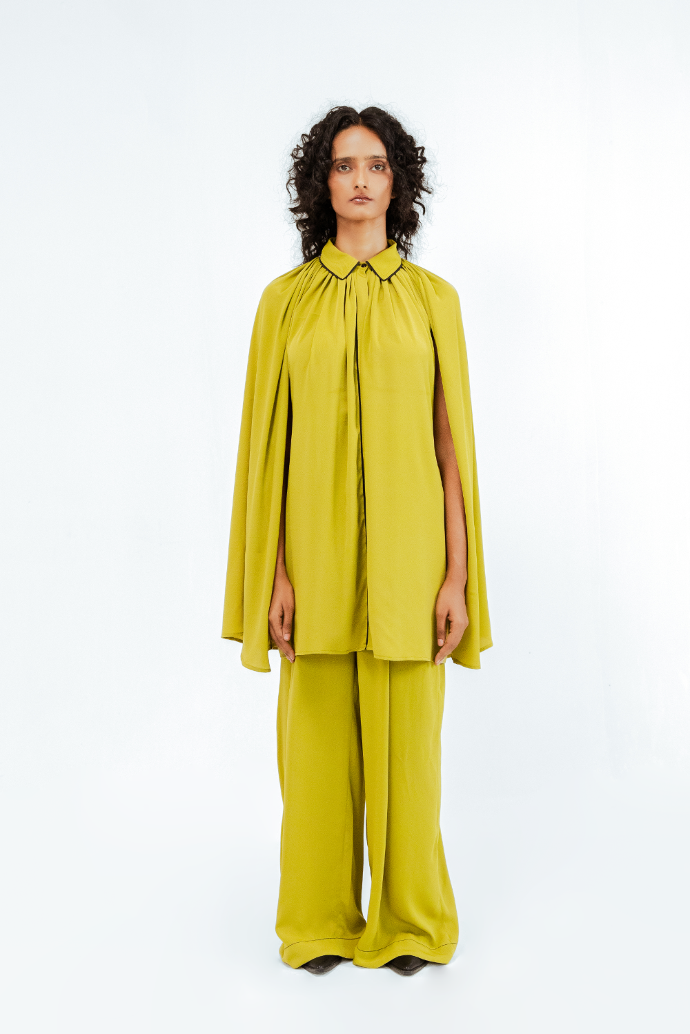 Crafted in crepe, this ensemble features a flowing cape-style shirt with soft gathers at the neckline and a structured shirt collar with subtle contrast piping. The sleeveless cape overlay creates a dramatic, sculptural silhouette that moves with ease. Model Height is 5'9". Model wears size S. Garment length is (Top 33")