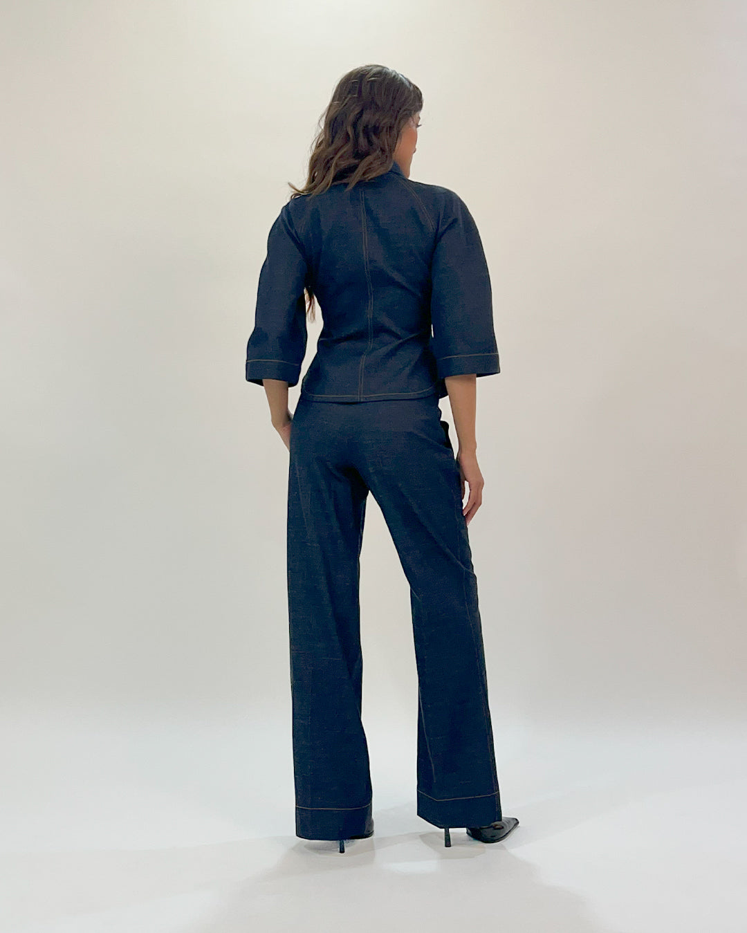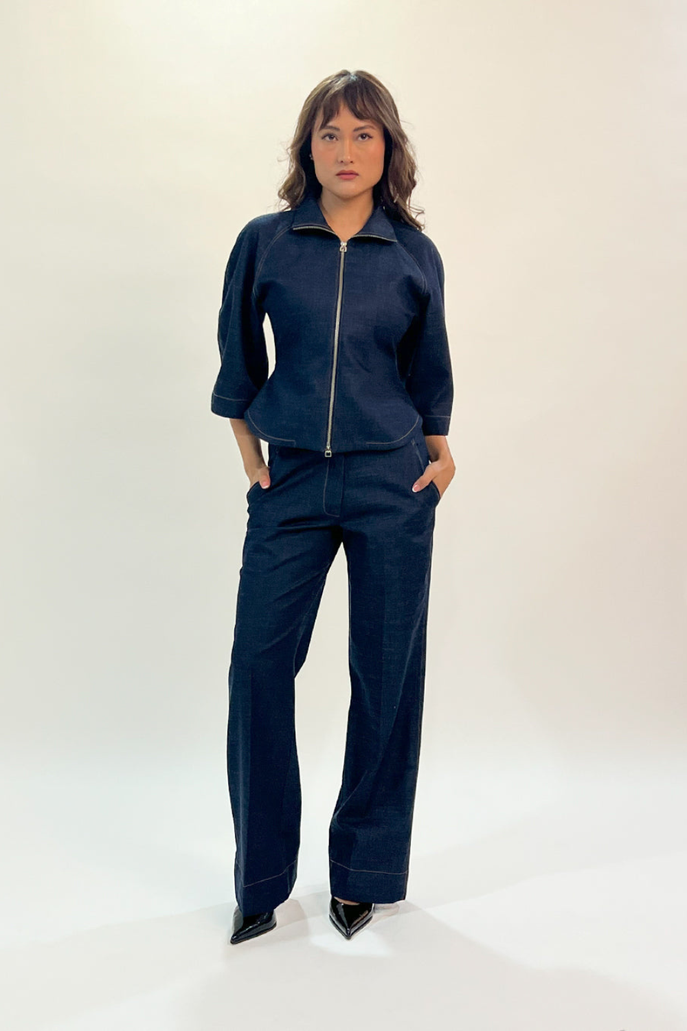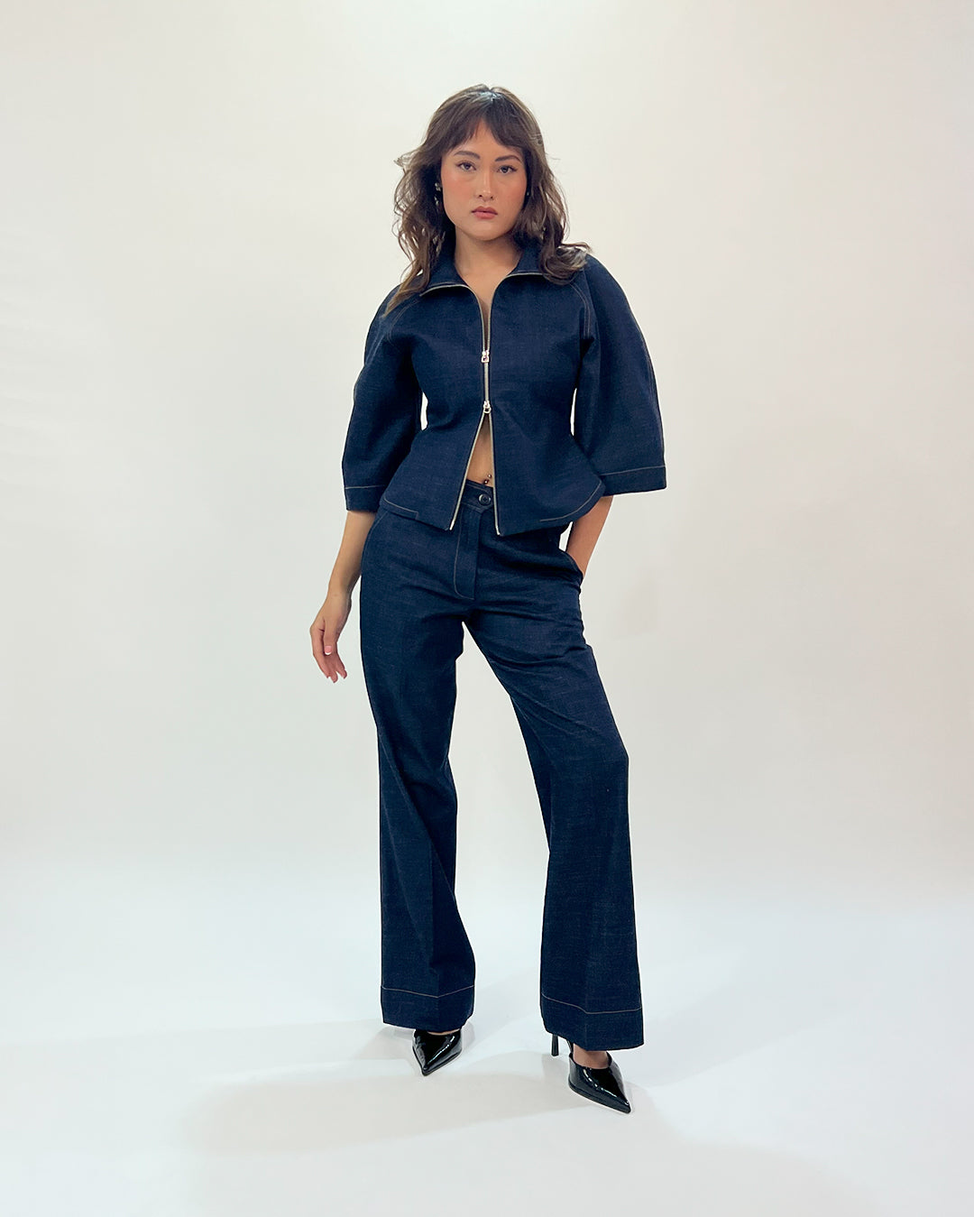 A modern take on classic style, this denim top features contrast top stitch and structured curve sleeves with two way full frontal zipper opening for adjustable styling. Fitted at waist, it flares out at the bottom creating a flattering and modern silhouette. Model wear size S model height is 5'8 garment length is 21"