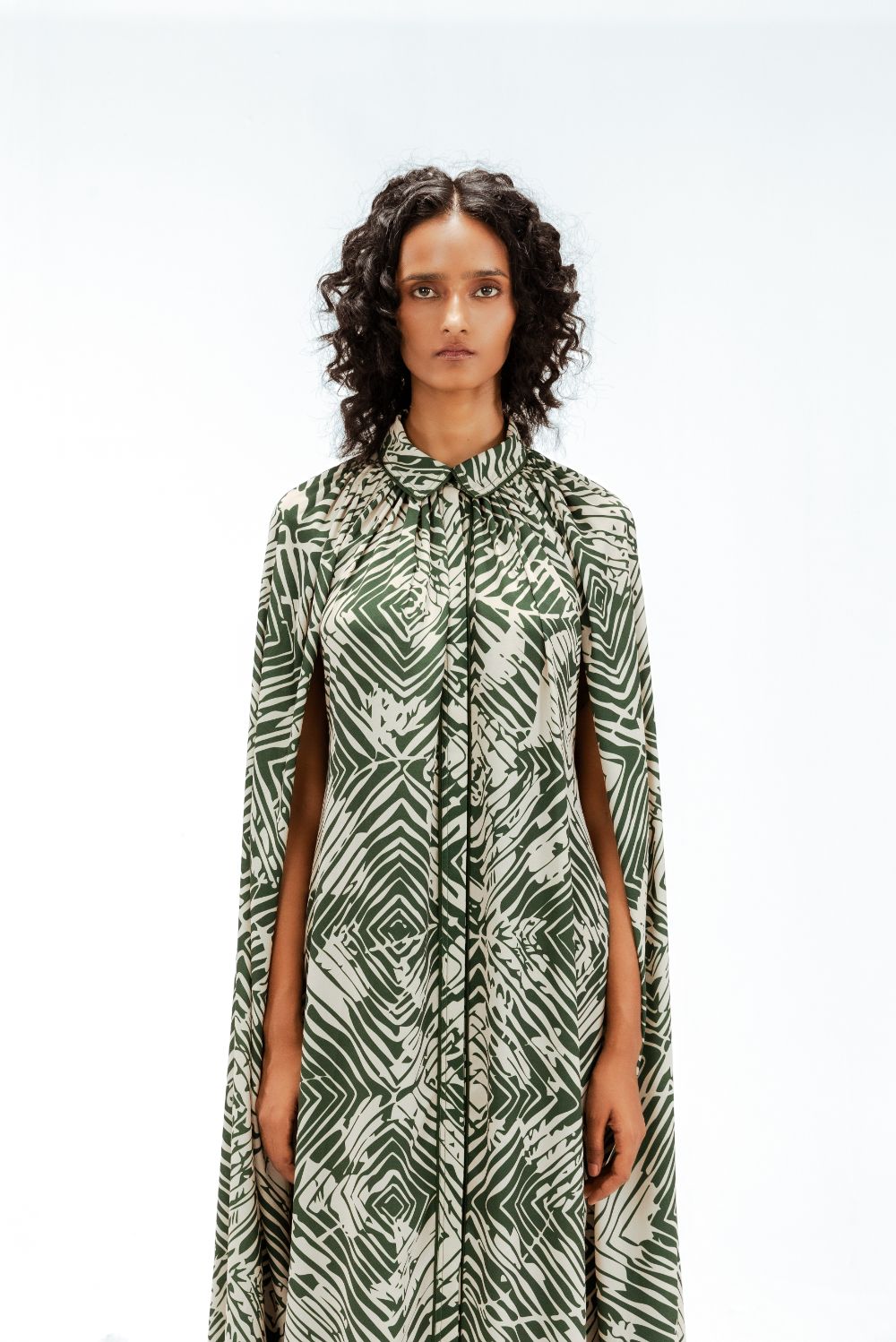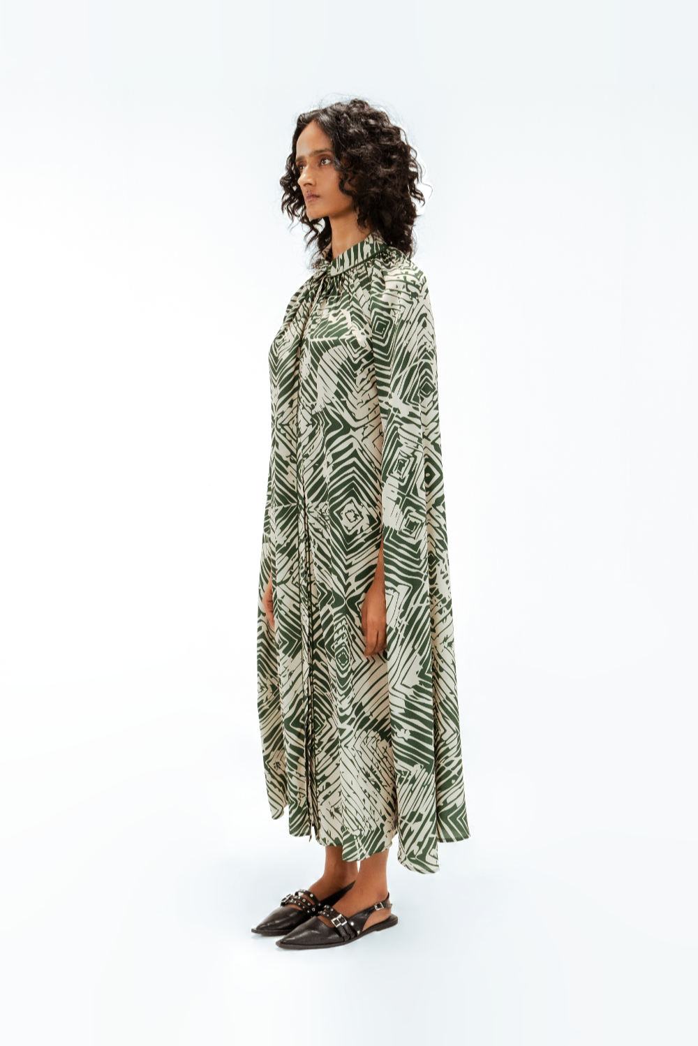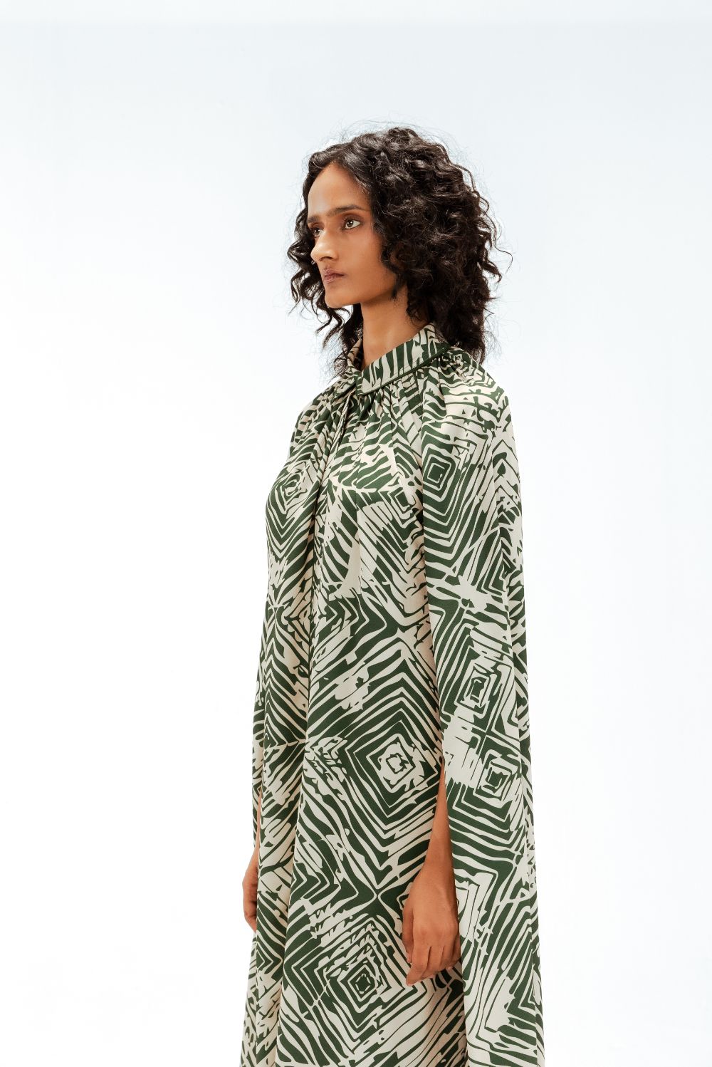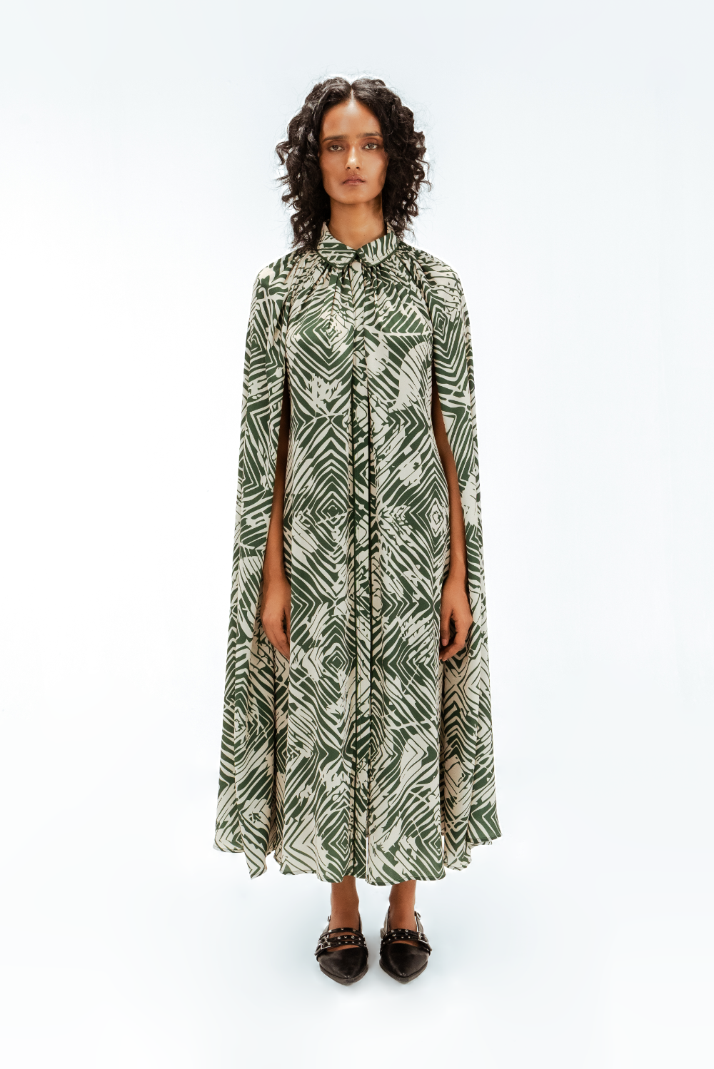 This cape shirt midi dress features the Florix print, blending geometric and floral motifs in a contemporary palette. Designed with a fluid cape overlay and tailored shirt collar, it is finished with delicate piping details that outline the silhouette, adding a subtle sense of structure to this effortlessly refined piece. Model Height is 5'9". Model wears size S. Garment length is 50"