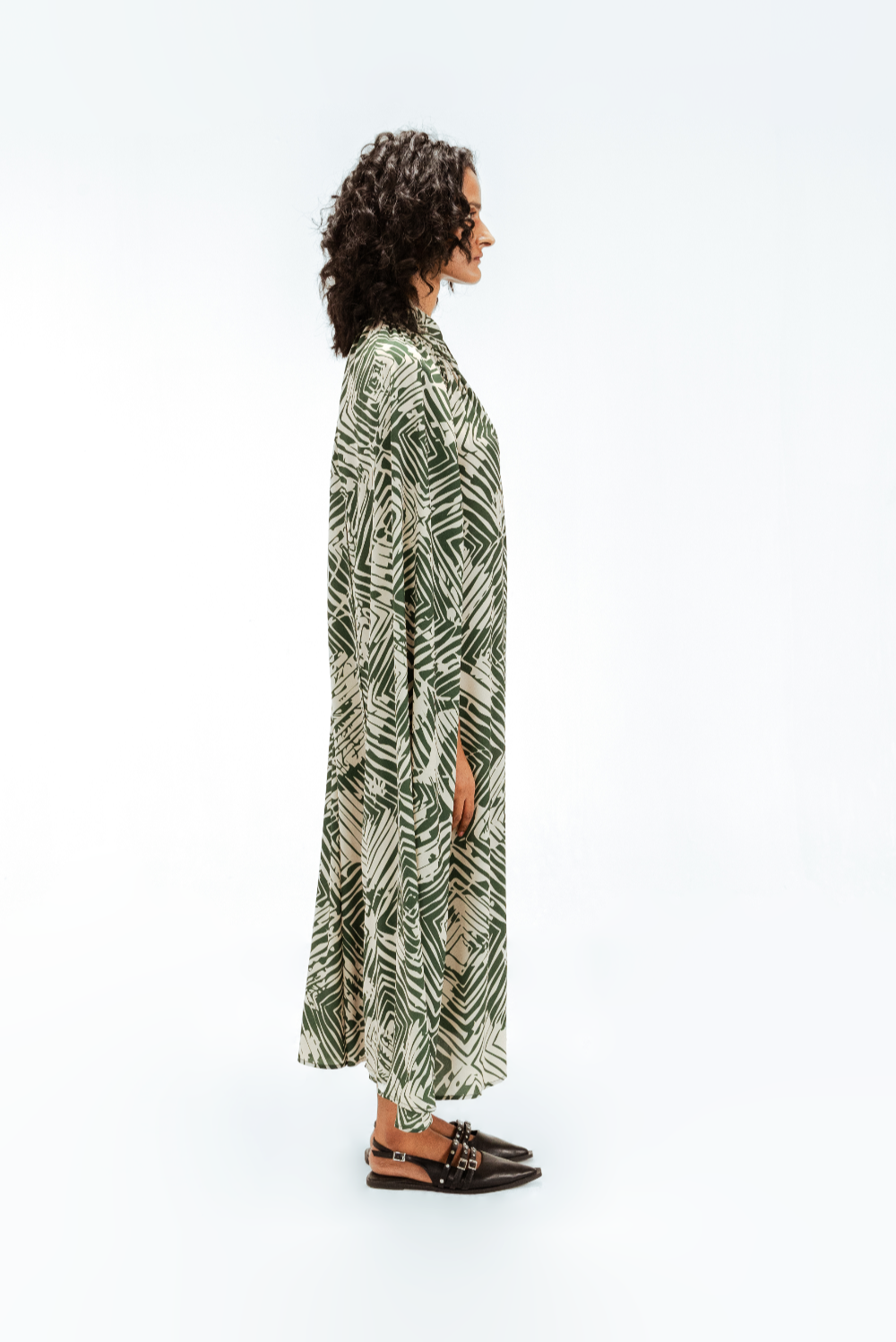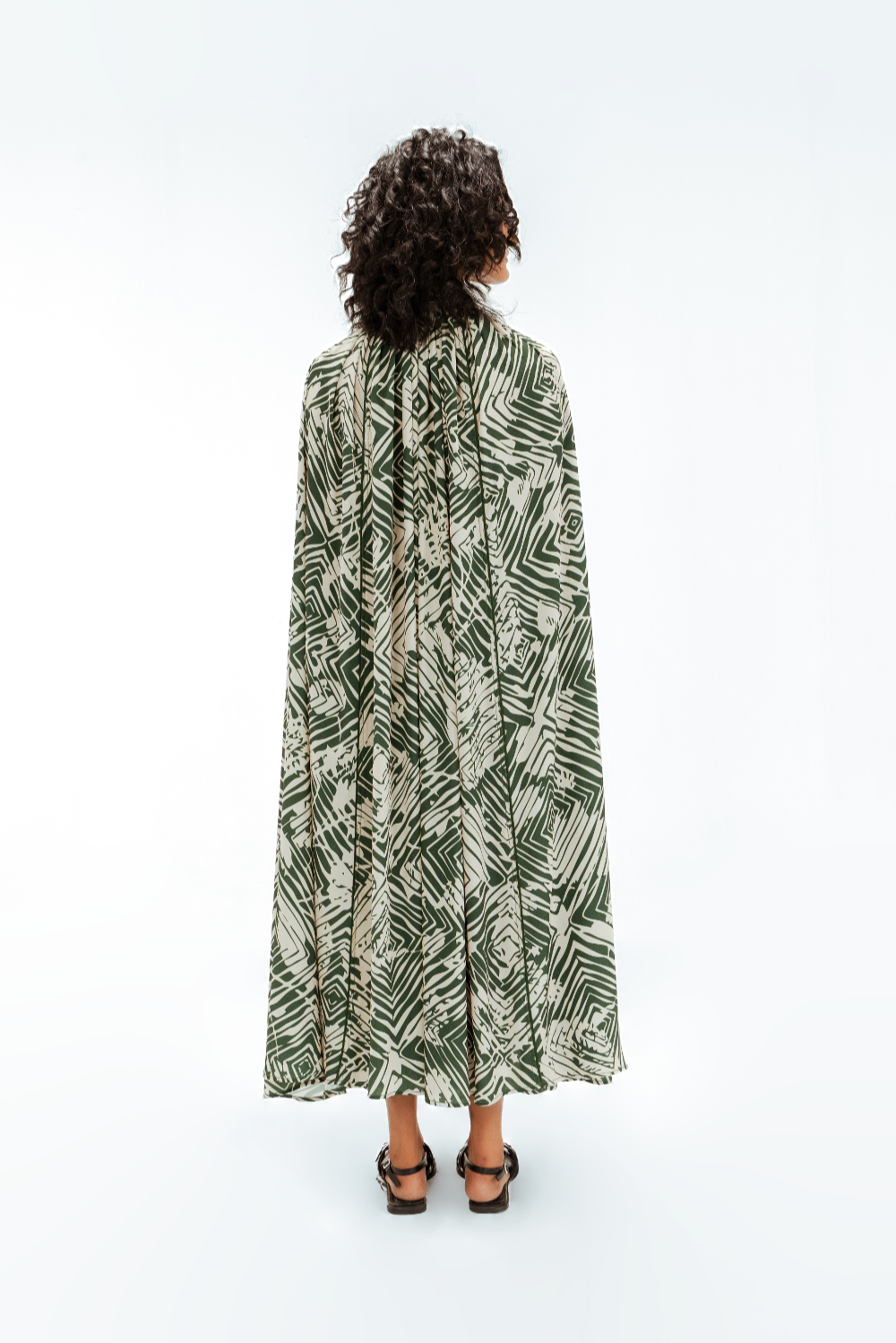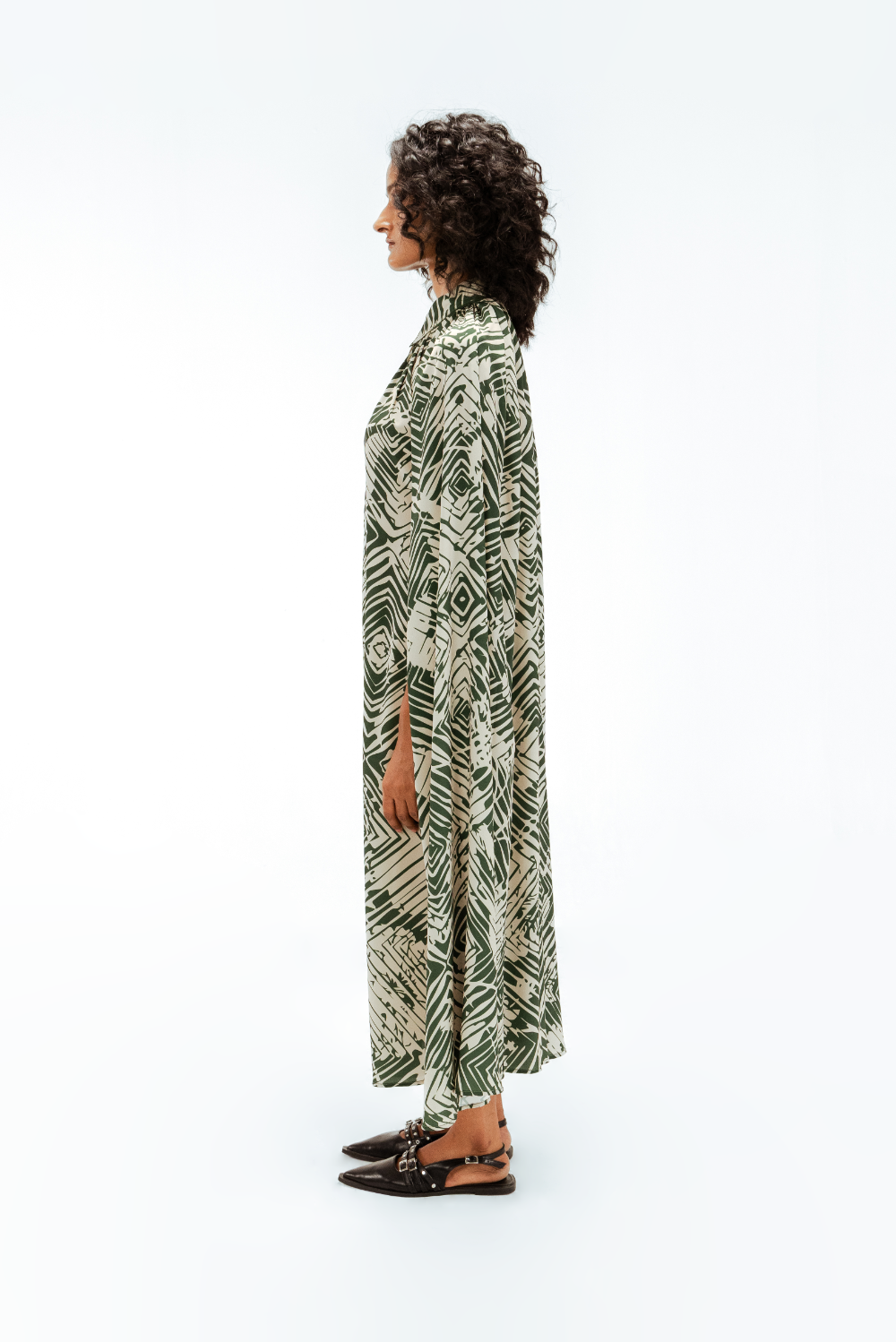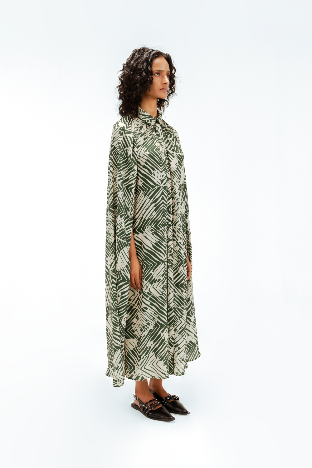 This cape shirt midi dress features the Florix print, blending geometric and floral motifs in a contemporary palette. Designed with a fluid cape overlay and tailored shirt collar, it is finished with delicate piping details that outline the silhouette, adding a subtle sense of structure to this effortlessly refined piece. Model Height is 5'9". Model wears size S. Garment length is 50"