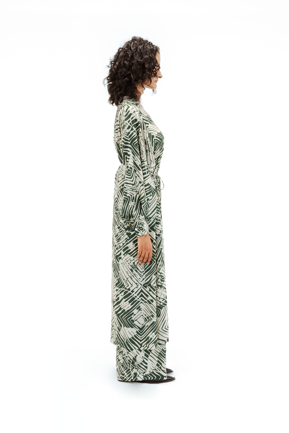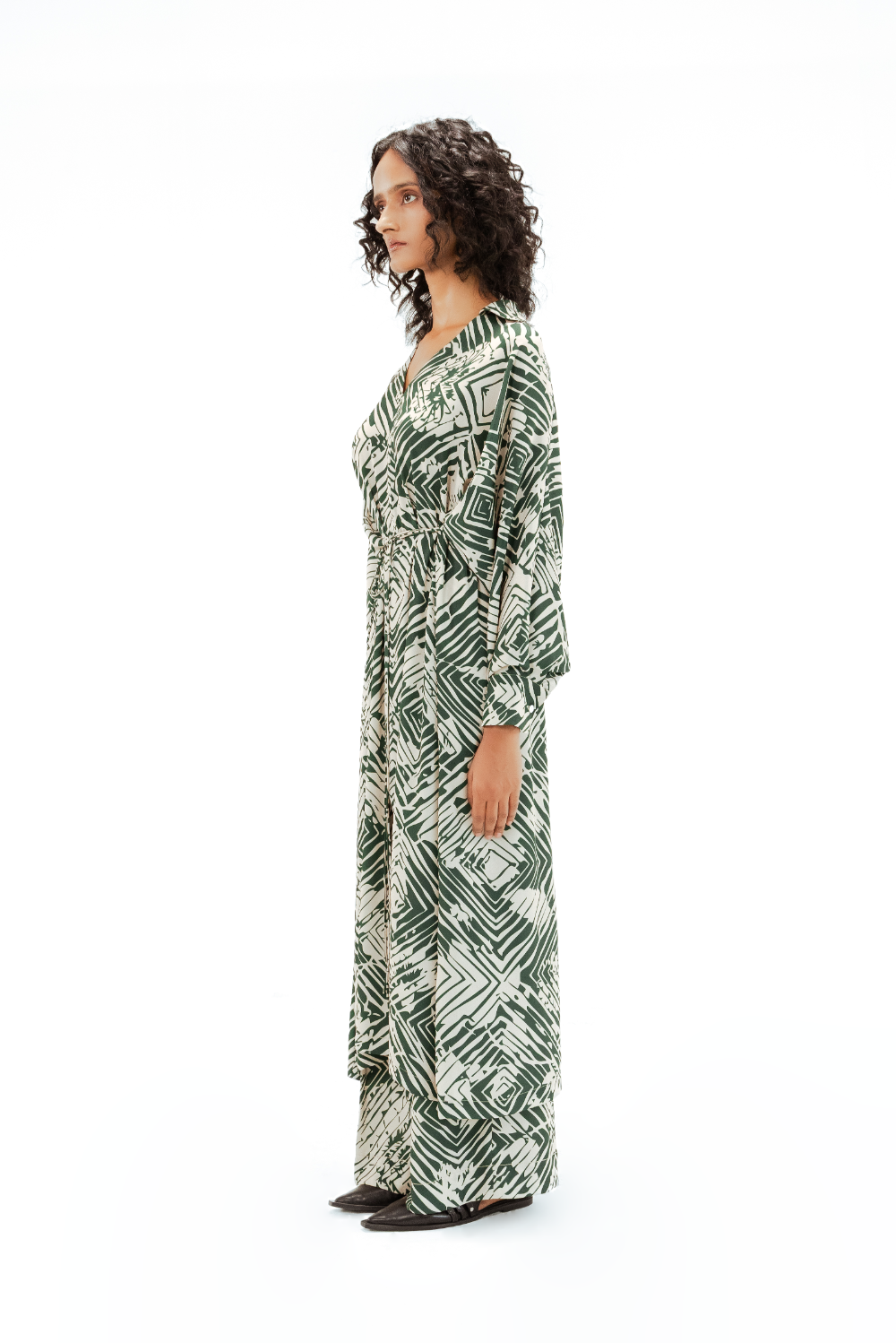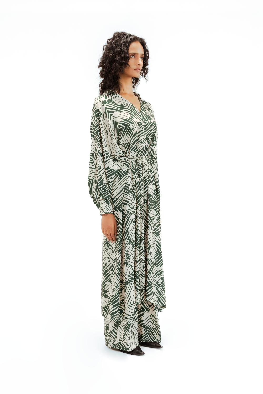 A two-piece co-ord set in soft crepe with florix print. The wrap-style top has a V-neckline, half collar and full sleeves with buttoned cuffs. A drawstring at the waist subtly defines the shape. Paired with wide-leg trousers that mirror the fluidity of a maxi silhouette. . Model Height is 5'9". Model wears size S. Garment length is (Top 50", Pants 42")