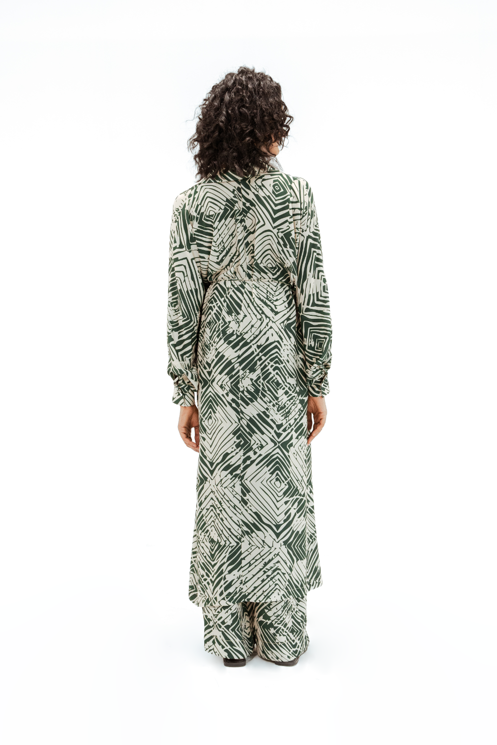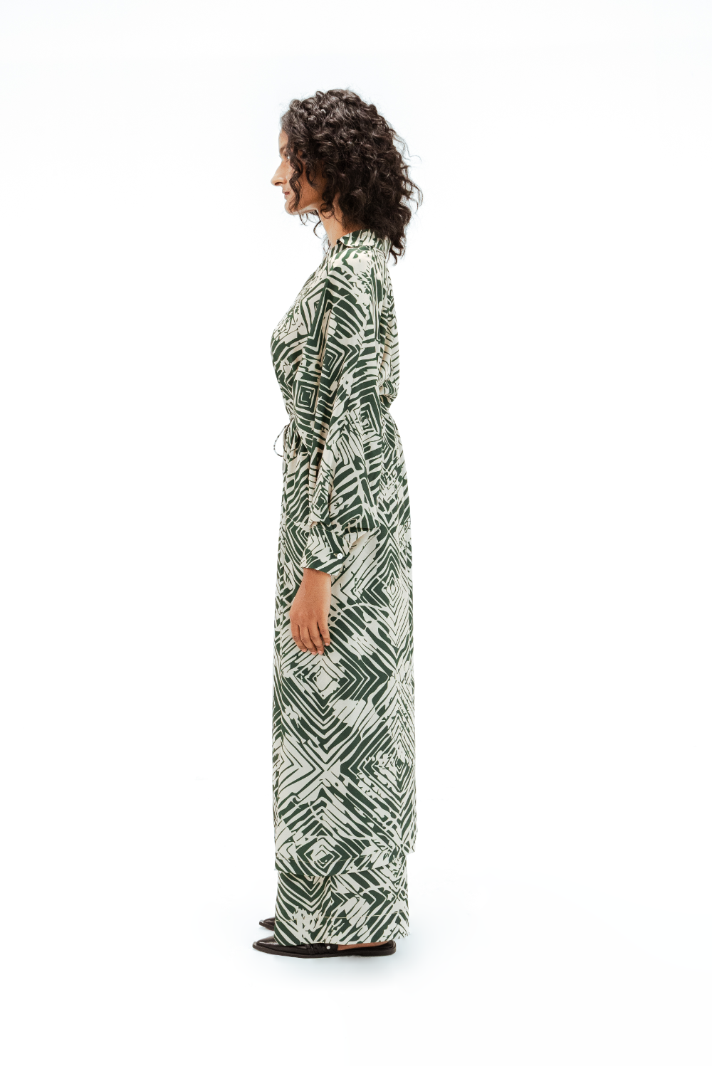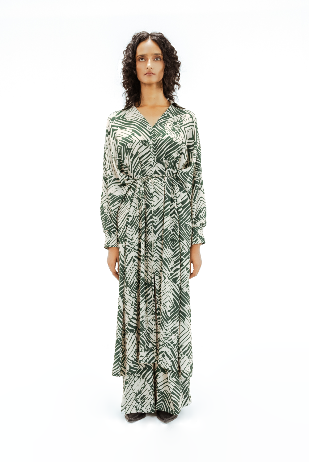 A two-piece co-ord set in soft crepe with florix print. The wrap-style top has a V-neckline, half collar and full sleeves with buttoned cuffs. A drawstring at the waist subtly defines the shape. Paired with wide-leg trousers that mirror the fluidity of a maxi silhouette. . Model Height is 5'9". Model wears size S. Garment length is (Top 50", Pants 42")