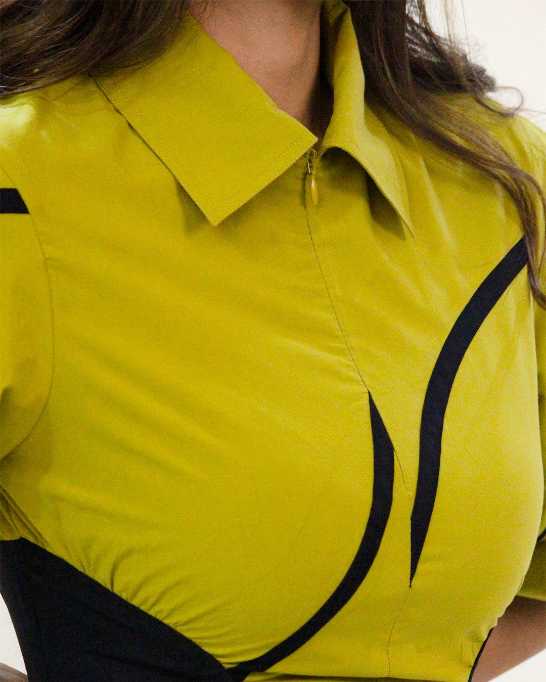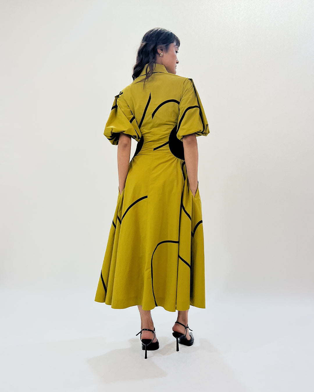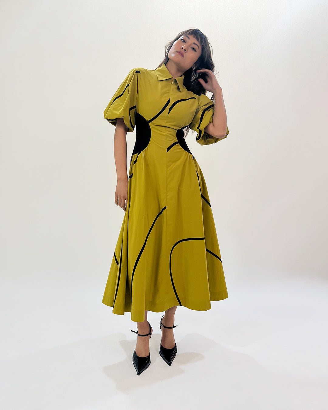 A timeless silhouette, this midi dress with contrast side panel and stem tapes is designed to be fitted through the waist and flare toward the hem. Complimented with inseam pockets at side, pleated puff sleeves and soft pleats through the skirt finished off with front and side conceal zip closure. Model wear size S model height is 5'8 garment length is 50"