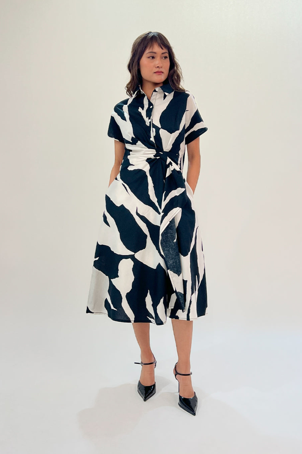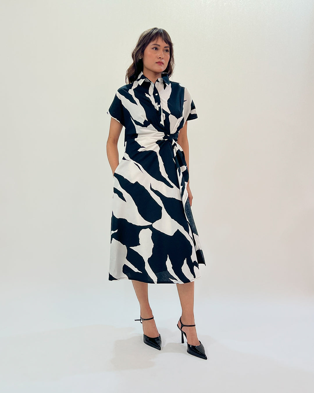 This drapped dress is cut in 100% Cotton highlighting it’s tailored asymmetrical drape at the waist with a cinched adjustable waist and a flared out bias cut hemline Model wear size S model height is 5'8 garment length is 46"