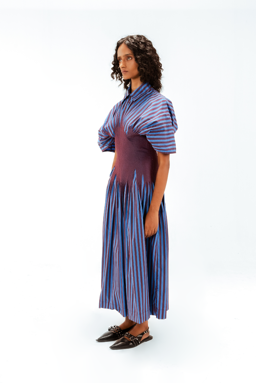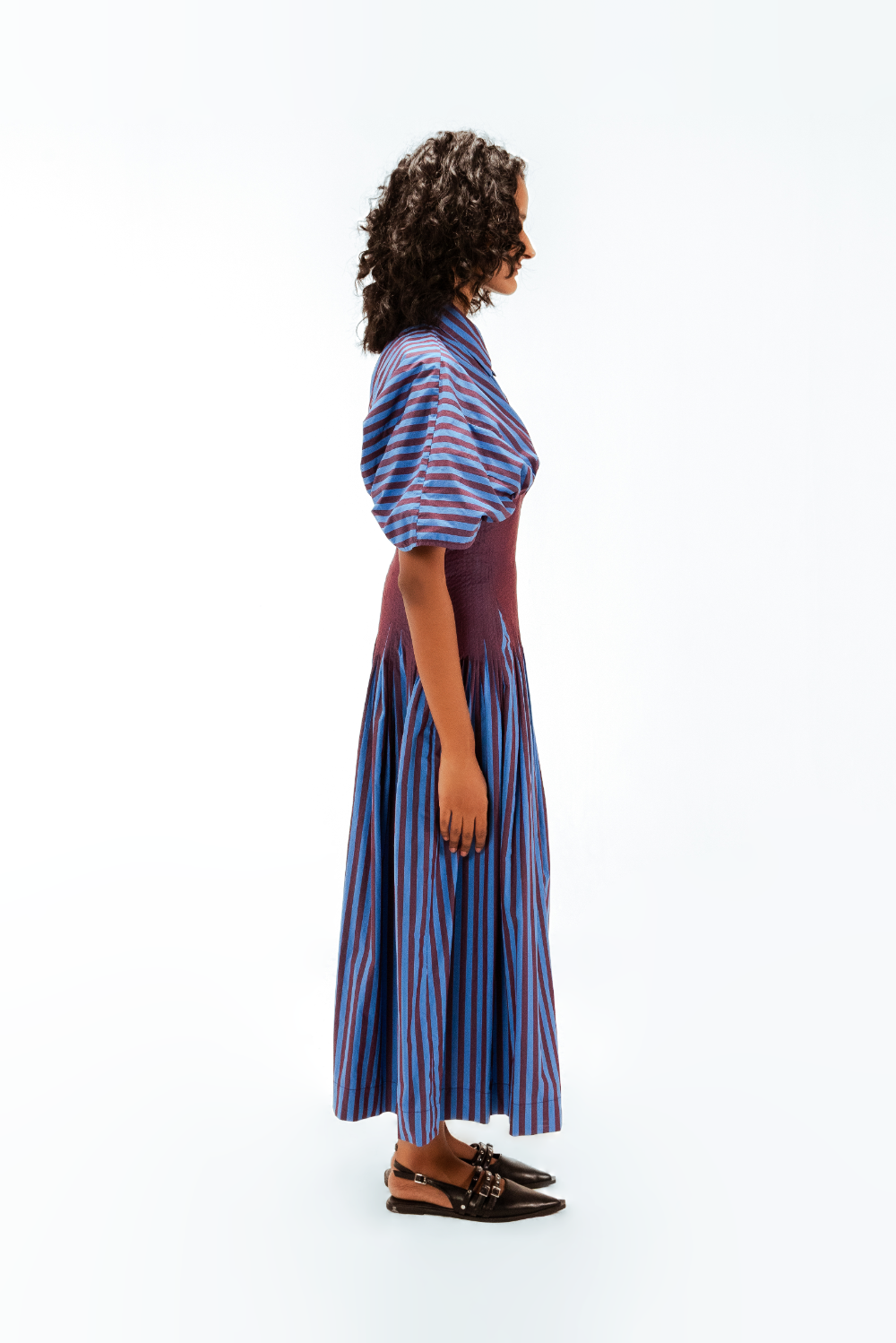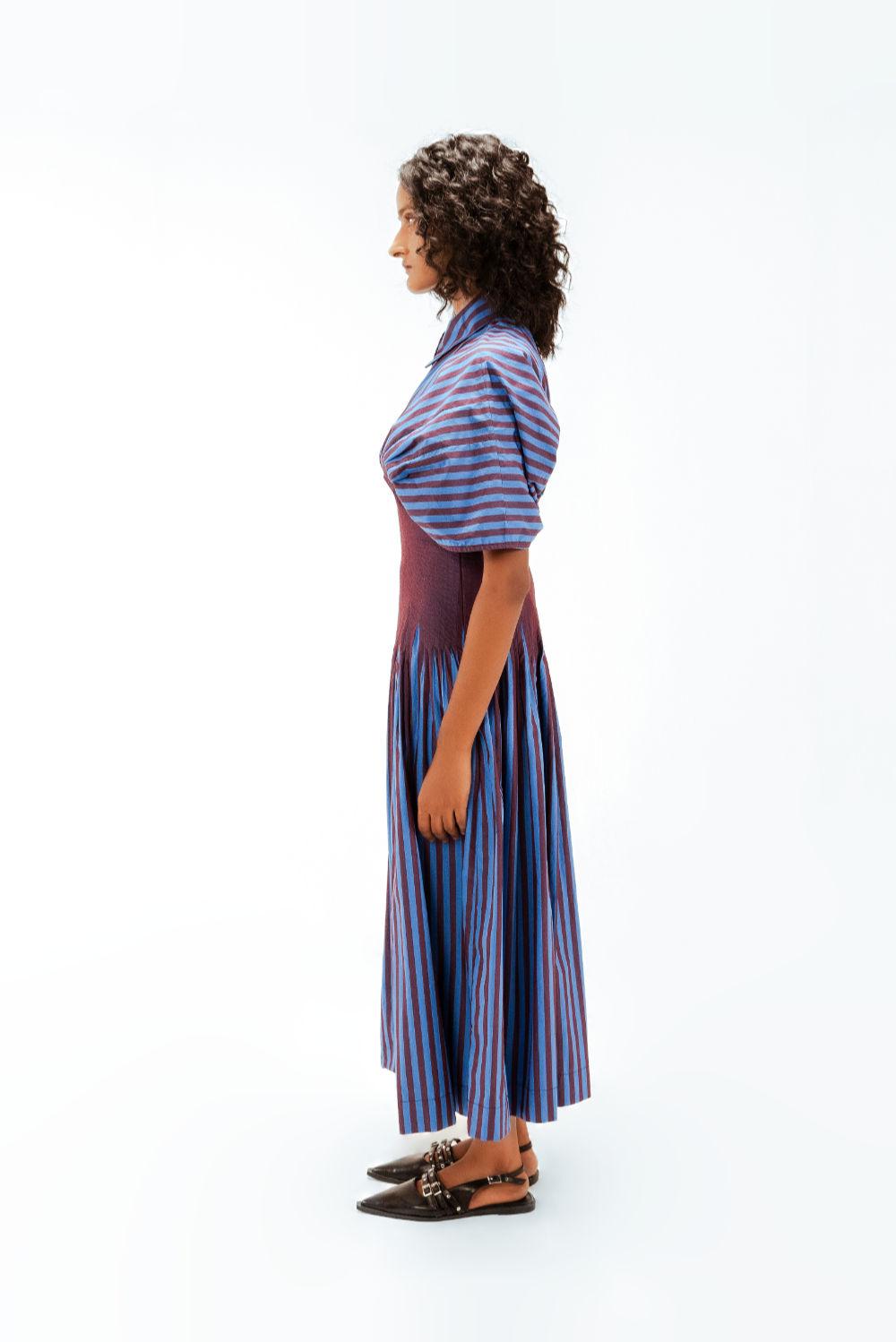 This cotton striped midi dress redefines structure with ease. Stripes are artfully gathered at the waist to create a flattering corset effect, while dropped shoulder balloon sleeves add a soft, voluminous contrast. Model Height is 5'9". Model wears size S. Garment length is 50"
