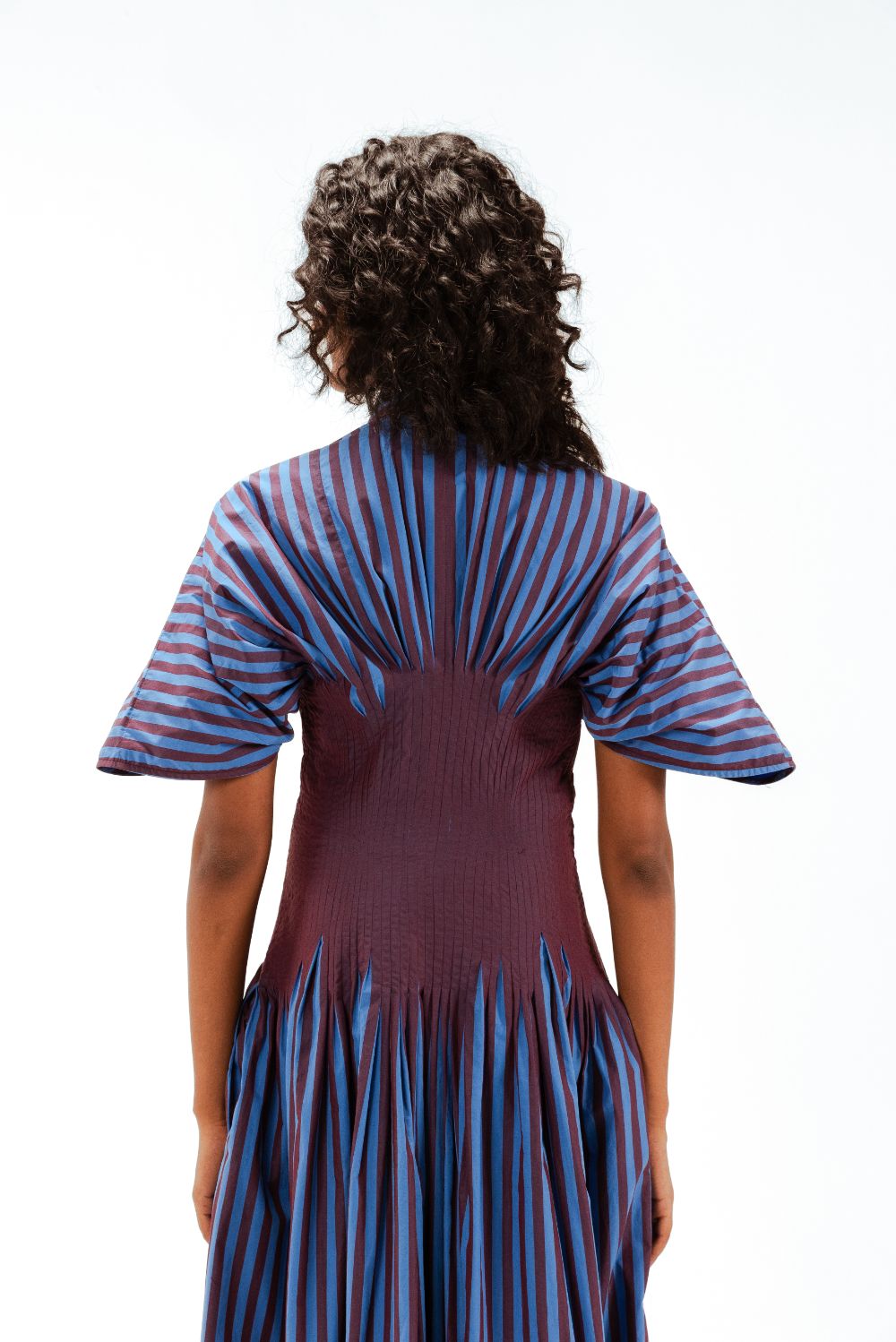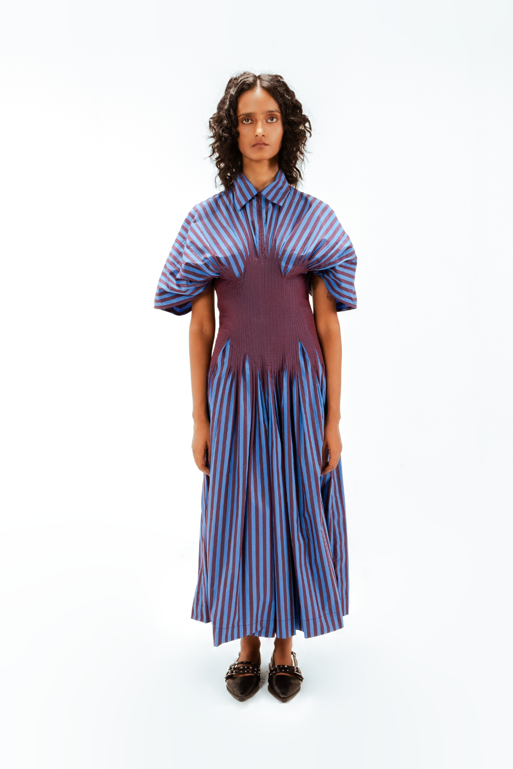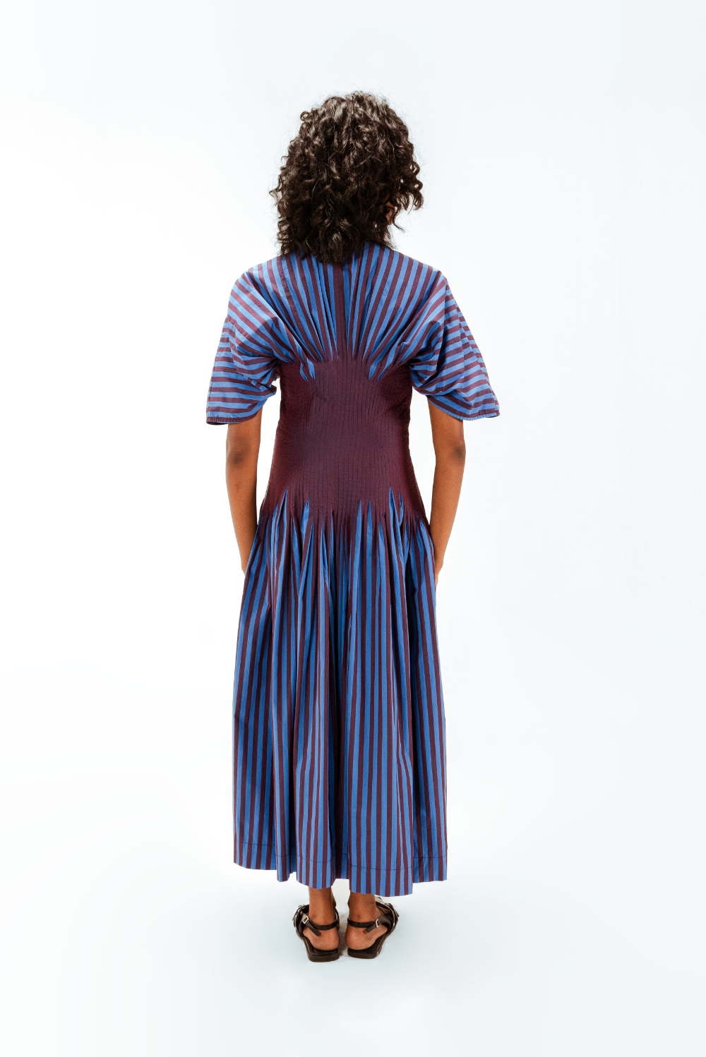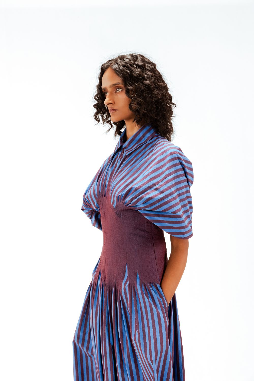This cotton striped midi dress redefines structure with ease. Stripes are artfully gathered at the waist to create a flattering corset effect, while dropped shoulder balloon sleeves add a soft, voluminous contrast. Model Height is 5'9". Model wears size S. Garment length is 50"