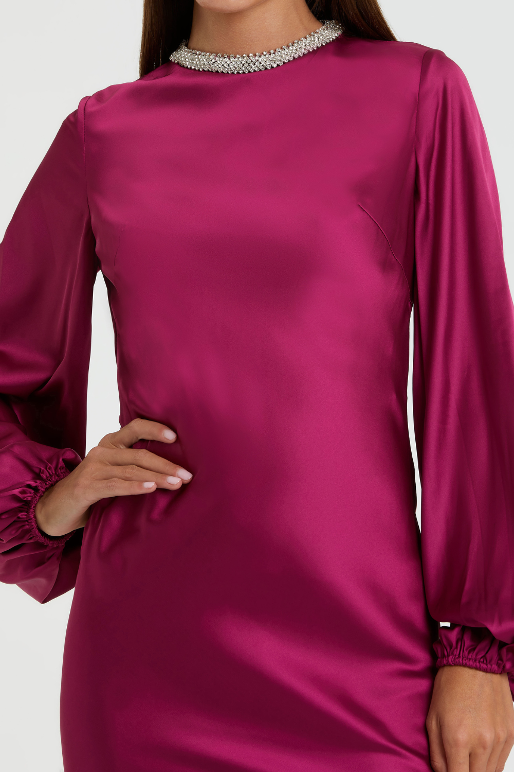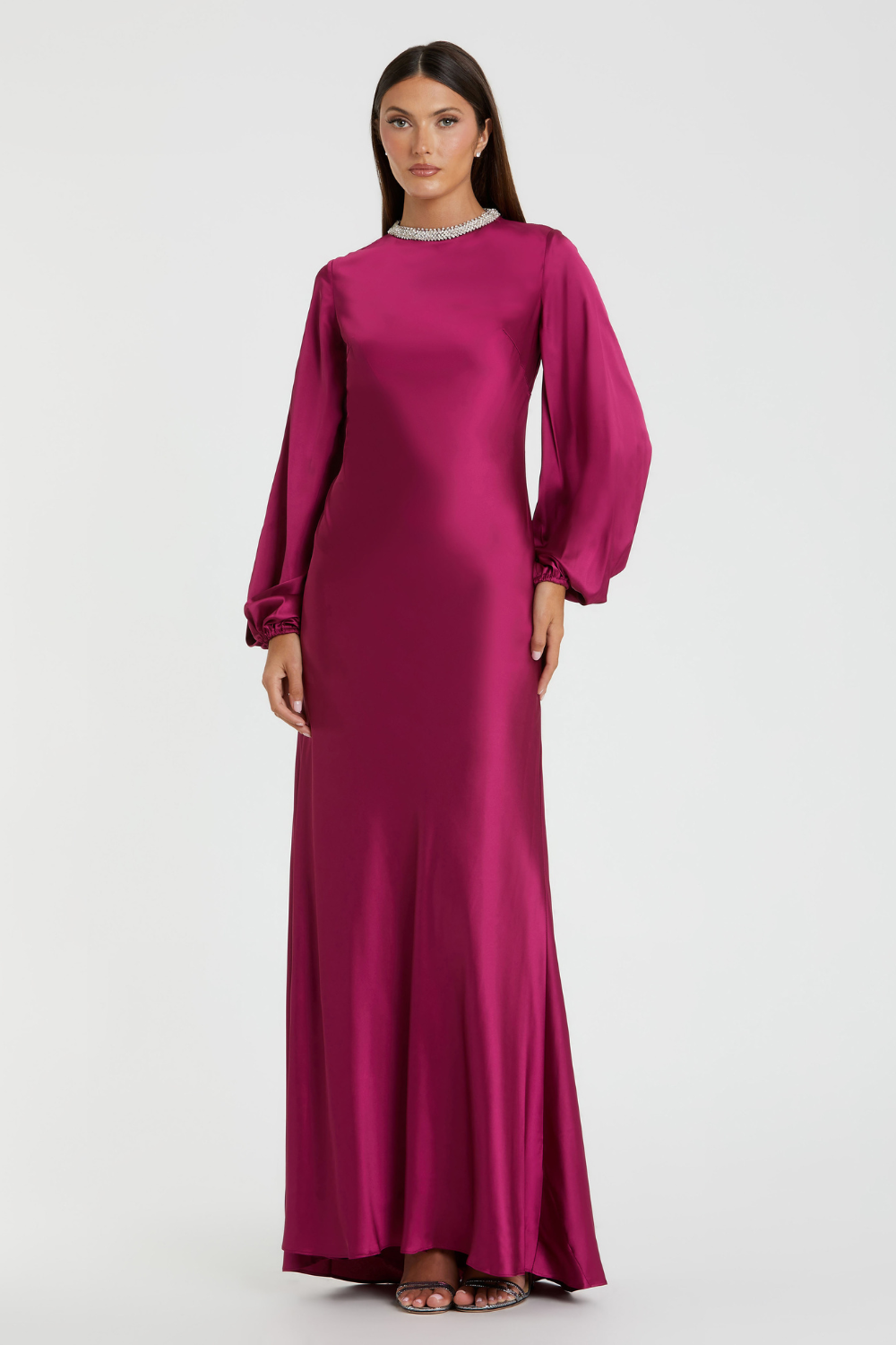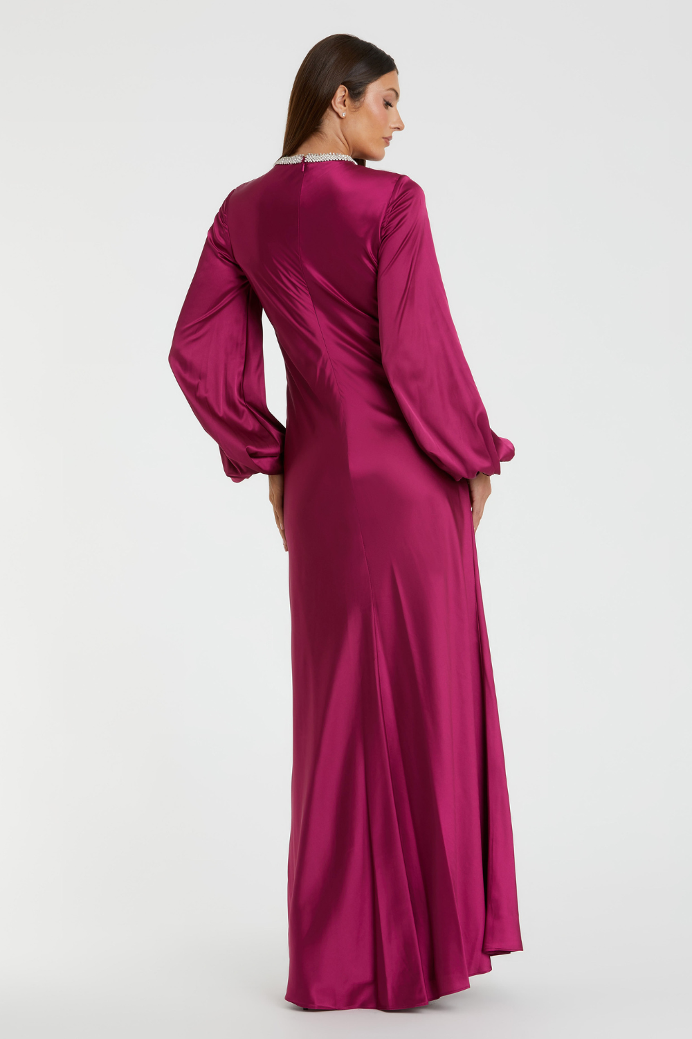 Purple Beaded High Neck Bishop Sleeve Satin Gown