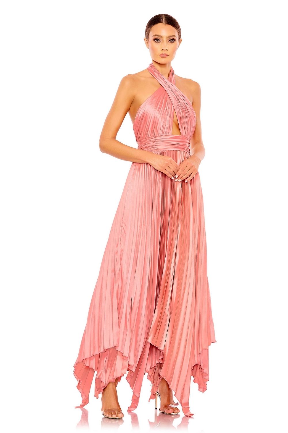 Founded in Chicago by designer Mac Duggal, the label has become a red-carpet language of its own—seen at the Oscars, the Emmys, the Met-adjacent soirées, and the kind of celebrations where the lighting is soft, the music is warm, and the dress needs no introduction. Known for sculpted drapes, sequined textiles, and silhouettes that photograph with cinematic clarity, Mac Duggal designs gowns that balance drama with precision.