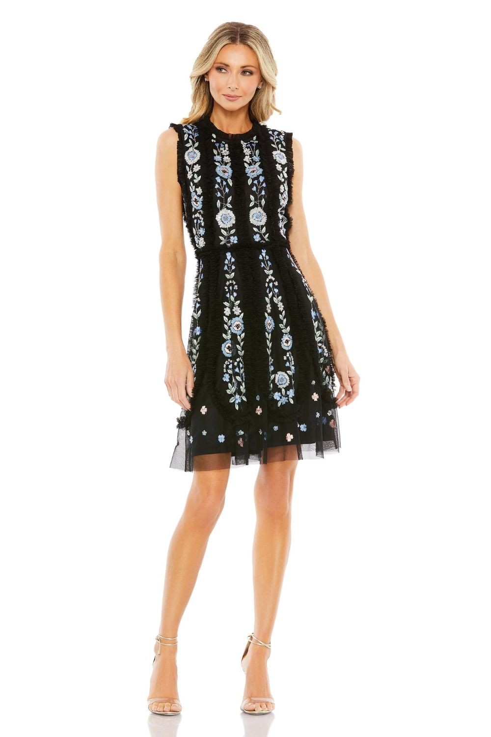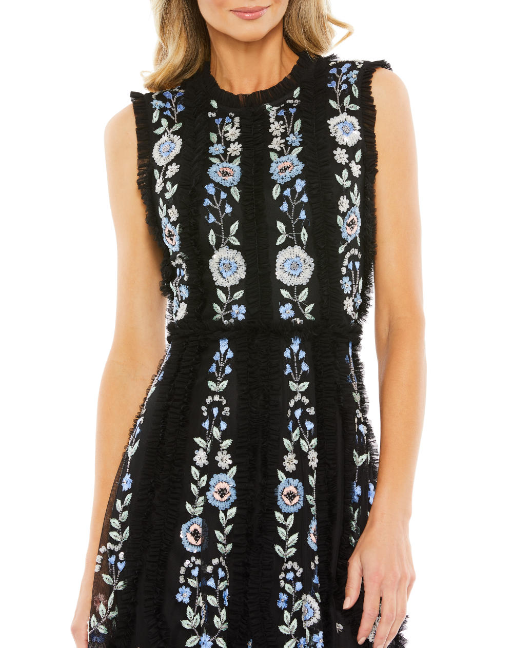 - Floral embroidery accented by hand stitched sequins