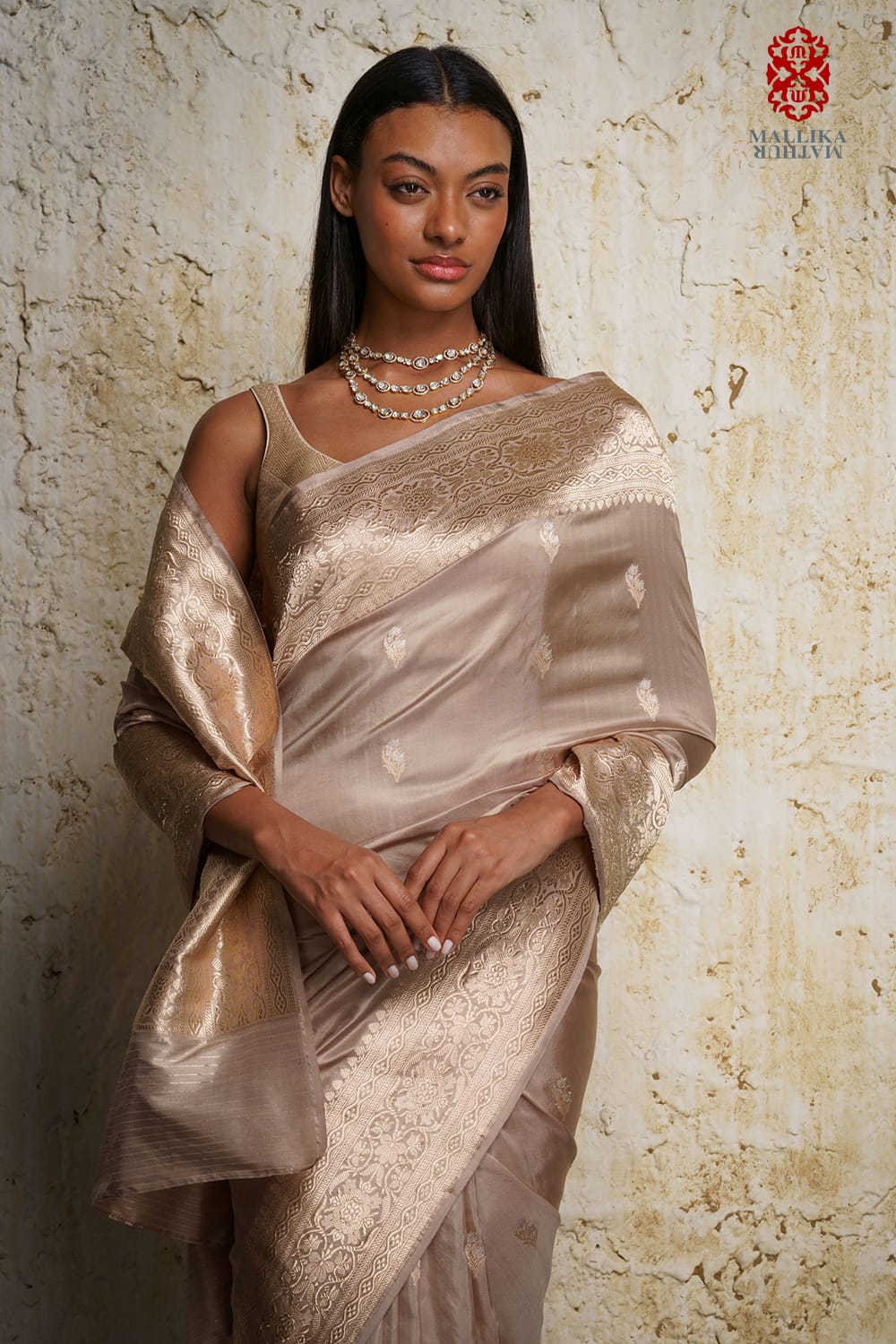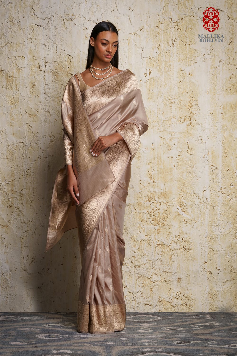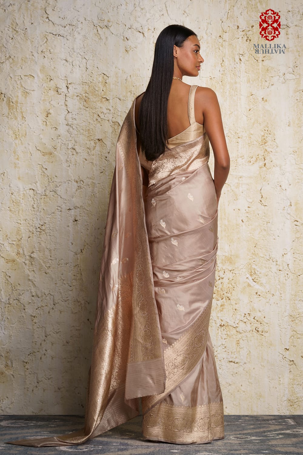 'Alfi buti' katan silk banarasi sari champagne gold colour handwoven in a traditional and intricate border. Miniature 'Alfi' butis adorn the sari evived from an antique design. It is paired with a sleeveless ganga jamuna zari blouse.